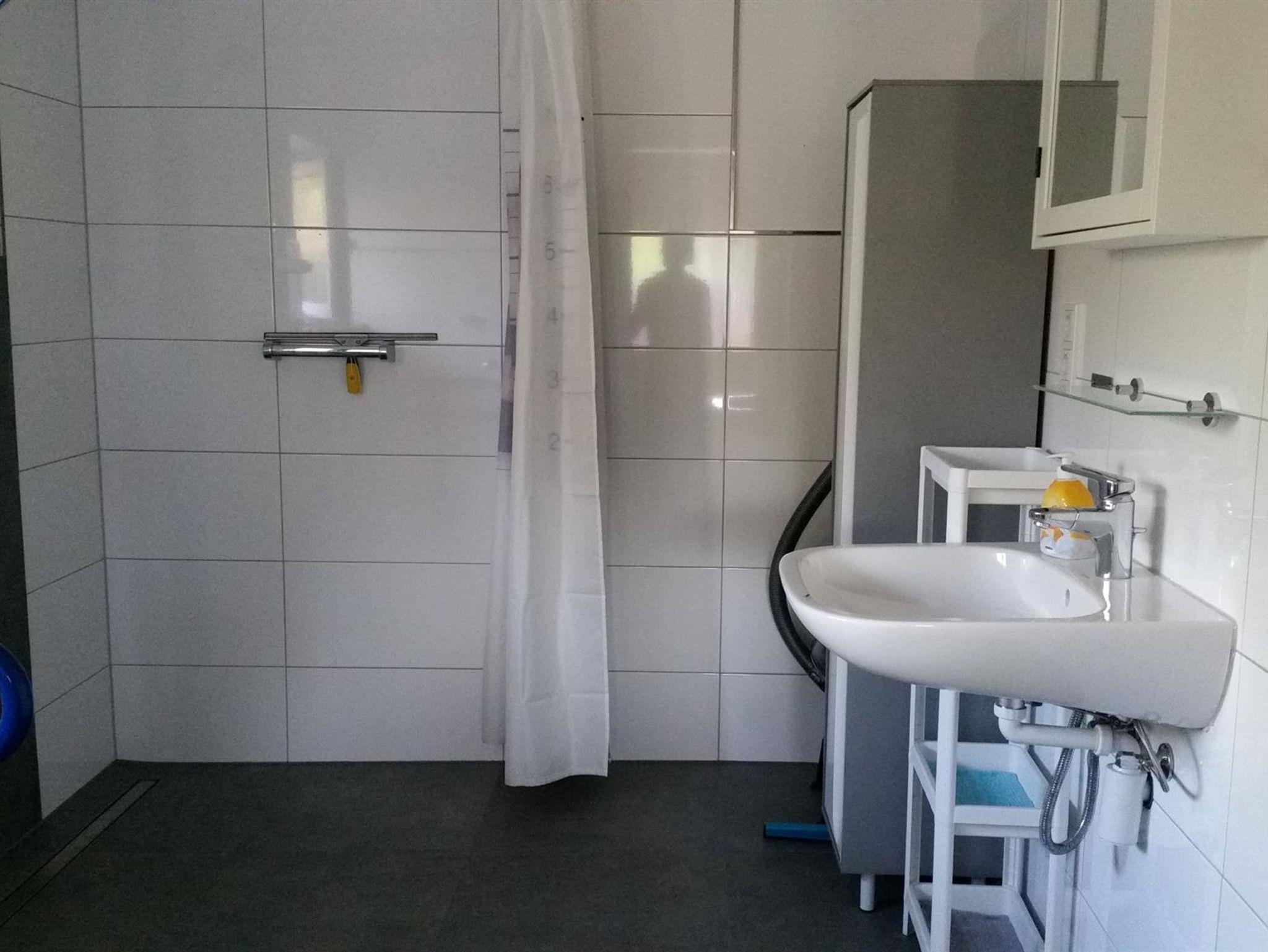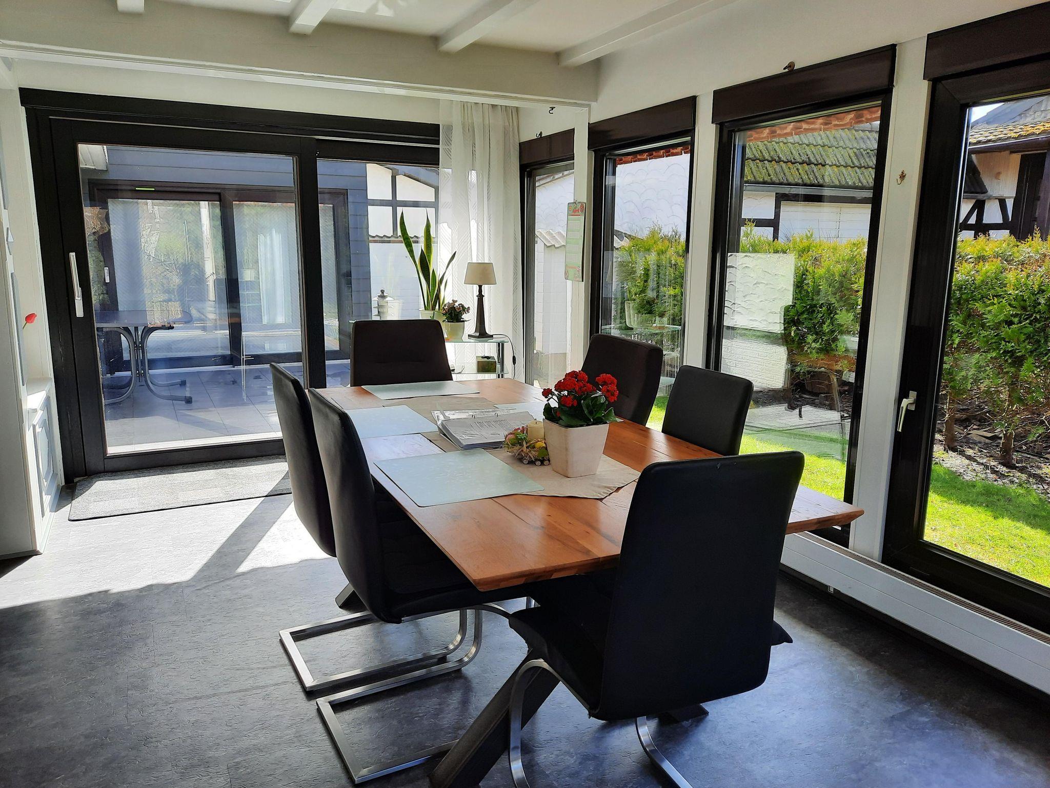 Das Ferienhaus ist ausgestattet mit: Wohnbereich mit Wohnecke mit TV, Blu Ray Player und Internetradio. Essbereich für alle Personen im Wintergarten. Voll ausgestatteter Küche mit Backofen, Herd, Geschirrspüler, Kühlschrank, Mikrowelle, Kaffeemaschine, Toaster und Wasserkocher. 3 Schlafbereiche, ein Schlafzimmer im Obergeschoss mit Doppelbett (180x200), ein Schlafzimmer im Erdgeschoss mit Doppelbett (180x200) und einem Pflegebett (90x200) und ein Schlafbereich mit Schlafcouch für eine Person im Wintergarten. Dieser kann mit elektrischen Jalousien verdunkelt werden. Im Obergeschoss finden Sie ein ein Bad mit Doppelwaschbecken, zusätzlich auch ein rollstuhlgerechtes Bad im Erdgeschoss mit Waschtisch, Dusche und WC und ein Bad mit Dusche und WC. Auf der gemütlichen Terrasse mit Terrassenmöbeln, kann man den Urlaubsabend sehr schön ausklingen lassen. Über den barrierefreien Nebeneingang ist ein rollstuhlgerechtes Duschbad und ein Schlafzimmer mit einem Pflegebett (90x200) mit Bettgalgen und einem Doppelbett (180x200) zu erreichen. Die Durchgangsbreite der Türen des Verbindungsraumes zwischen Bad/Eingangsbereich und Schlafraum beträgt 84 cm. Der Rollstuhlfahrer gelangt über die Terrasse zwischen Schlafbereich und Wintergarten in den Wohnbereich. Da der Küchenbereich 3 Stufen höher als der Wohnbereich ist, benötigt der Rollstuhlfahrer eine Begleitperson.