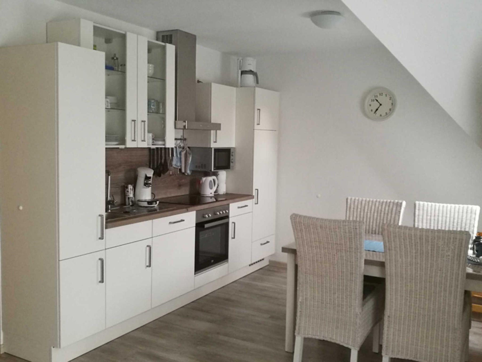Die moderne Küche ist mit Gefrierfach, Kühlschrank, Mikrowelle, Wasserkocher, Backofen, Spülmaschine, Kaffee- und Senseo-Maschine ausgestattet. Der helle, bei Bedarf abzudunkelnde, Essbereich bietet genügend Platz für gemeinsame Mahlzeiten oder Spieleabende.