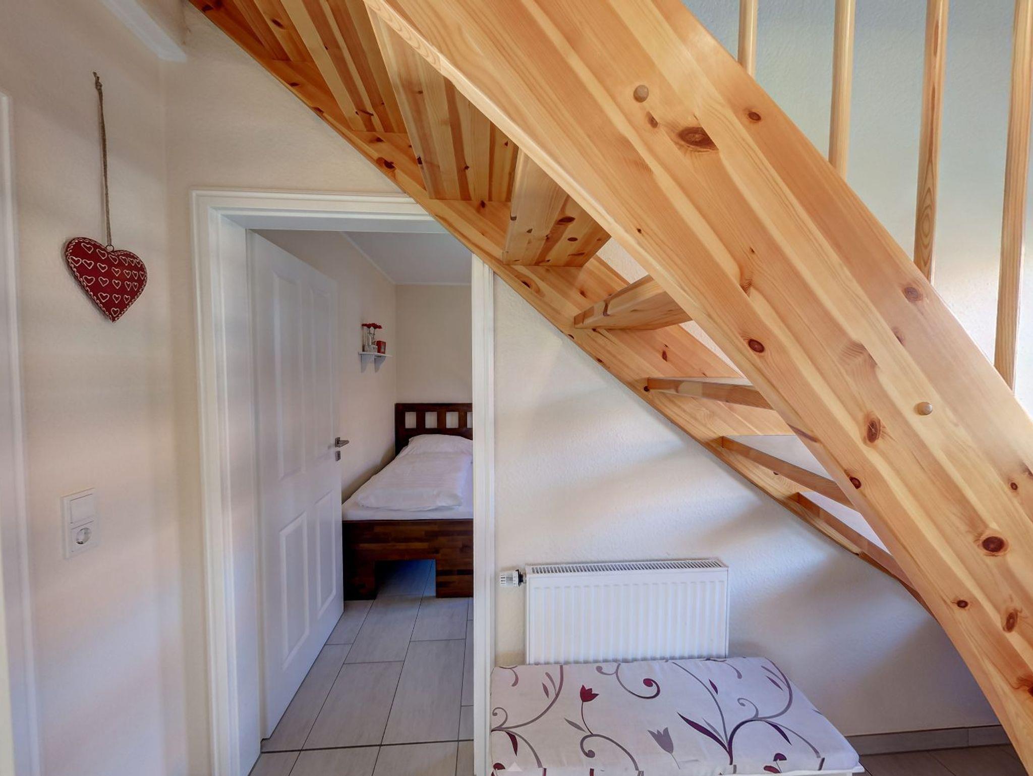 Über die Holztreppe im Flur gelnagen Sie in das Obergeschoss des Hauses.Hier befinden sich zwei weitere Schlafzimmer: ein Kinderzimmer mit zwei Einzelbetten und einem kleinen Schreibtisch, sowie ein Schlafzimmer mit Doppelbett und einer Kommode.