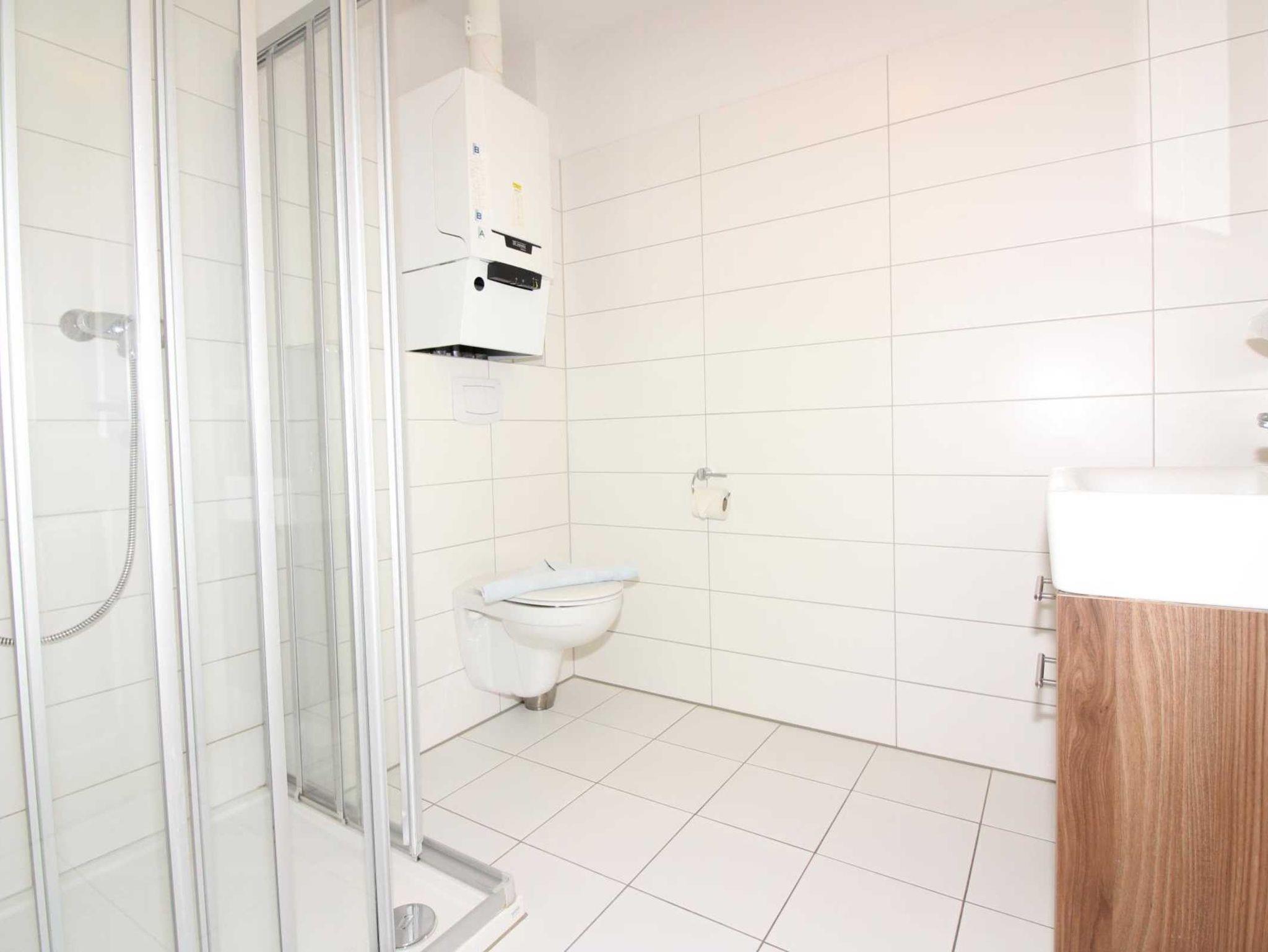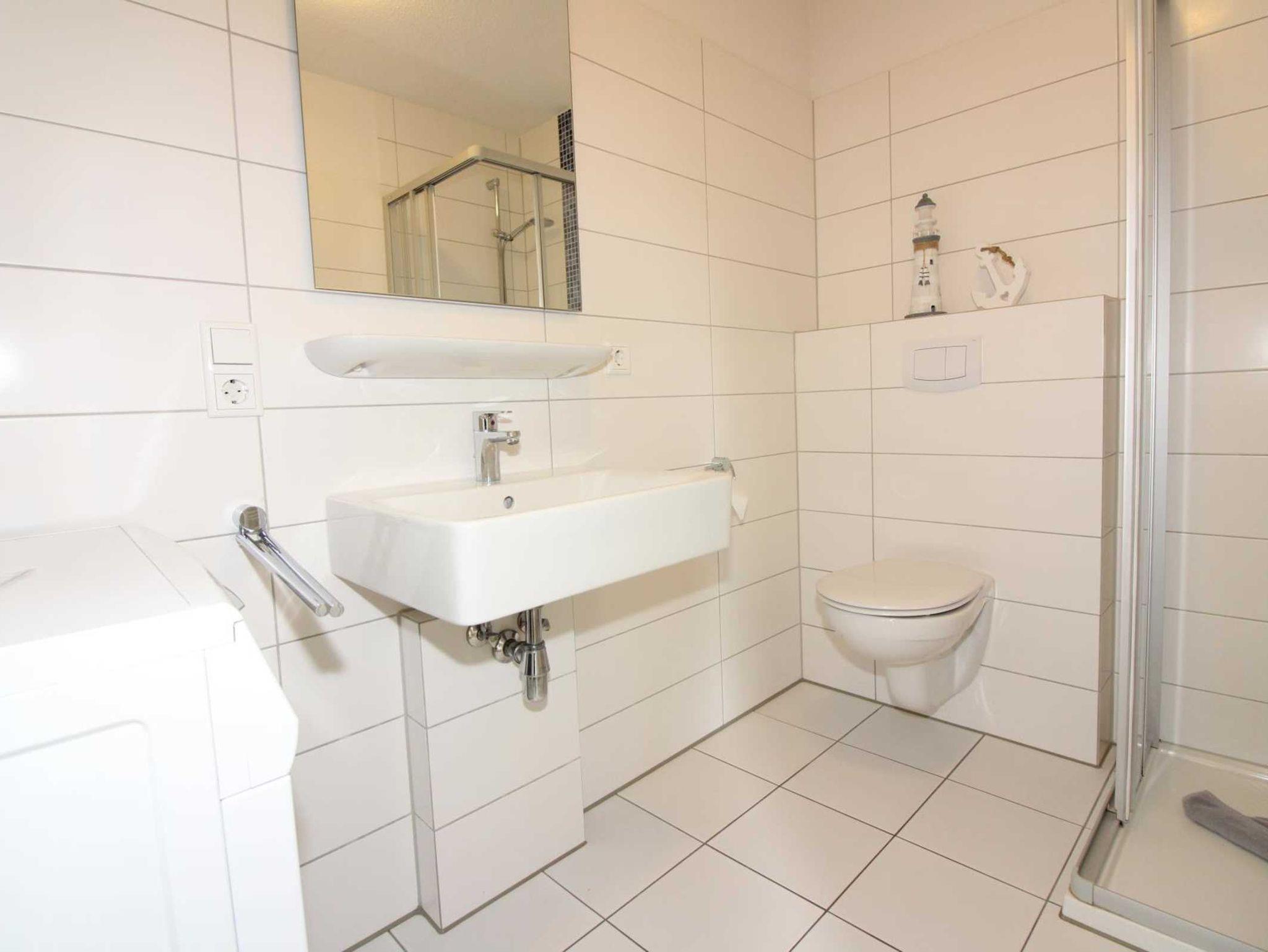 Im hochwertig ausgestatteten Erdgeschoßbad mit Duschkabine, Handtuchheizkörper und Fußbodenerwärmung befindet sich auch ein Waschtrockner. Ein Wäscheständer steht ebenfalls bereit.