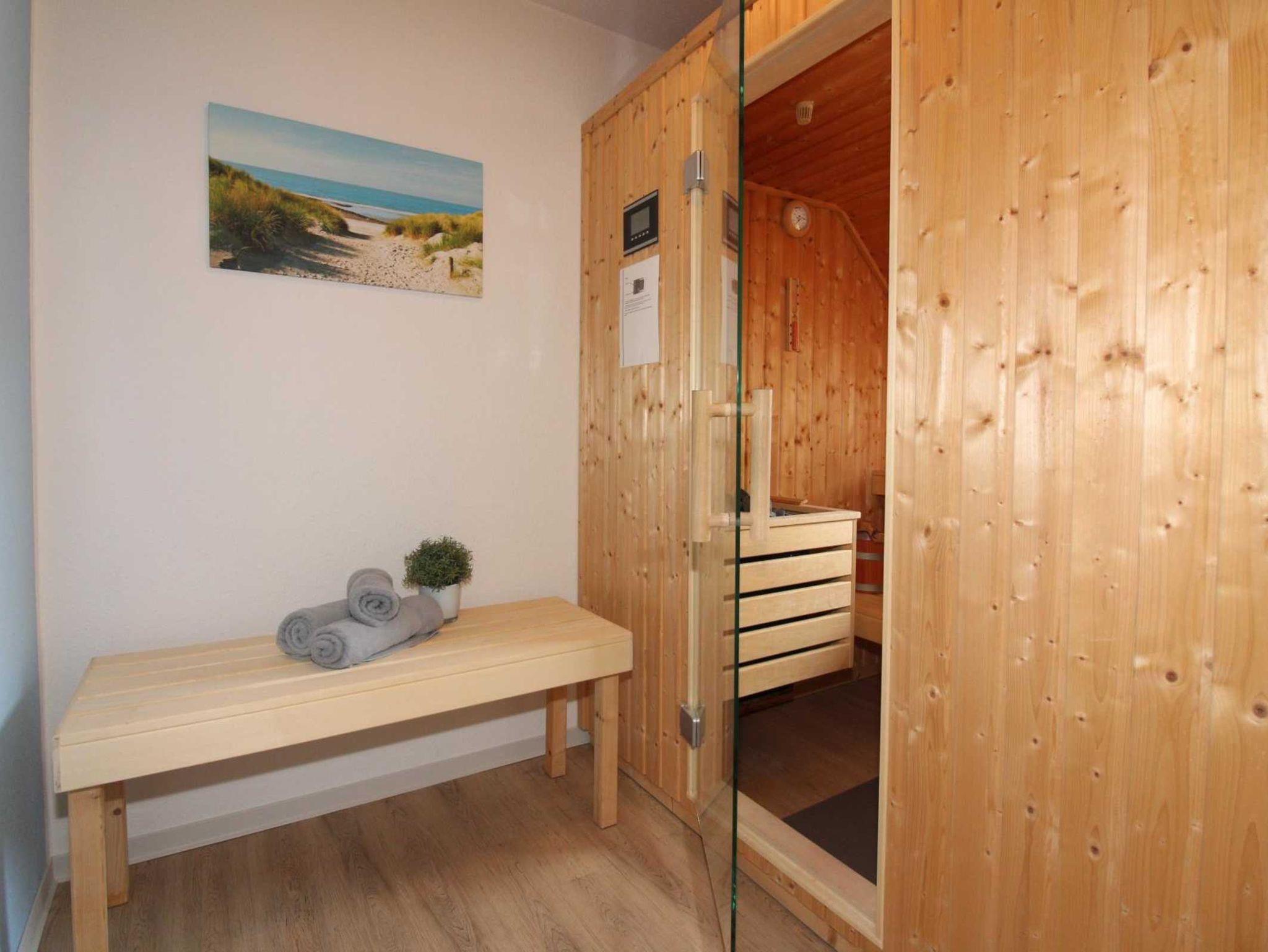 Im Obergeschoss liegen die Sauna, sowie ein Duschbad mit WC, Handtuchheizkörper und Fußbodenerwärmung. Weiterhin befinden sich hier zwei Schlafräume, das Schlafzimmer mit Doppelbett und Kleiderschrankwand und das zweite Schlafzimmer mit zwei getrennten Betten, Schrank und Flachbildfernseher. Verdunklungsrollo und Fliegengitter vorhanden.