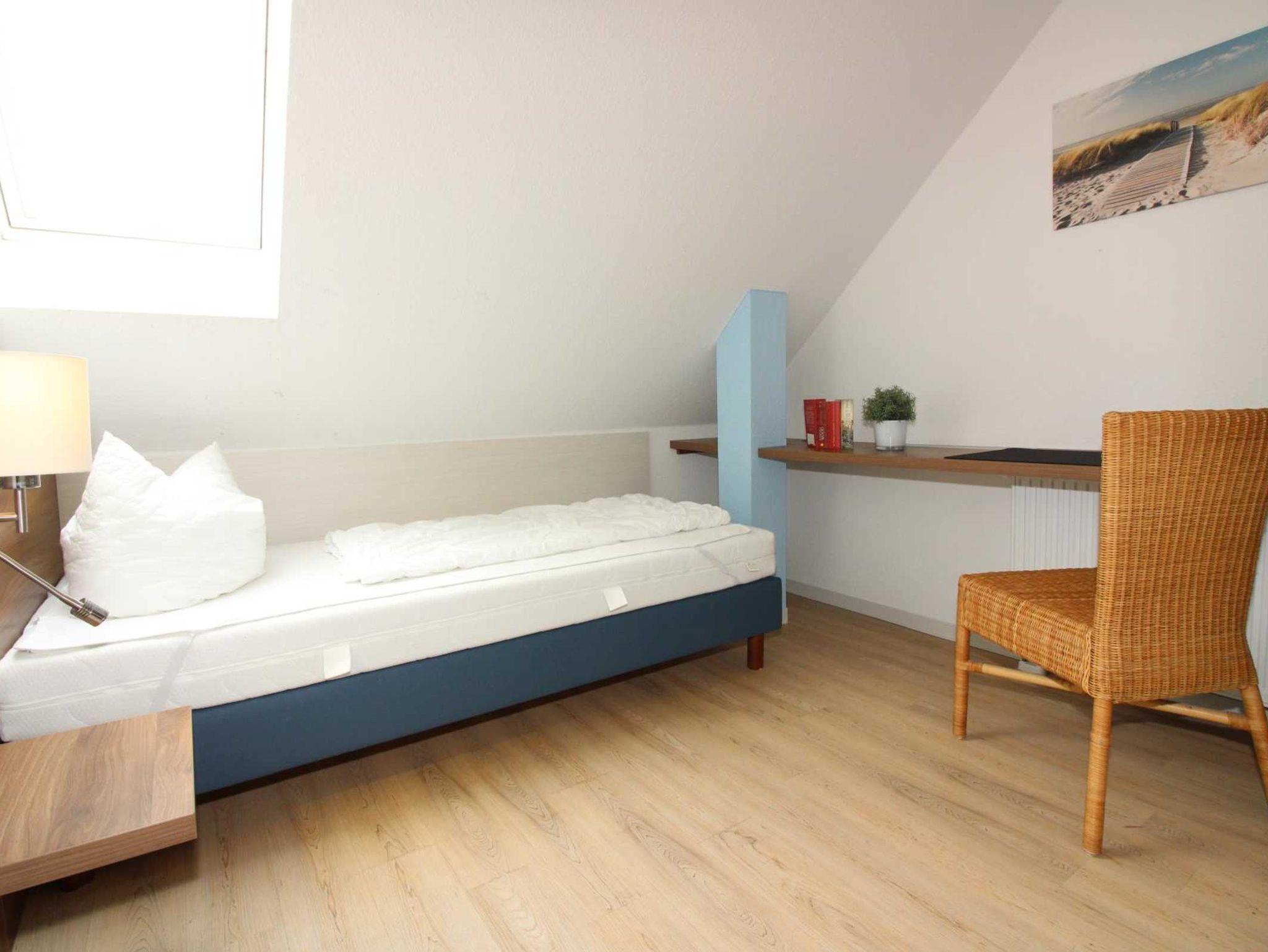 Im Dachgeschoss befindet sich ein weiterer Schlafraum mit zwei getrennten Betten, Kleiderschrank und Schreibtisch.