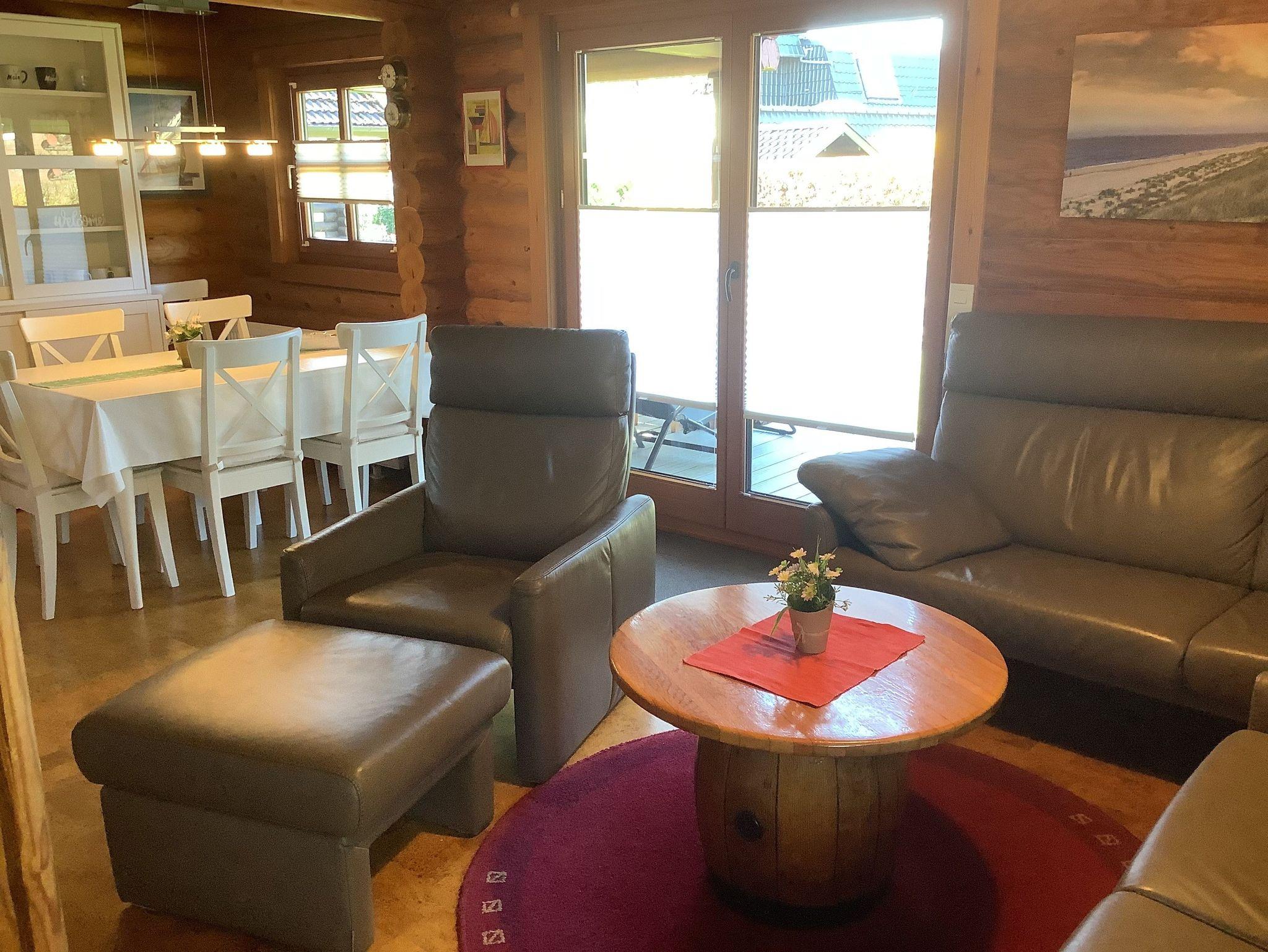 Treten Sie ein in unser uriges Blockhaus welches auf 71m² ausreichend Platz für bis zu fünf Erwachsene und ein Kleinkind bietet. Auf der linken Seite im Erdgeschoss, finden Sie das erste Schlafzimmer mit Doppelbett und Kleiderschrank vor. Direkt gegenüber liegt das Badezimmer mit Dusche, WC, Waschbecken und einem kleinen Tritthocker für Kinder. Im großen Wohnzimmer erwarten Sie komfortable Sitzmöglichkeiten, Bücher, ein Flat-TV und ein Esstisch. Links um die Ecke liegt die offene, vollständig ausgestattete Küche.