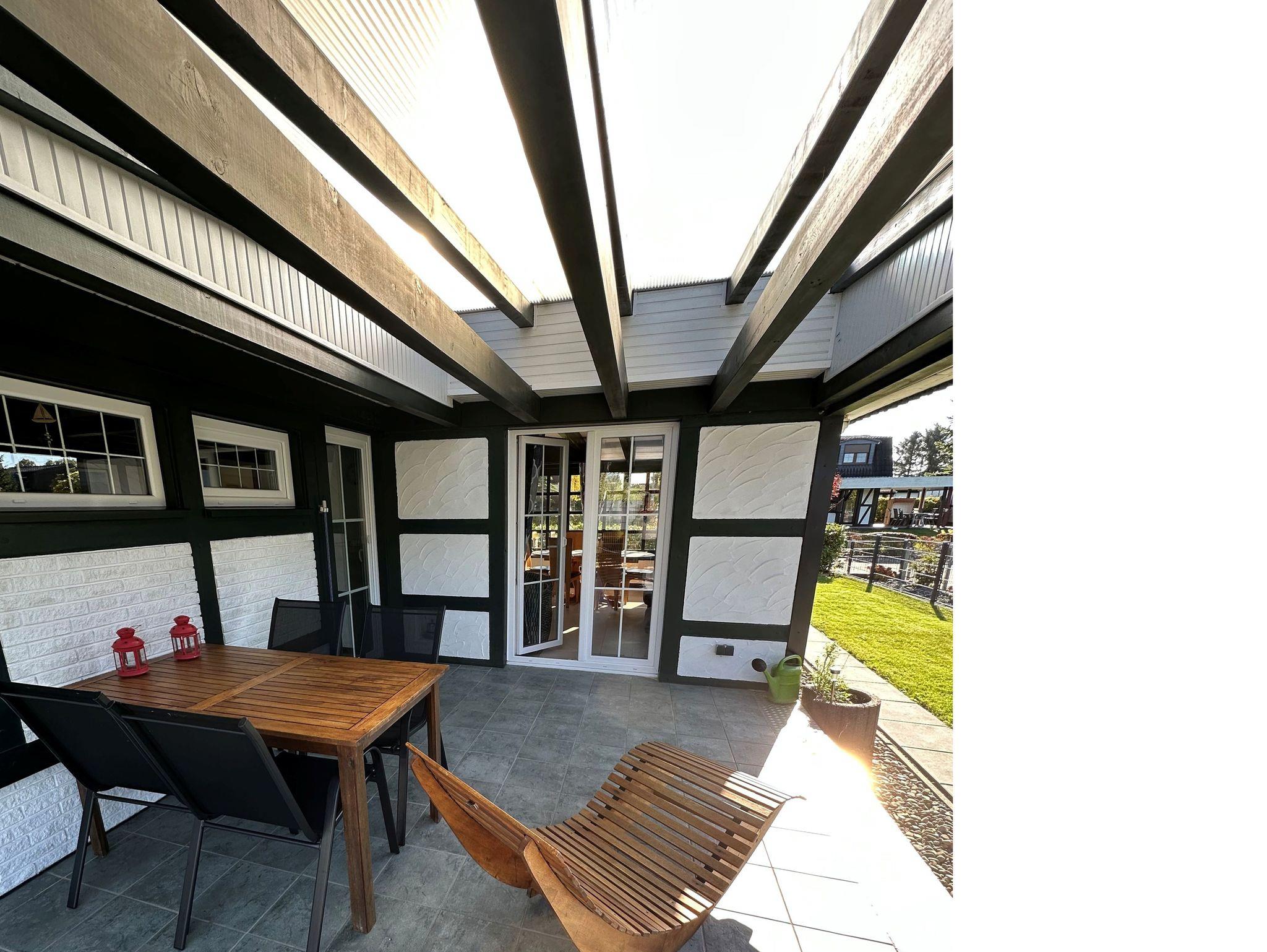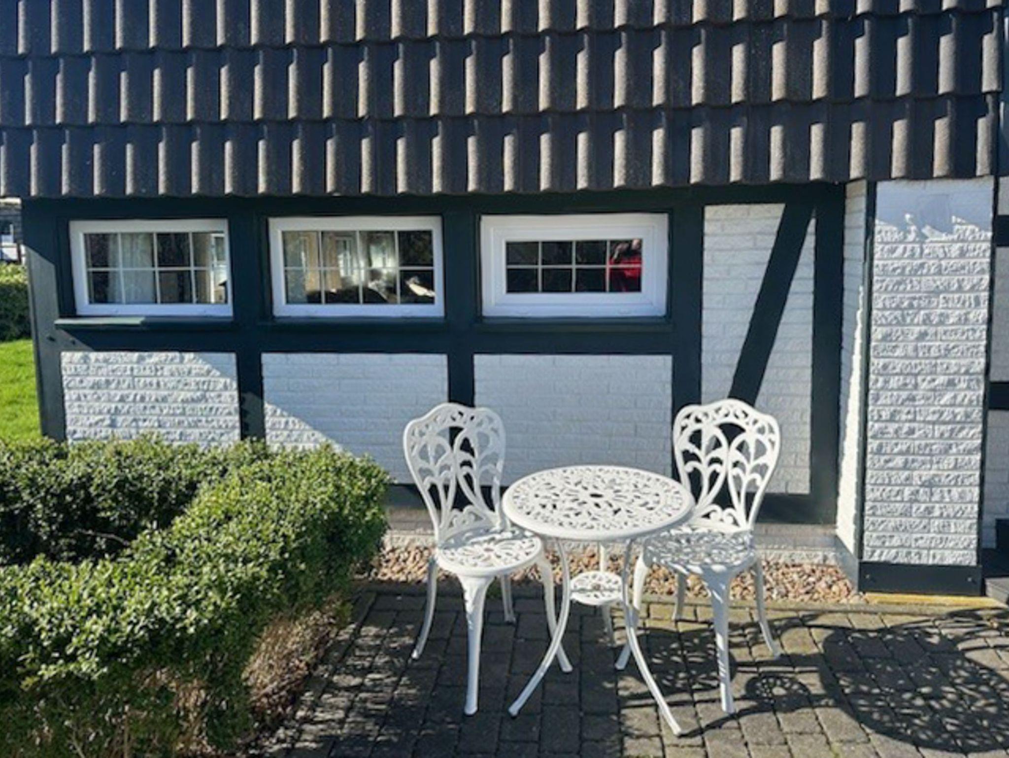 Im Erdgeschoss gelangen Sie vom Wohnbereich direkt in den Garten. Hier befinden sich die offene, voll ausgestattete Küche mit gemütlicher Essecke (u. a. Kaffeemaschine, Padmaschine, Toaster, Wasserkocher, Cerankochfeld, Backofen, Kühl-/Gefrierschrank, Kochutensilien, Geschirr und Besteck, kein Geschirrspüler) sowie das Badezimmer mit Dusche und Waschtisch. Der Wohnraum lädt mit seinem offenen Kamin und einem 55-Zoll-SAT-TV zu entspannten Abenden ein. Von hier und vom Anbau aus erreichen Sie die überdachte Terrasse mit Gartenmöbeln und den großen Garten mit Liegewiese. Im Anbau gibt es einen zusätzlichen Essbereich sowie zwei ausziehbare Schlafsessel, die bei Bedarf als Aufbettung für zwei weitere Personen genutzt werden können.