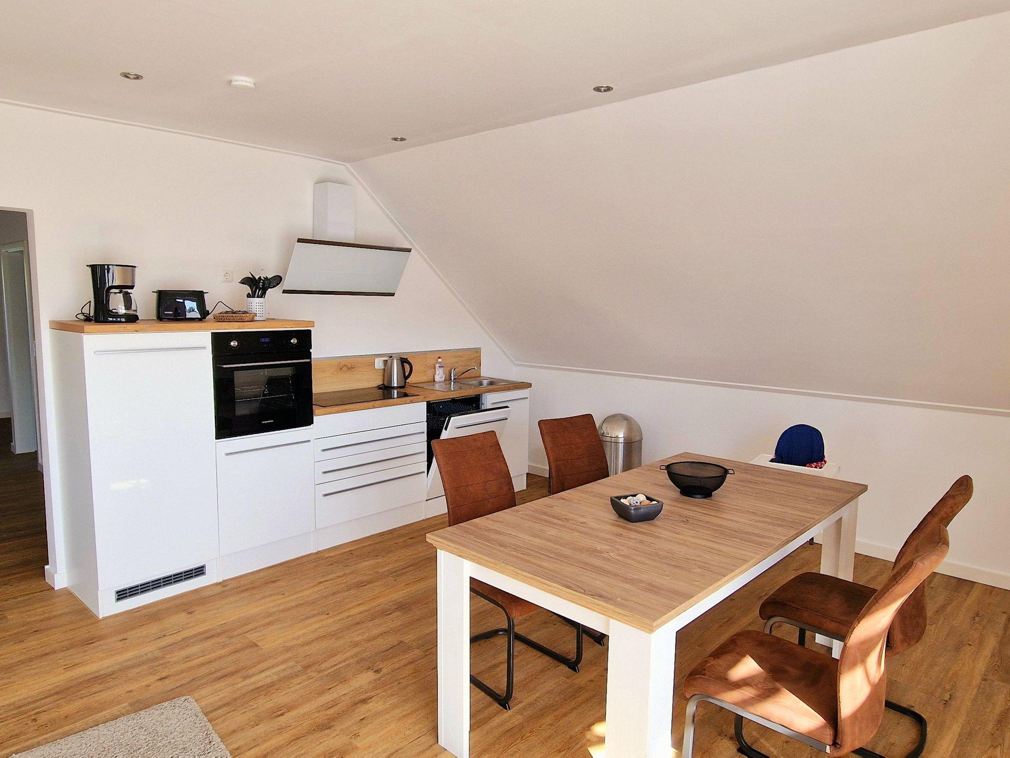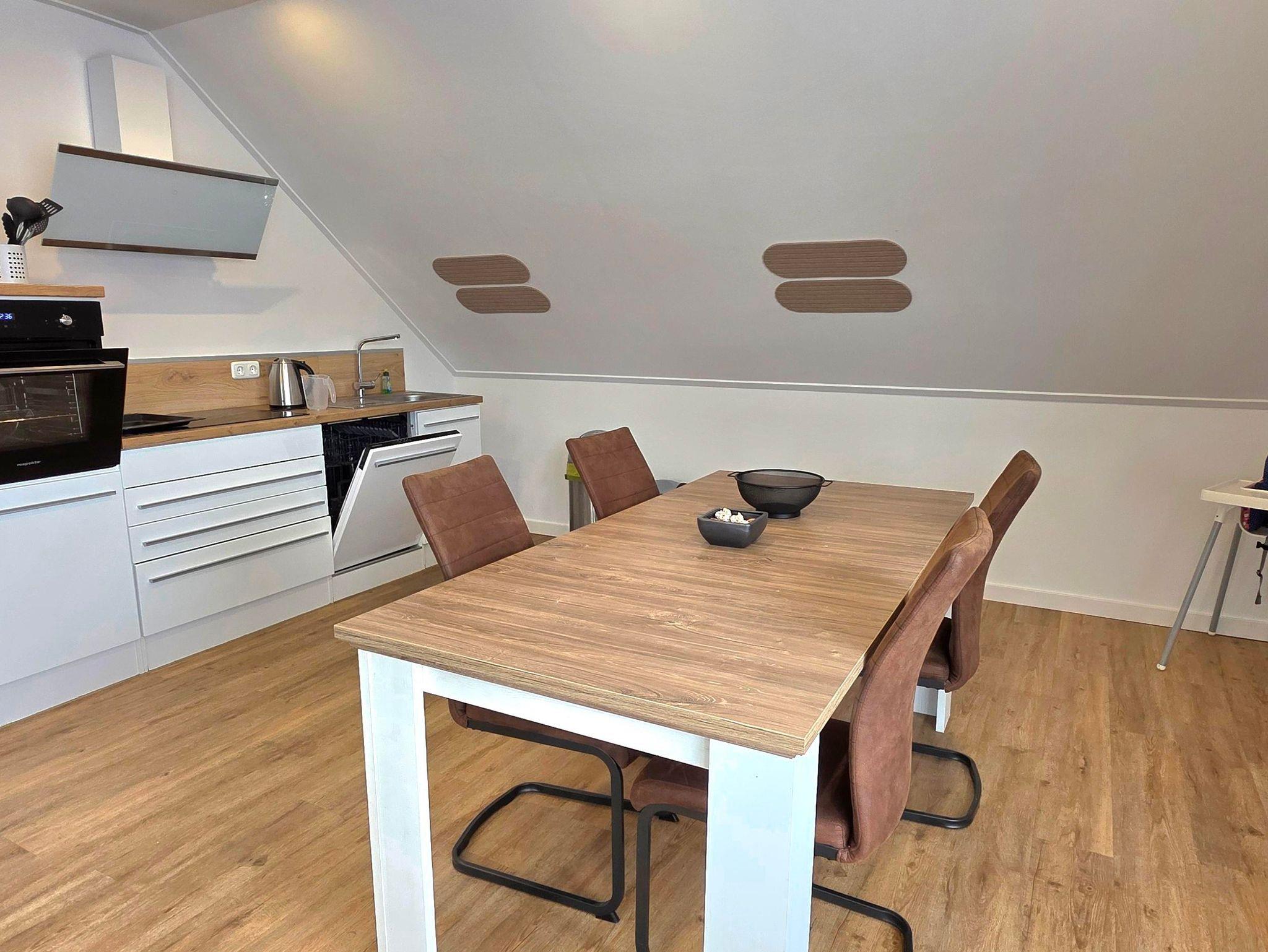 In dem hell und freundlichen Wohn- und Essbereich finden Sie neben einer gemütlichen Couchgarnitur auch einen Essplatz für bis zu 6 Personen vor. Die gegenüberliegende Küche ist ausgestattet mit u.a. genügend Geschirr, Herd, Kühl- und Gefrierkombination, Toaster, Kaffeemaschine, Geschirrspüler. Im Badezimmer befindet sich eine Regen-Dusche, Waschbereich und das WC. Zusätzlich befindet sich ein separates WC in der gehobenen Wohnung.