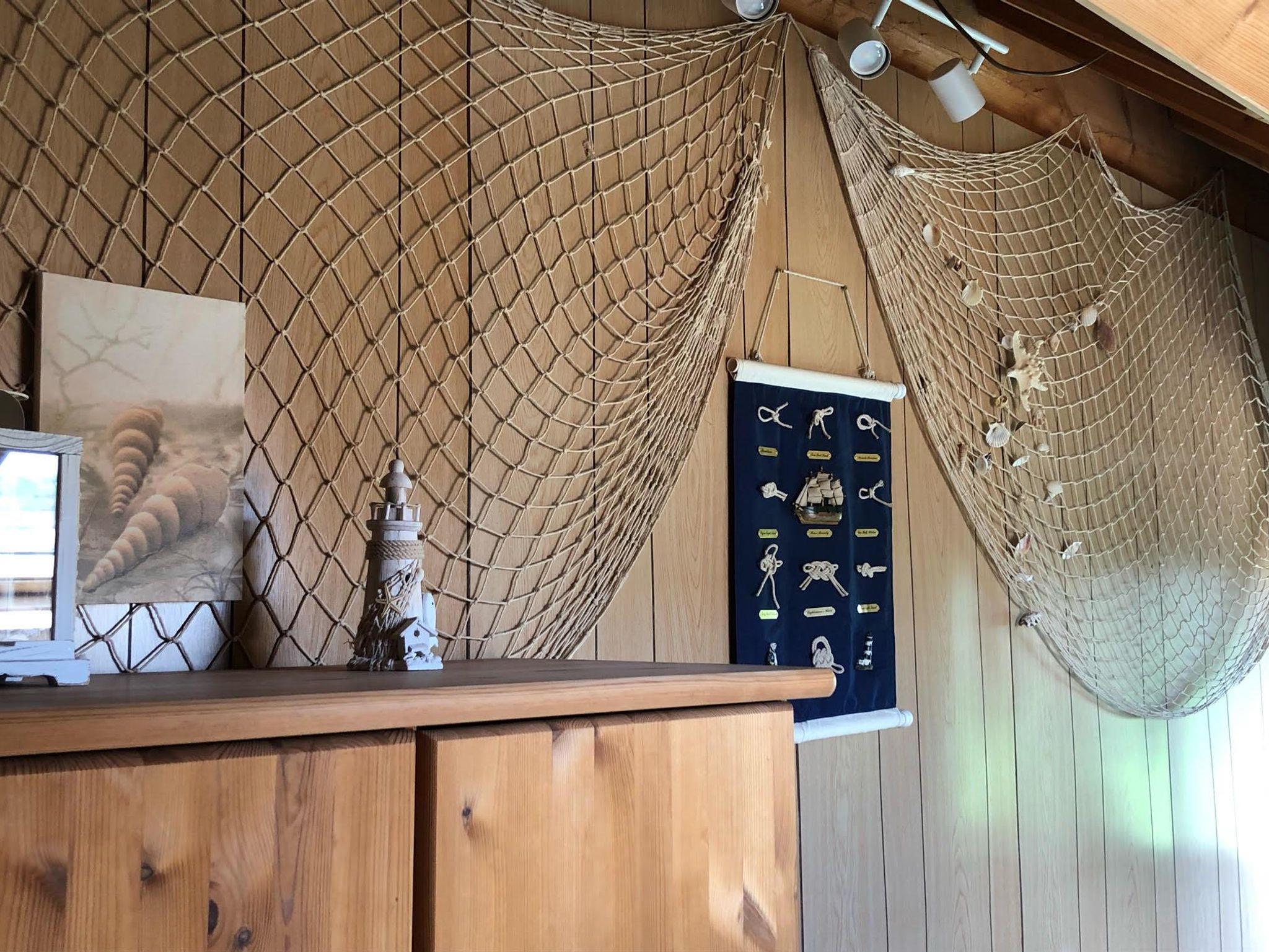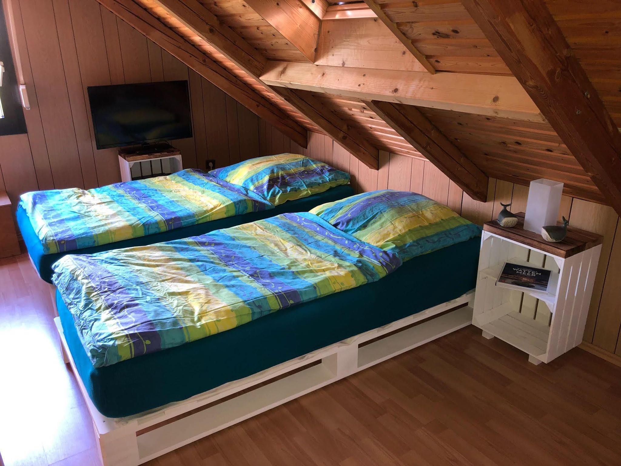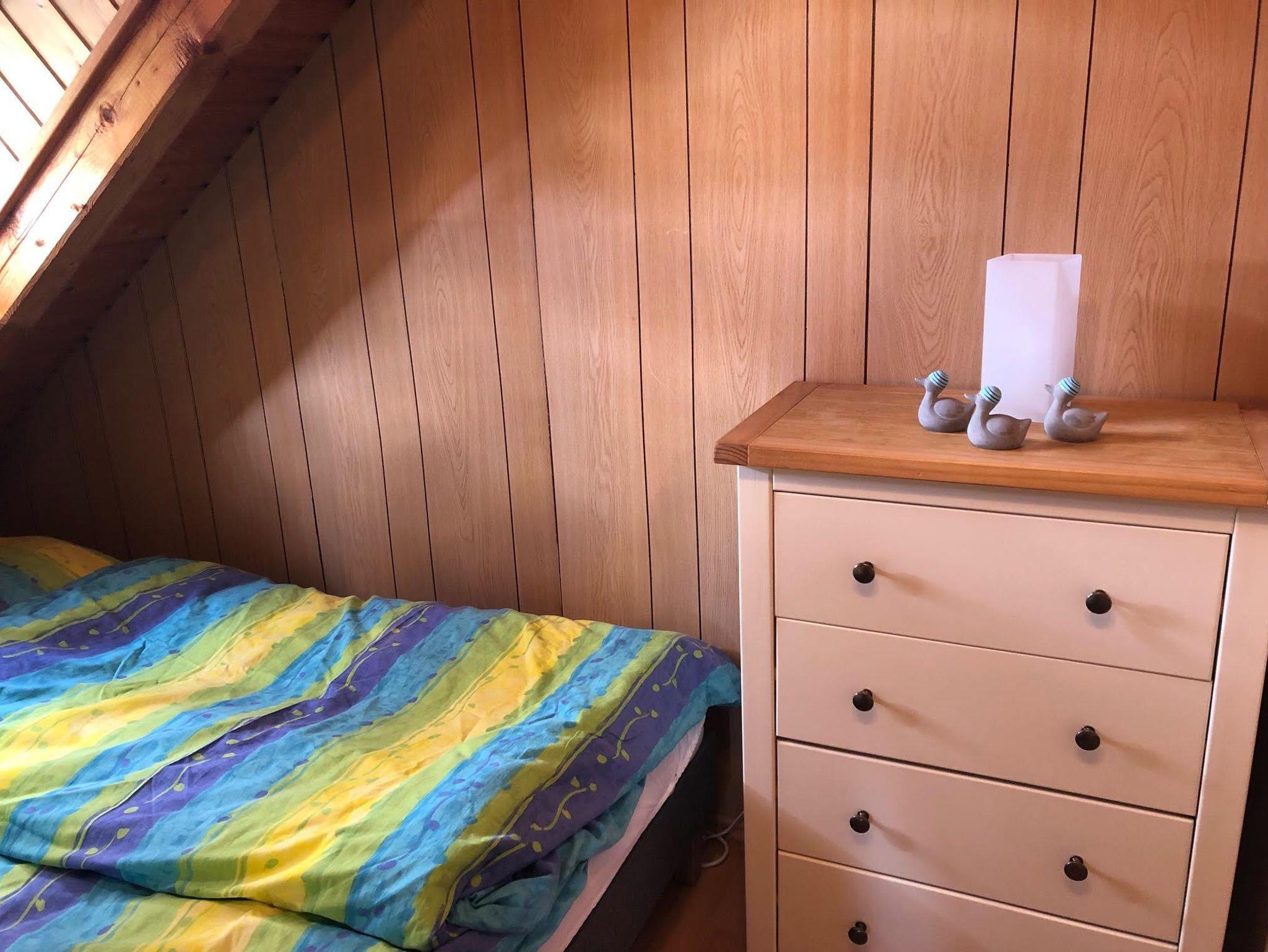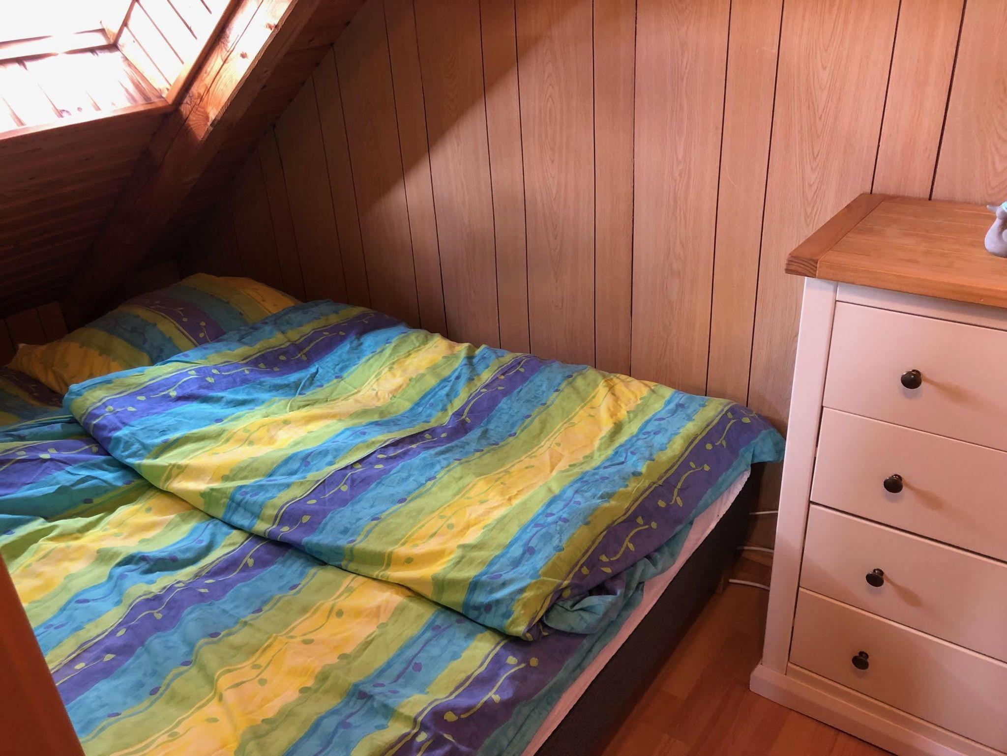 Die Betten verteilen sich auf 3 Räume: es gibt im Spitzboden ein Schlafzimmer mit Doppelbett (180x200), eine kleine Kammer mit einem Einzelbett (90x200) sowie einer vor allem bei Kindern sehr beliebte Schlafhöhle mit einer Liegefläche von 180x200 und zudem gibt es ein bequemes Doppel-Schlafsofa im Wohnzimmer. Insgesamt finden so bis zu 7 Personen einen gemütlichen Schlafplatz.