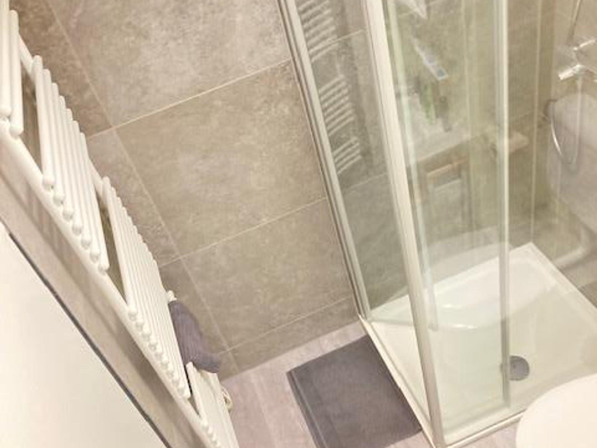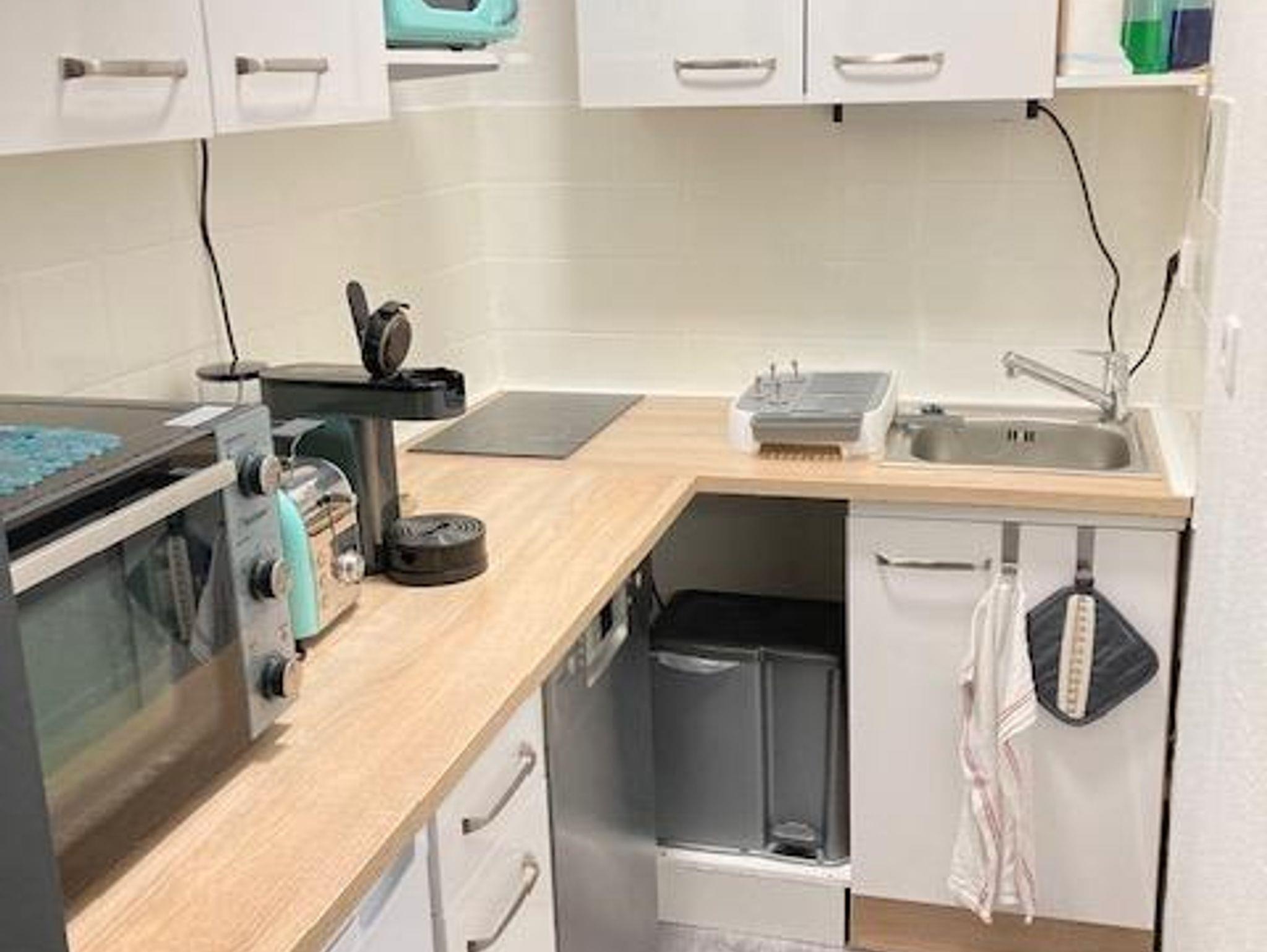 Außerdem gibt es eine separate, voll ausgestattete Küche mit Geschirrspüler und Pad-Kaffeemaschine, ein Schlafzimmer mit Dreier-Hochbett für Kinder und ein Bad mit Dusche und WC.