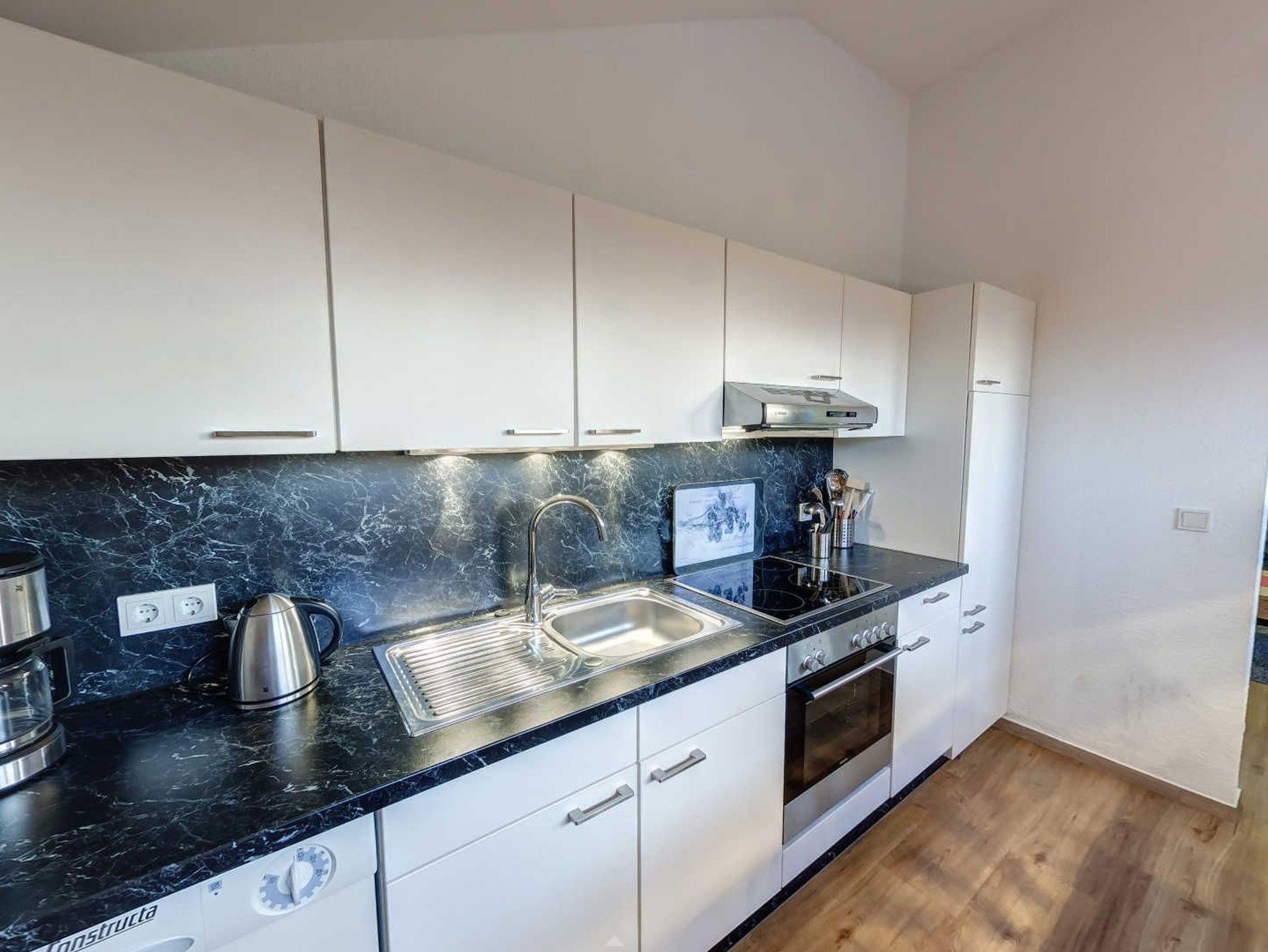 Die offene, komplett ausgestattete Küche mit Esstisch befindet sich hinter dem Wohnzimmer. Das zweite Schlafzimmer mit Doppelbett, Flat-TV und Regal befindet sich direkt neben dem Wohnzimmer.