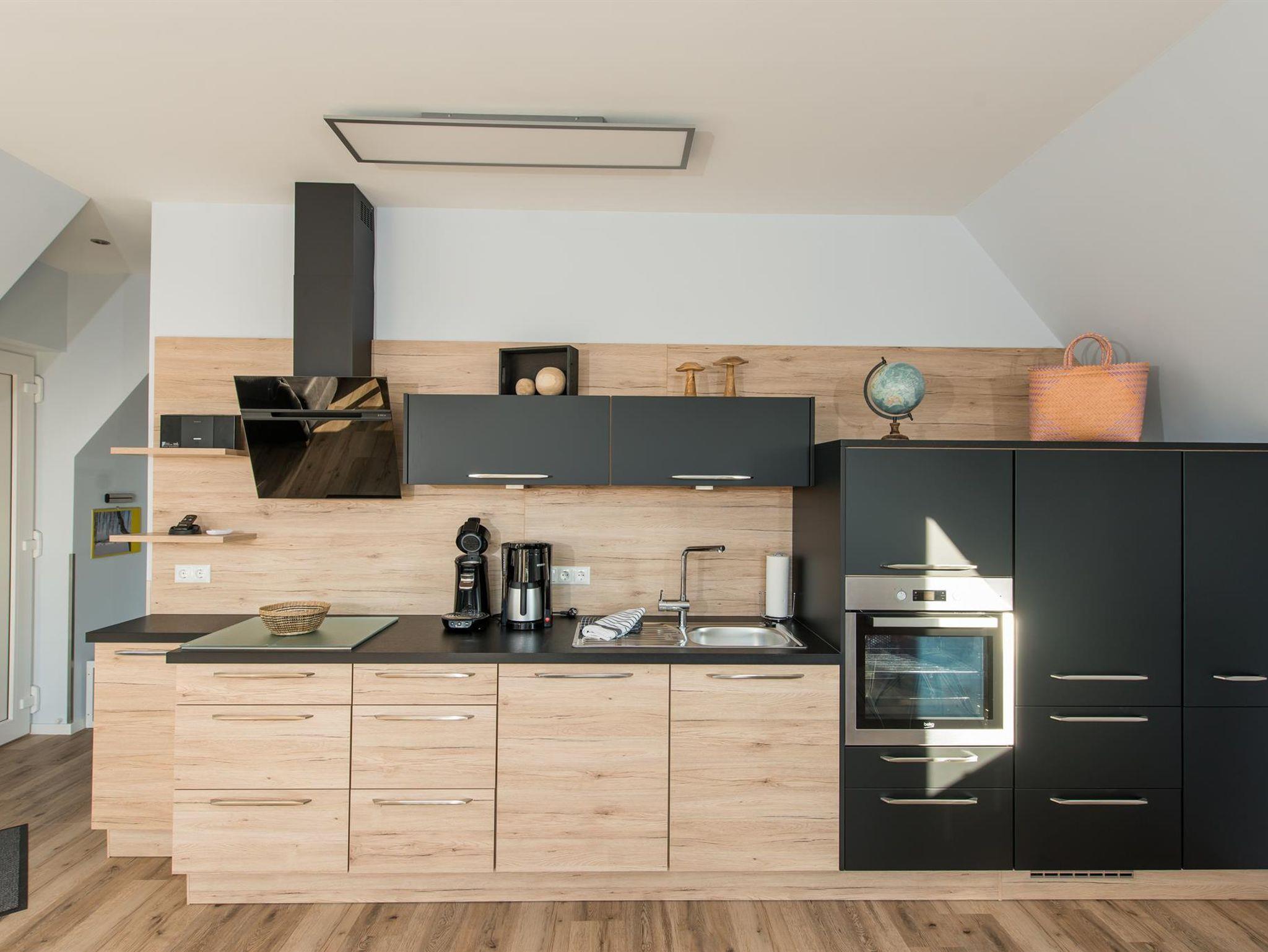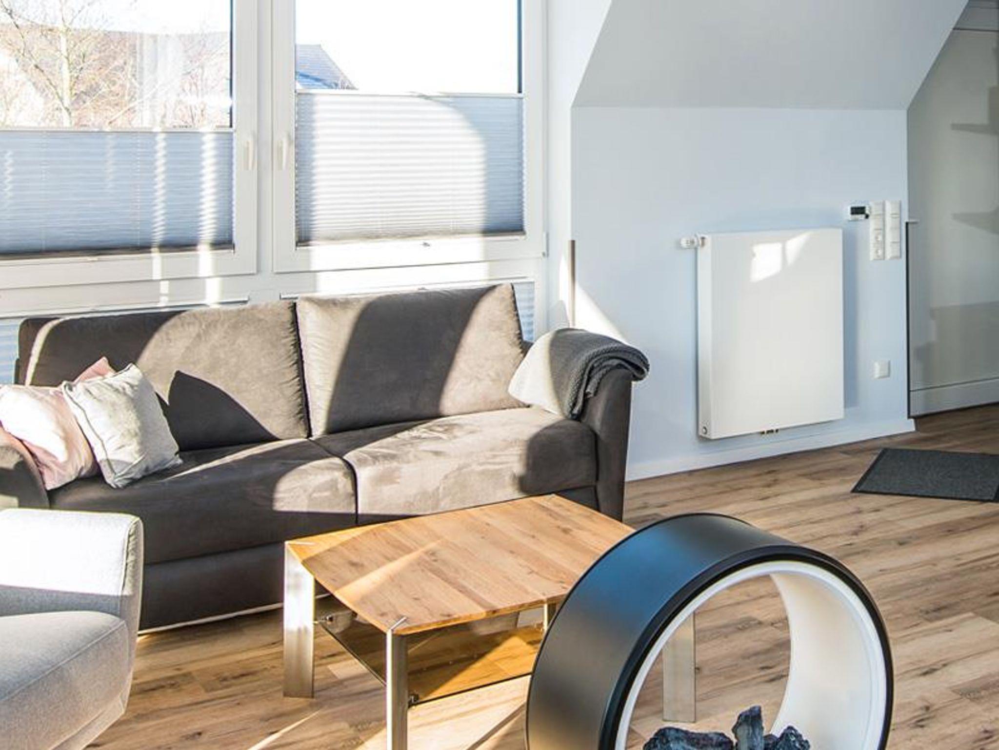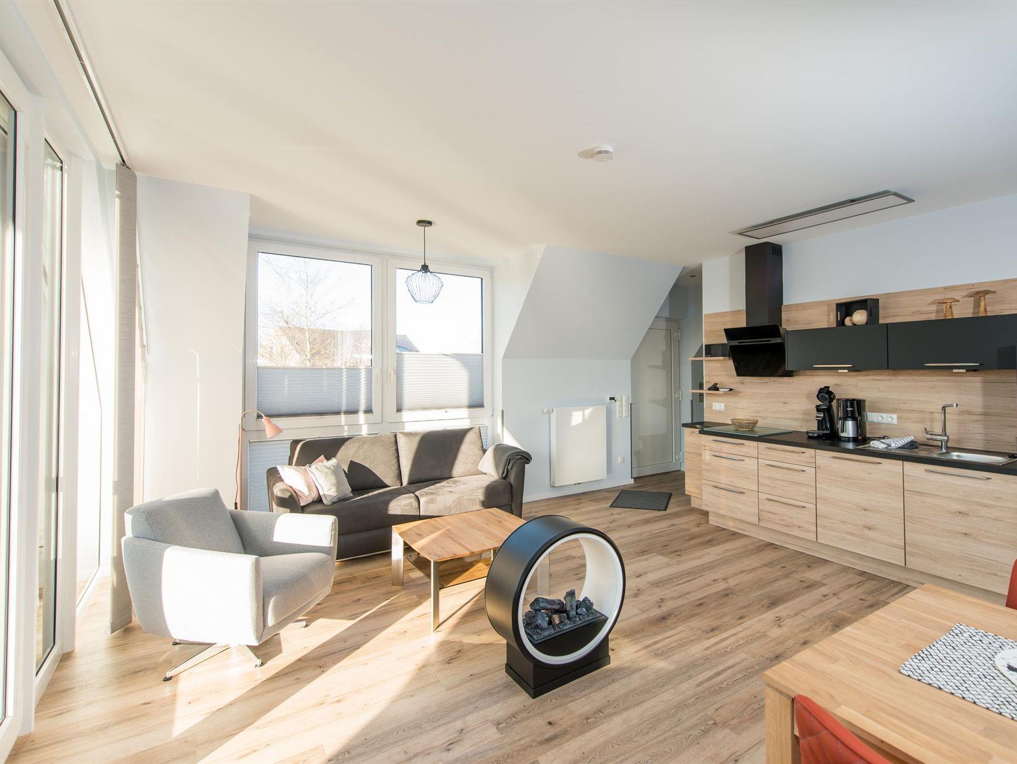 Das Schlafzimmer ist mit modernen Boxspringbetten, einem Flachbild-TV sowie einem geschmackvoll integrierten Einbauschrank versehen. Für einen weiteren Gast lässt sich das Sofa im Wohnzimmer mit nur wenigen Handgriffen zu einer bequemen Schlafmöglichkeit mit 160 x 200 cm Liegefläche umfunktionieren. Für kleine Gäste ist ein kostenfreies Kinderreisebett selbstverständlich.