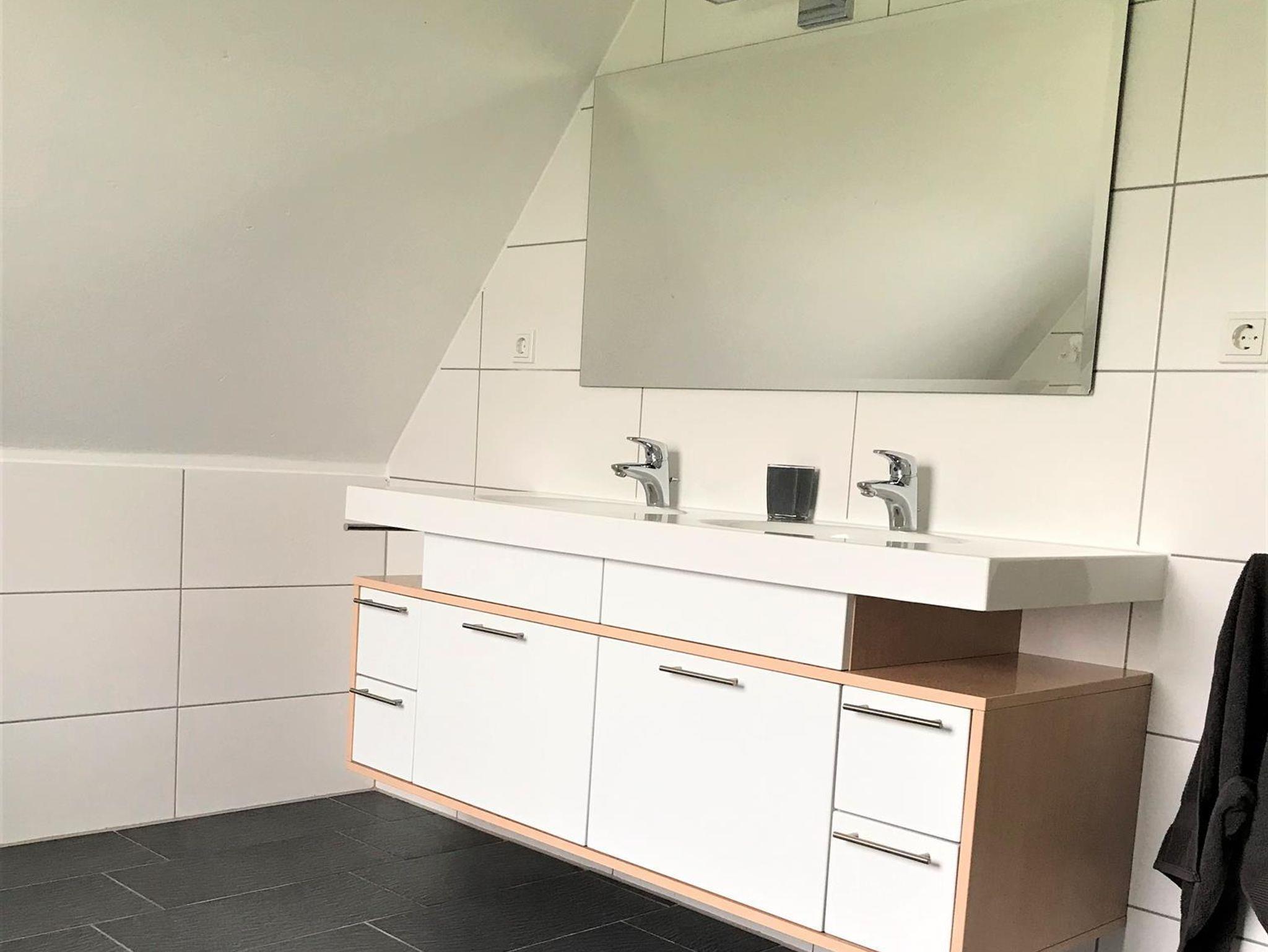 Über eine kleine Treppe erreichen Sie die Wohnung im 1. Obergeschoß. Sie hat ein Wohnzimmer, ein Schlafzimmer, eine Küche und ein großes Bad. Das Wohnzimmer lädt auf einer gemütlichen modernen Sofaecke zum abendlichen Spielen und Filme gucken ein. Das Schlafzimmer hat ein großes Doppelbett. Für die Kinder haben wir zwei separate Alkovenbetten gebaut mit 1,80m und 1,90m Länge. Unsere Kinder wollen gar nicht wieder raus aus ihrem „Nest“. Die Küche hat alles was man braucht zum Kochen; eine Kühlgefrierkombination, Backofen, Spülmaschine, Filterkaffeemaschine, Wasserkocher und einen gemütlichen Esstisch. Einen Kinderhochstuhl stellen wir gerne auf Anfrage zur Verfügung. Das Badezimmer mit Doppelwaschbecken und Dusche ist richtig groß und liegt zum Garten.