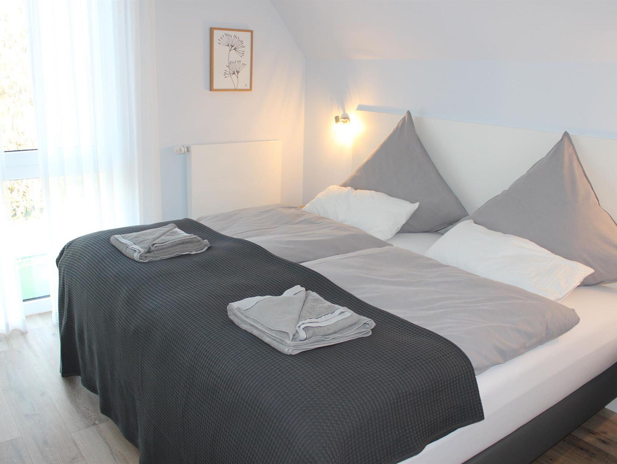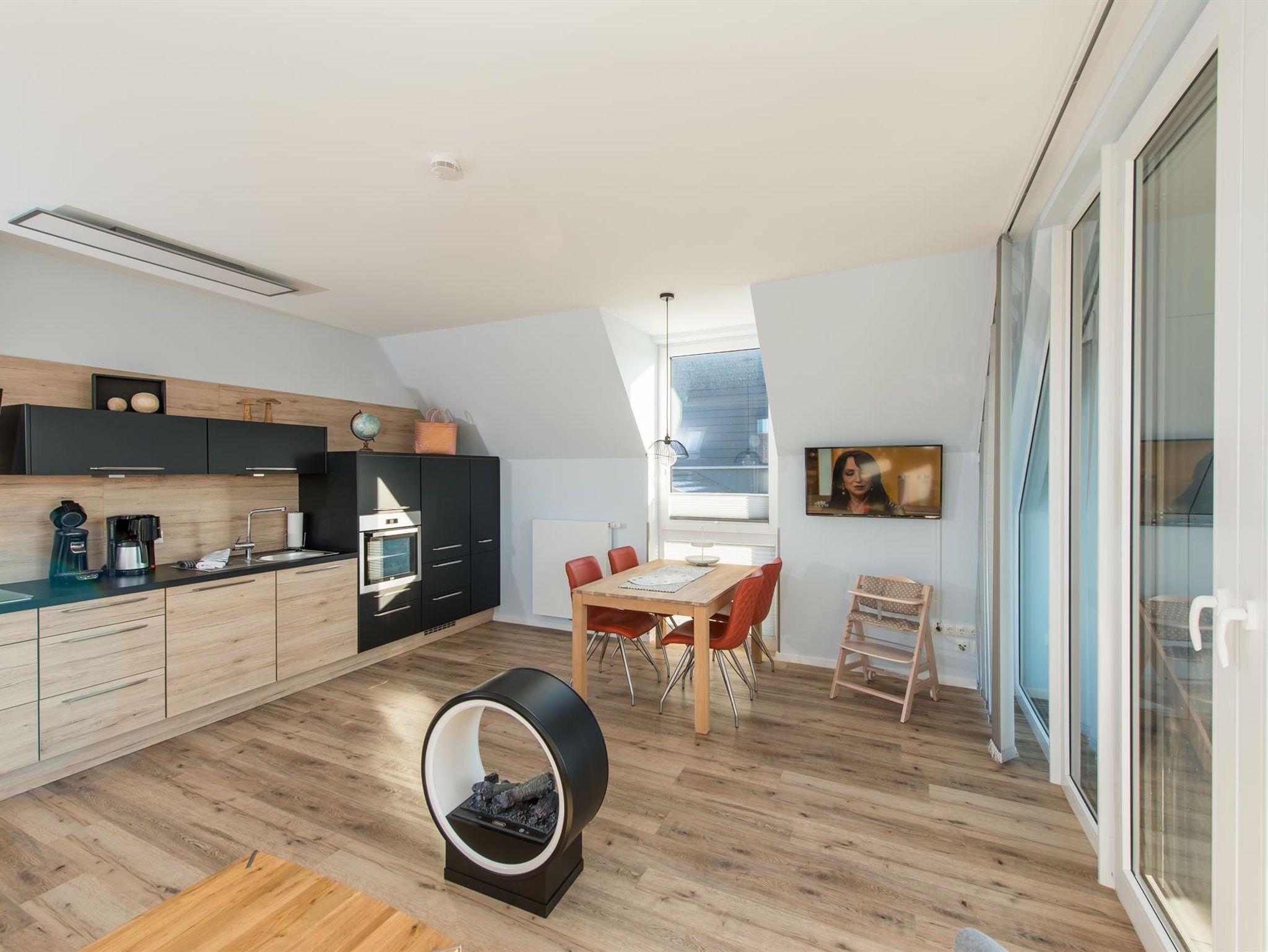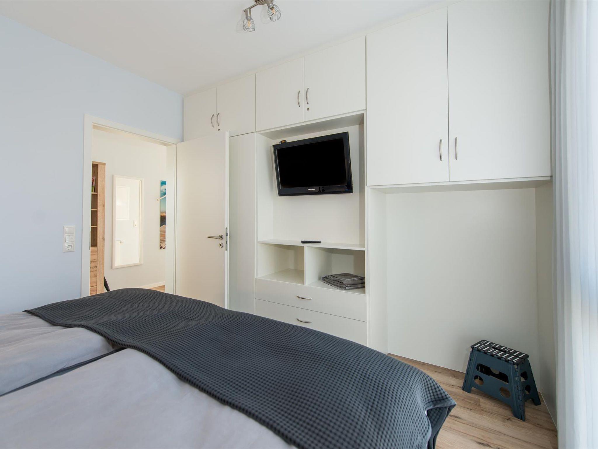 Das Schlafzimmer ist mit modernen Boxspringbetten, einem Flachbild-TV sowie einem geschmackvoll integrierten Einbauschrank versehen. Für einen weiteren Gast lässt sich das Sofa im Wohnzimmer mit nur wenigen Handgriffen zu einer bequemen Schlafmöglichkeit mit 160 x 200 cm Liegefläche umfunktionieren. Für kleine Gäste ist ein kostenfreies Kinderreisebett und Kinderstuhl selbstverständlich.