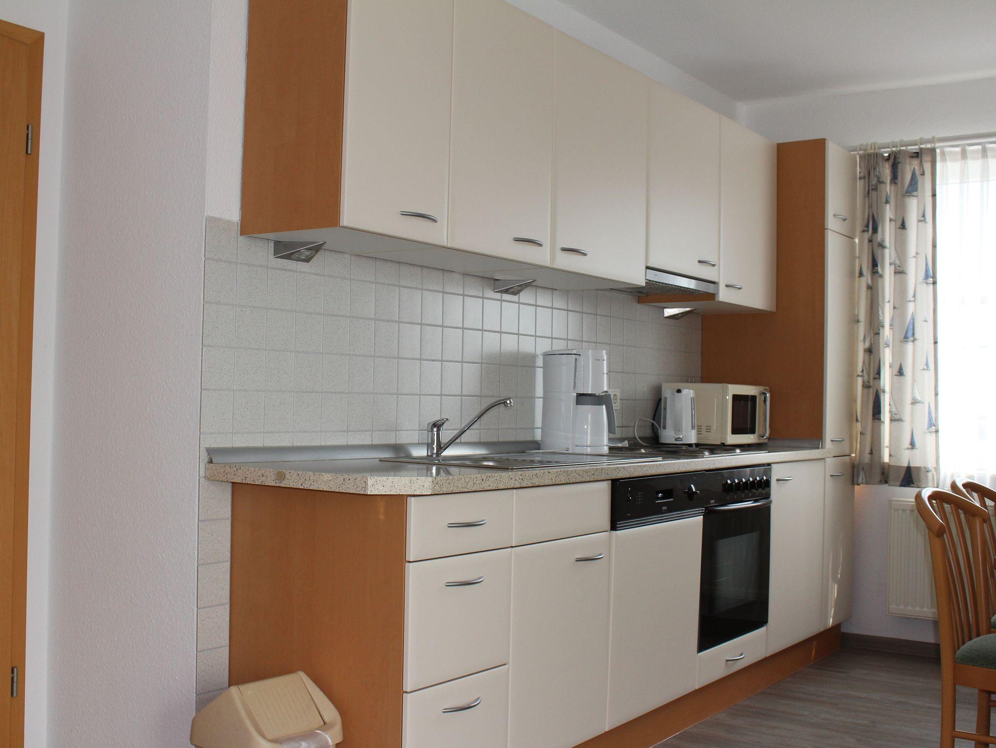 Die voll ausgestattete Küchenzeile beinhaltetu.a. Kaffeemaschine, Mikrowelle, Brotmaschine, Eierkocher, Wasserkocher, Flaschenwärmer, große Spülmaschine und Elektroherd mit Heißluft.
