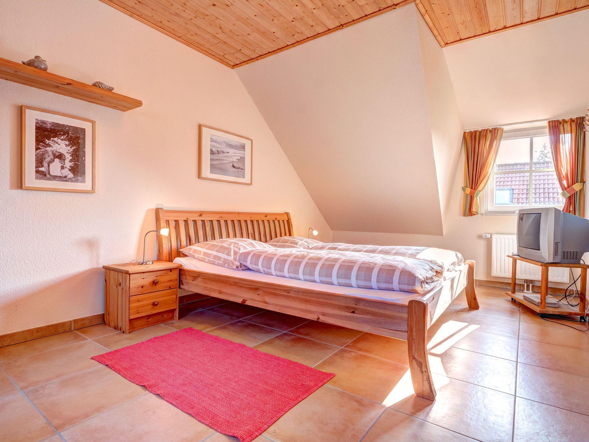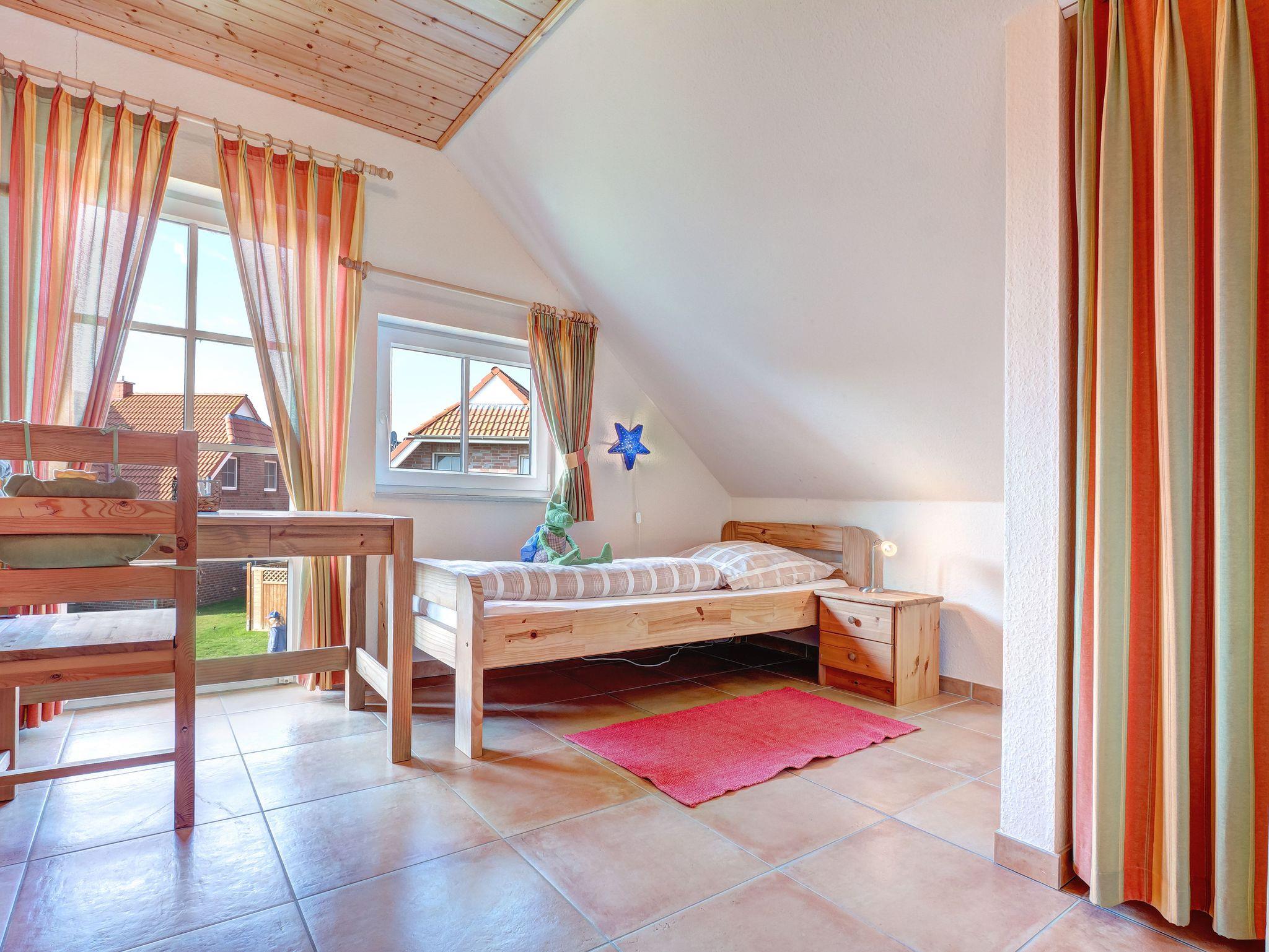 Über die Holztreppe im Flur gelnagen Sie in das Obergeschoss des Hauses.Hier befinden sich zwei weitere Schlafzimmer: ein Kinderzimmer mit zwei Einzelbetten und einem kleinen Schreibtisch, sowie ein Schlafzimmer mit Doppelbett und einer Kommode.