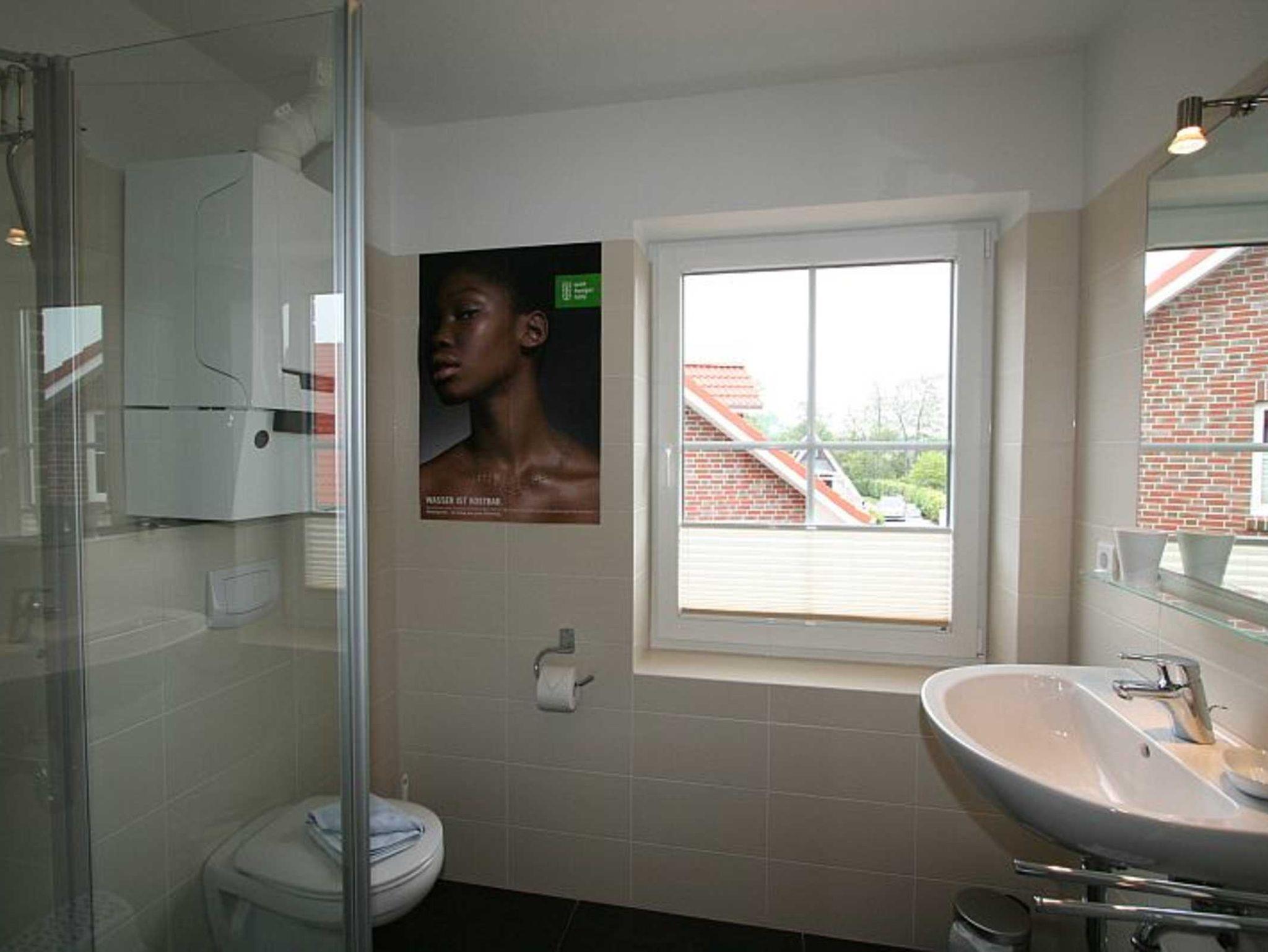 Im ersten Stock befindet sich ein großes Badezimmer mit Duschkabine (flache Duschwanne und Glasduschkabine).