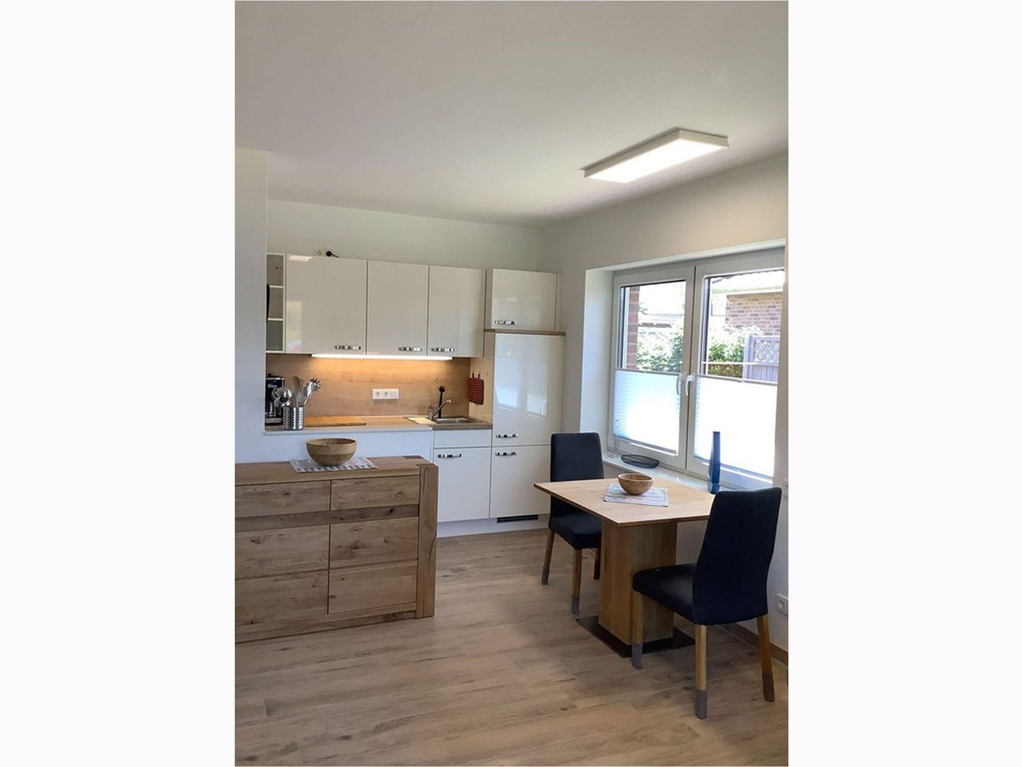Das kombinierte Wohn-/Esszimmer verfügt über eine gemütlich Sitzecke mit Sofa, Flat(Sat)-TV und Radio sowie einen kleinen Esstisch für 2 Personen. Die sich anschließende offene kleine Küche ist mit Ceranfeld, Backofen, Mikrowelle, Kühlschrank, Wasserkocher, Eierkocher und Toaster ausgestattet.