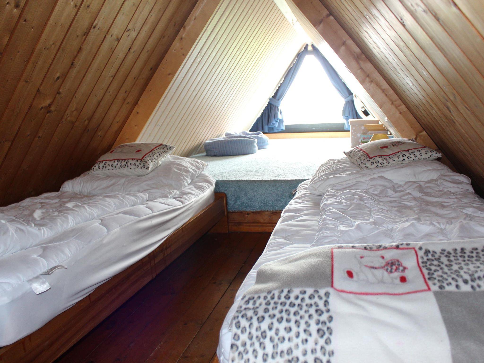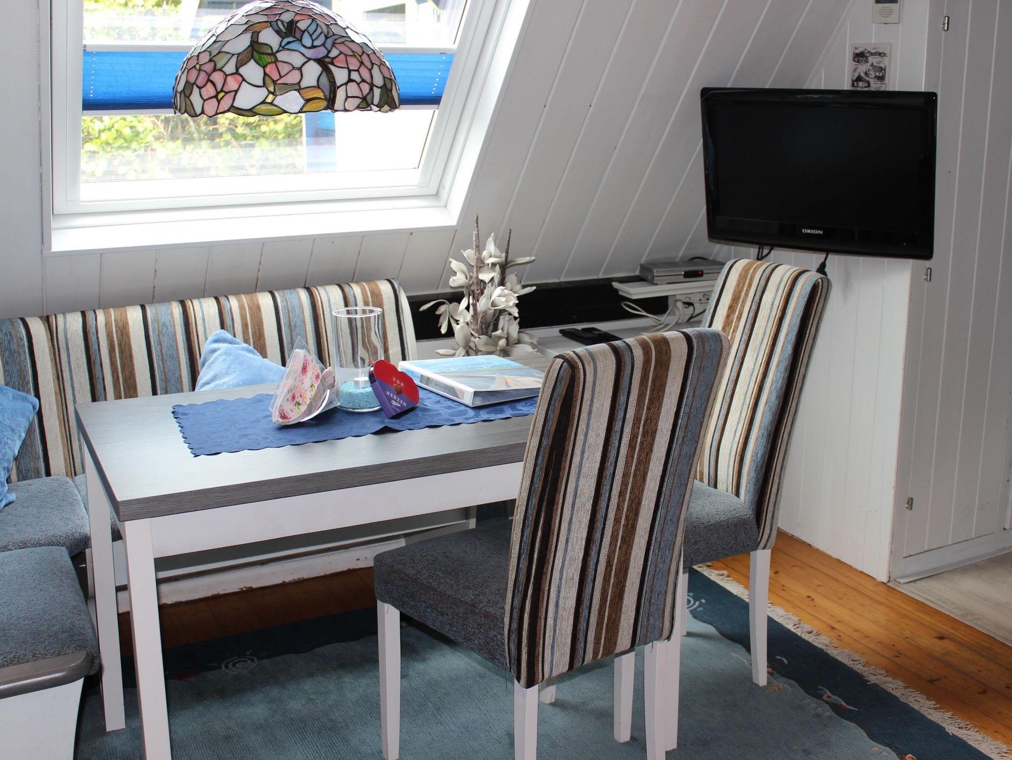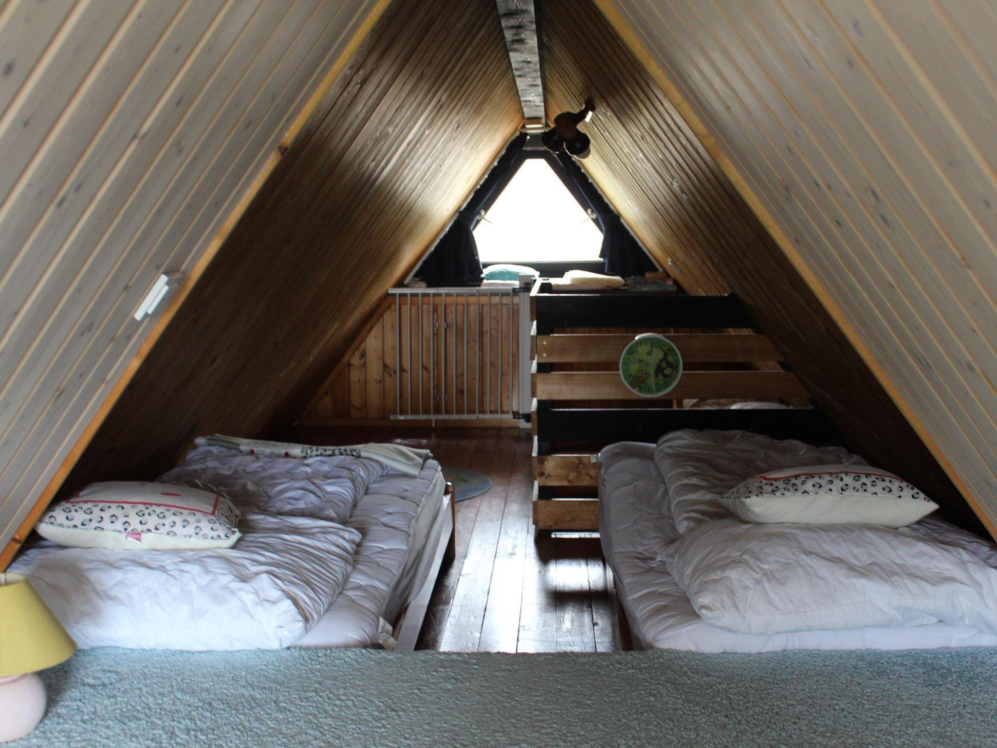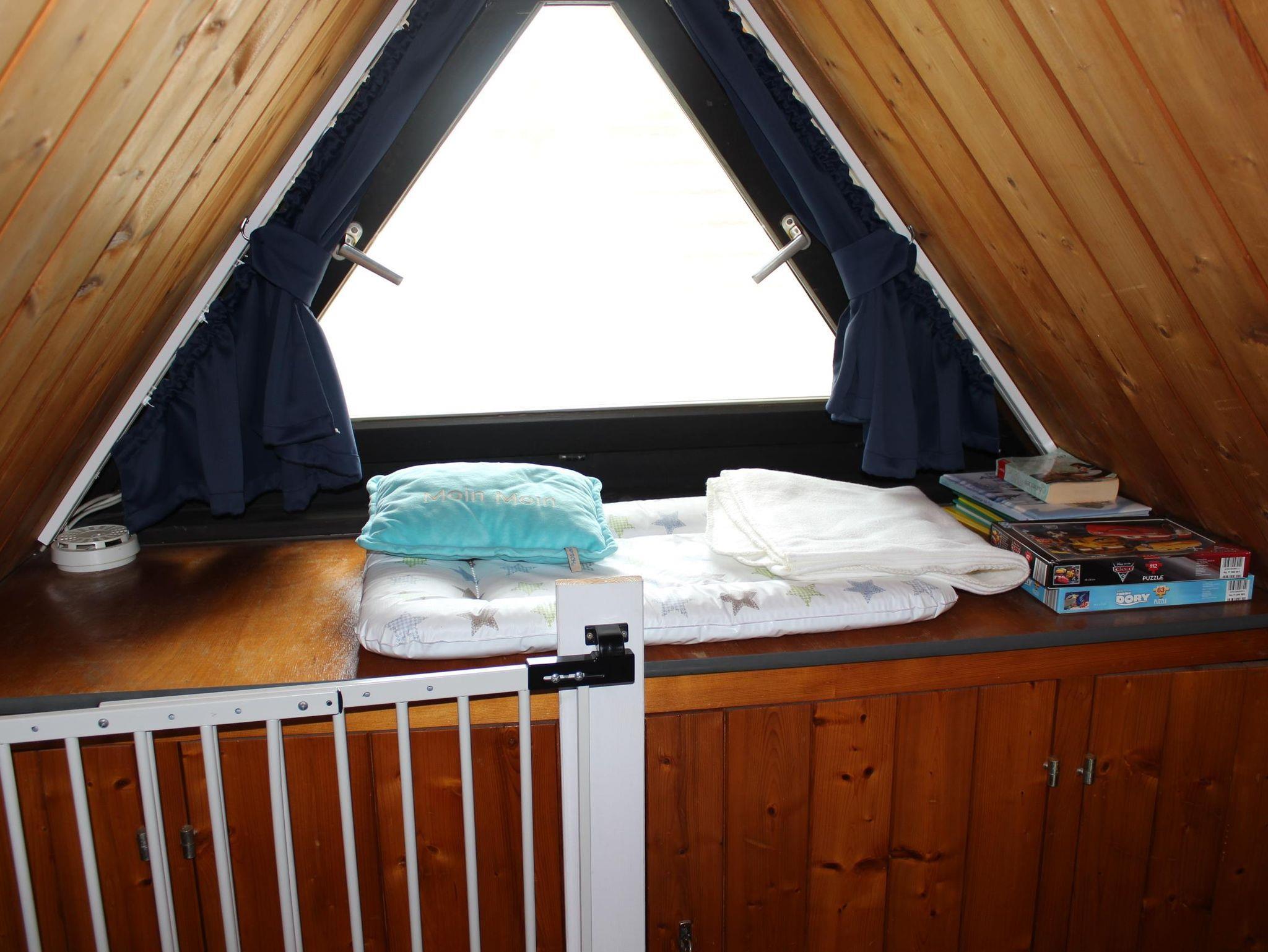 Das kleine und gemütliche Ferienhaus besteht im Erdgeschoss aus einem großen hellen Wohnraum mit offener Küchenzeile und Tresen. Essecke ist mit einer Sitzbank ausgestattet. Die Wohnecke besteht aus einem gemütlichen Sofa, einem Relexstuhl, Flachbildschirm und Radio. Die Küche hat einen Geschirrspüler, Kühlschrank und E-Herd. Ebenfalls befindet sich im Erdgeschoss ein Schlafzimmer mit Doppelbett und ein Bad mit Dusche, WC und Waschtisch. Über eine freie Raumspartreppe geht es ins Obergeschoss, dort befinden sich 2 Schlafplätze. Hier befindet sich sich auch noch Platz für ein Kinderbett.