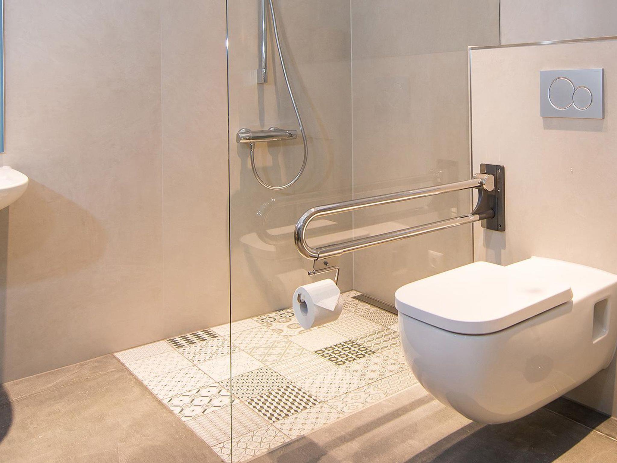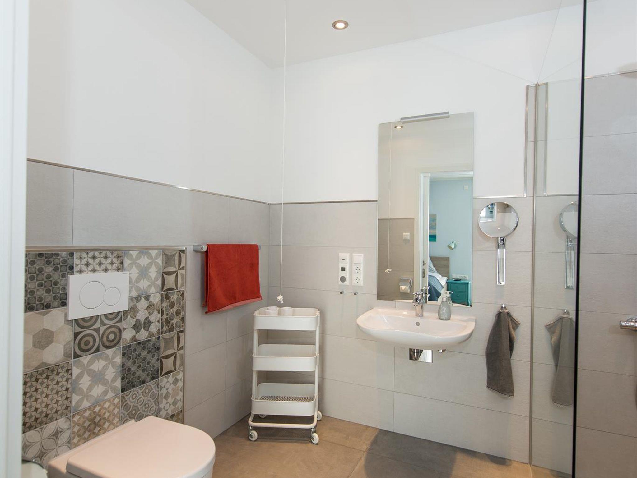 Während sich ein Tageslichtbad direkt an eines der Schlafzimmer anschließt, ist ein weiteres, hochmodern in den Innenbereich integriertes Badezimmer von den weiteren Zimmern zu erreichen. Auch bei den Bädern wurde an Barrierefreiheit gedacht. Die Ausstattung ist exklusiv.