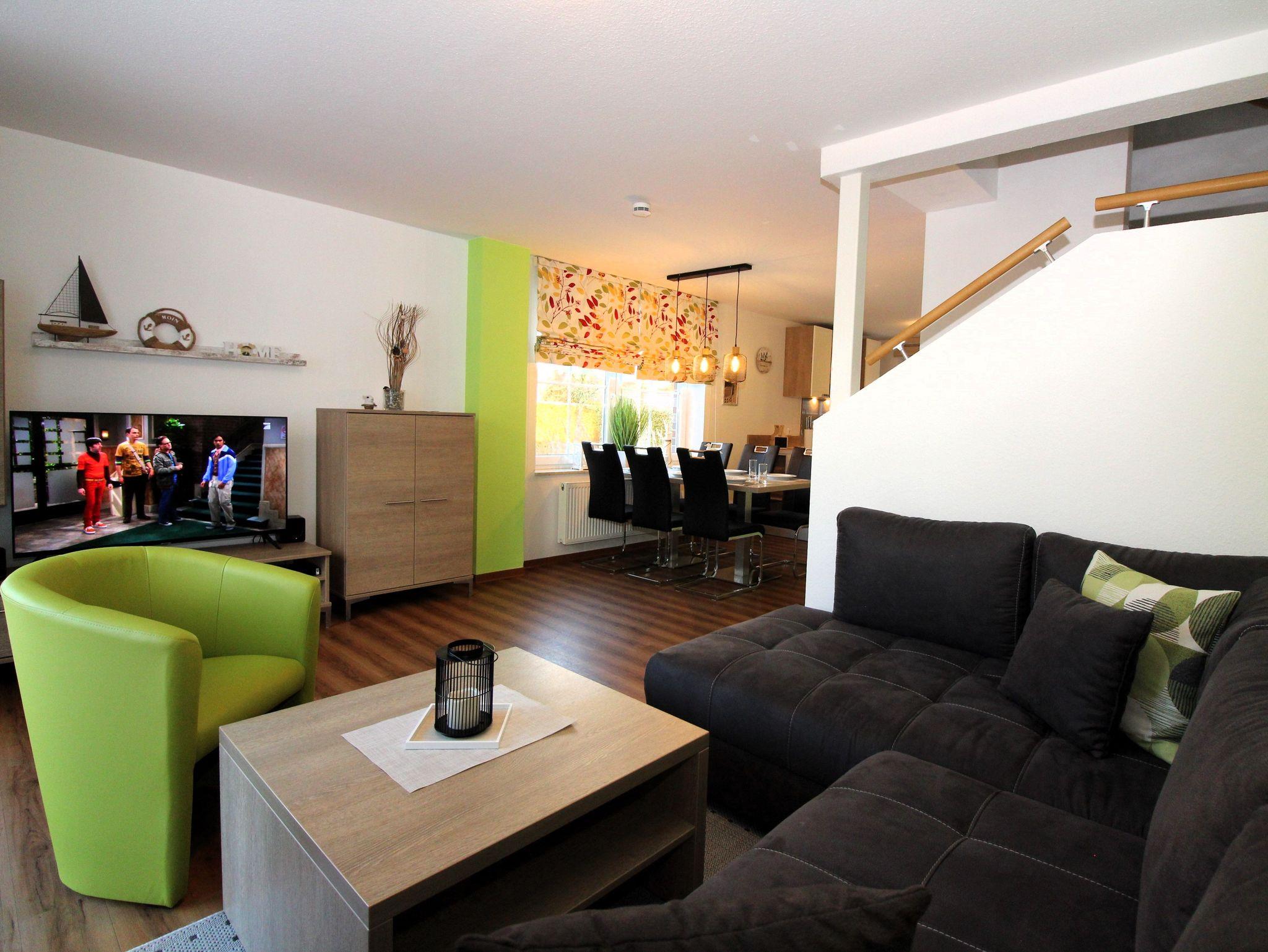 Unser Wohnbereich verfügt über eine moderne Sofaecke (ausziehbar), einen 55“-LED-Fernseher, einen Blu-ray-/DVD-Rekorder und eine Stereoanlage