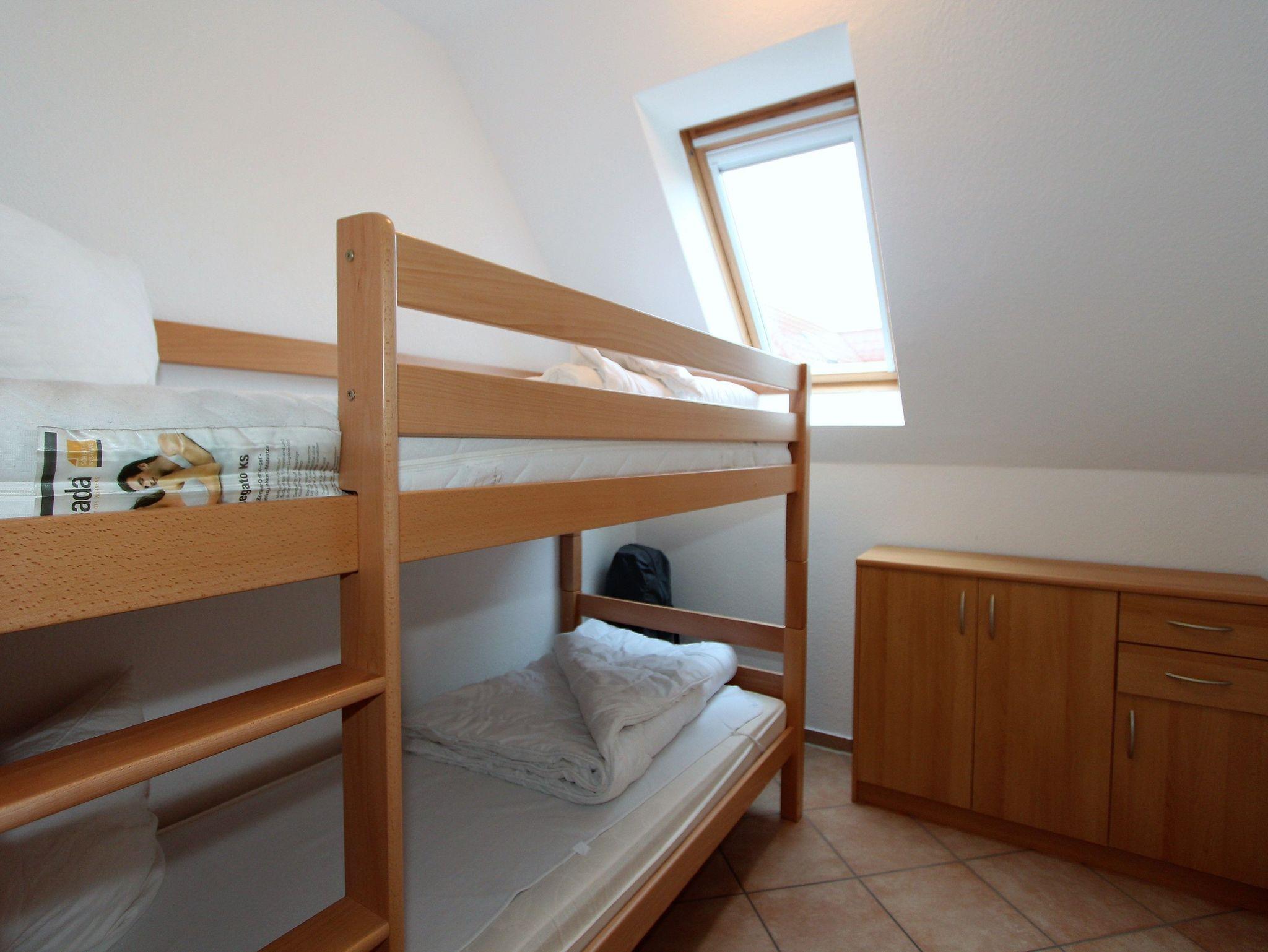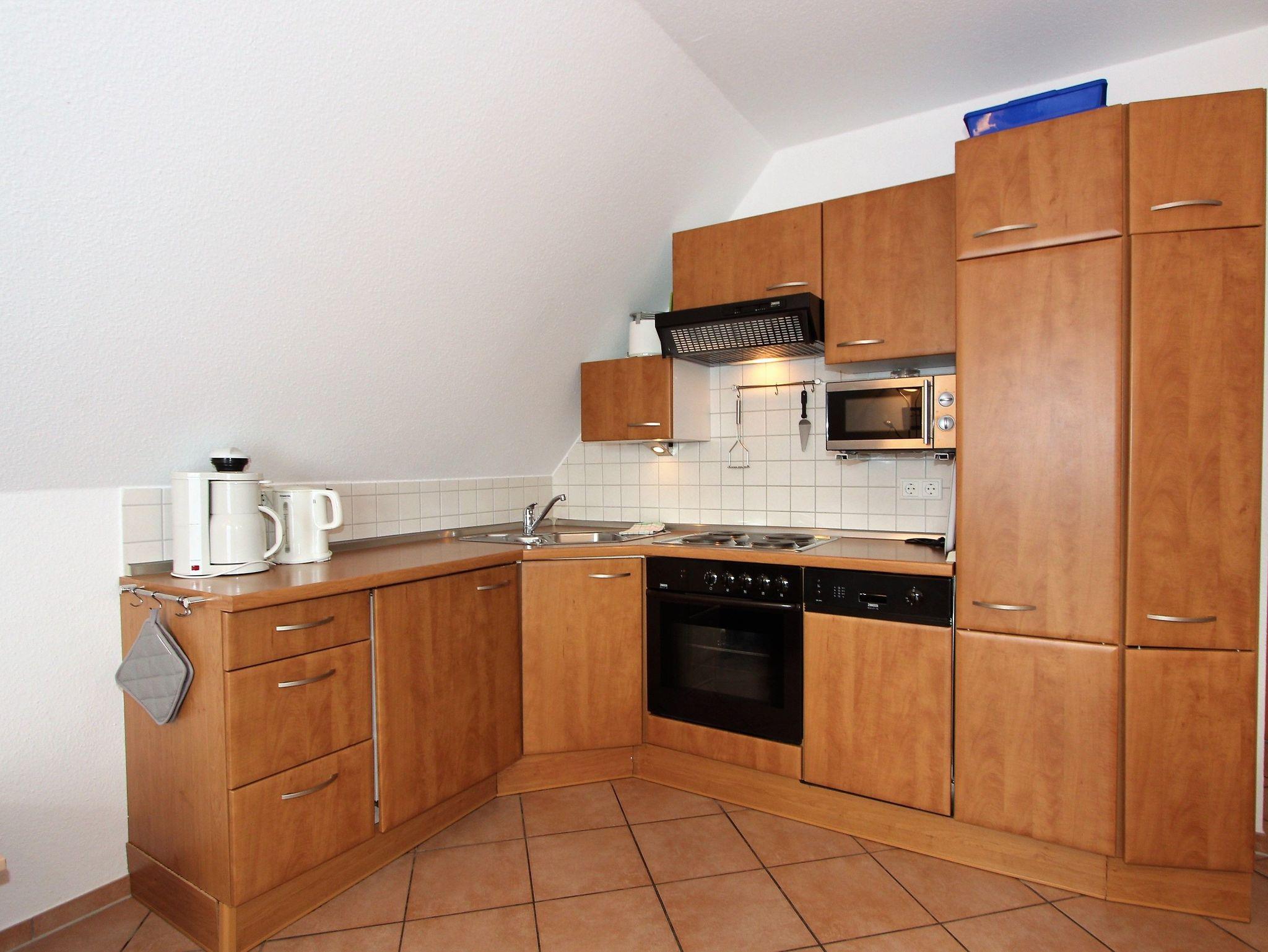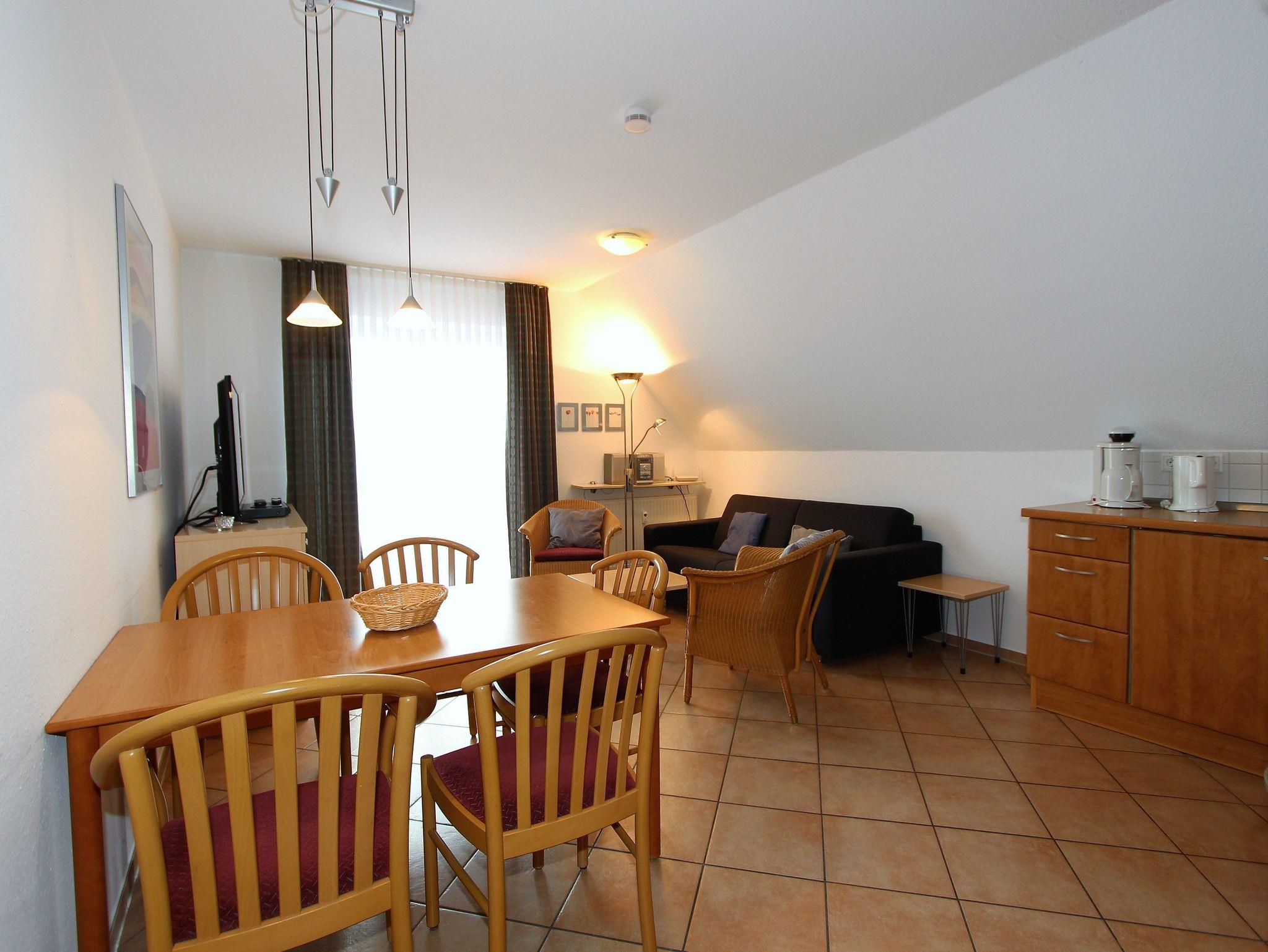 Sie wohnen in einem liebevoll eingerichteten 3-Zimmer-Appartement im 1. OG für bis zu 4 Personen auf ca. 56 m² Wohnflläche. Die Wohnung erreichen Sie über eine Außentreppe. Ein Schlafraum mit Doppelbett, ein Kinderzimmer mit einem Etagenbett, Wohn-/Schlafraum mit gemütlicher Couchgarnitur, separater Essplatz, voll ausgestattete Einbauküche mit Mikrowelle, Backofen und Geschirrspüler, Dusche/WC, TV, DVD-Player, Mini-HiFi-Anlage mit CD-Player und eine 16 m² große, sonnige, ruhige Terrasse, nach Südwesten ausgerichtet. Bequeme Sonnenliegen und ein Elektrogrill sind vorhanden. Die gesamte Wohnung ist mit schönen Kacheln ausgelegt. Ein Aussenstellplatz für PKW gehört zur Wohnung. Unsere Gäste haben freien Eintritt in die benachbarte Spielscheune und ins hauseigene Hallenschwimmbad, welches sie von der Wohnung aus über die Außentreppe bequem erreichen. Sauna, Dampfsauna und Solarium gegen Gebühr. Wir wünschen Ihnen einen angenehmen, erholsamen Aufenthalt.