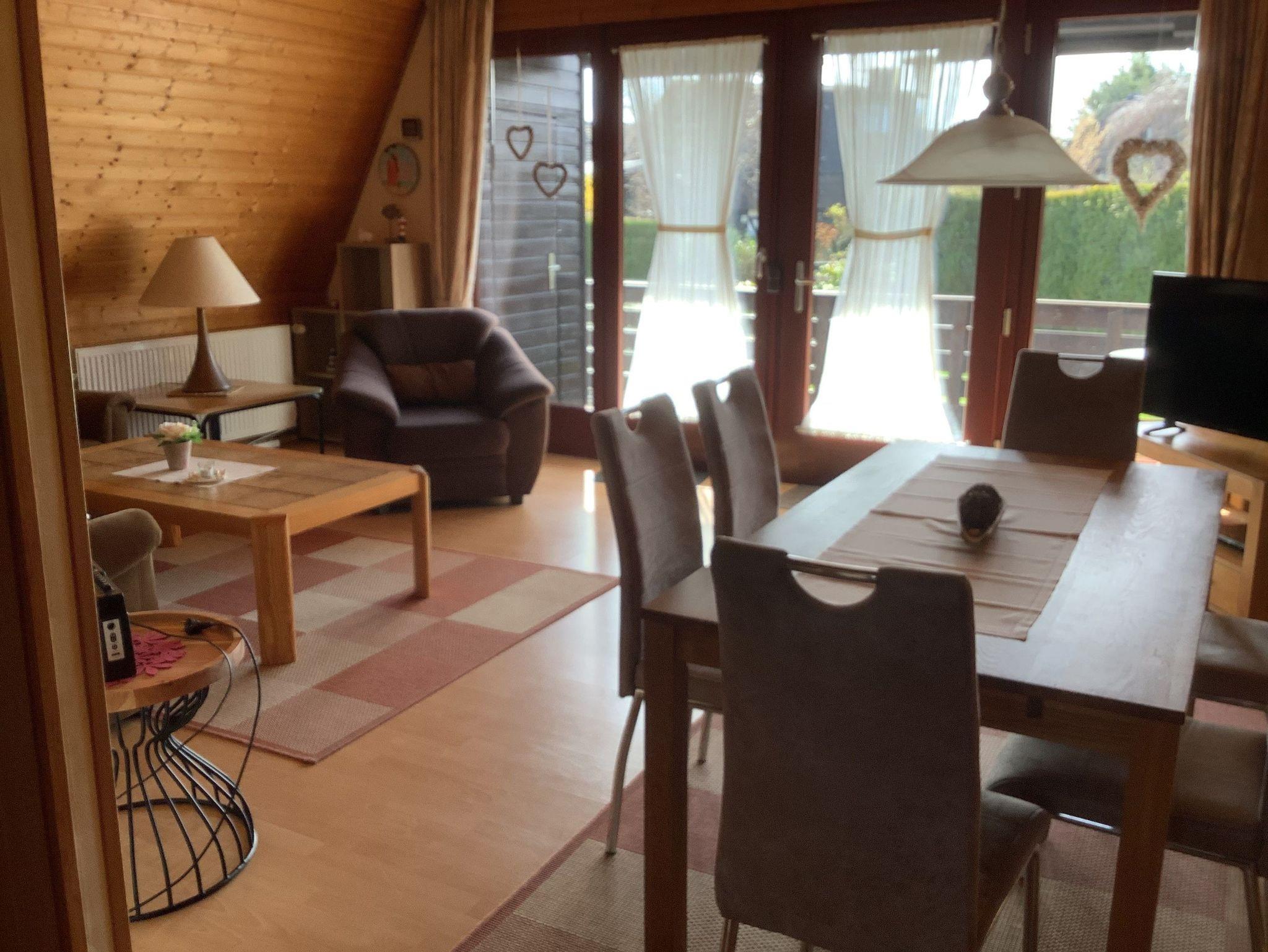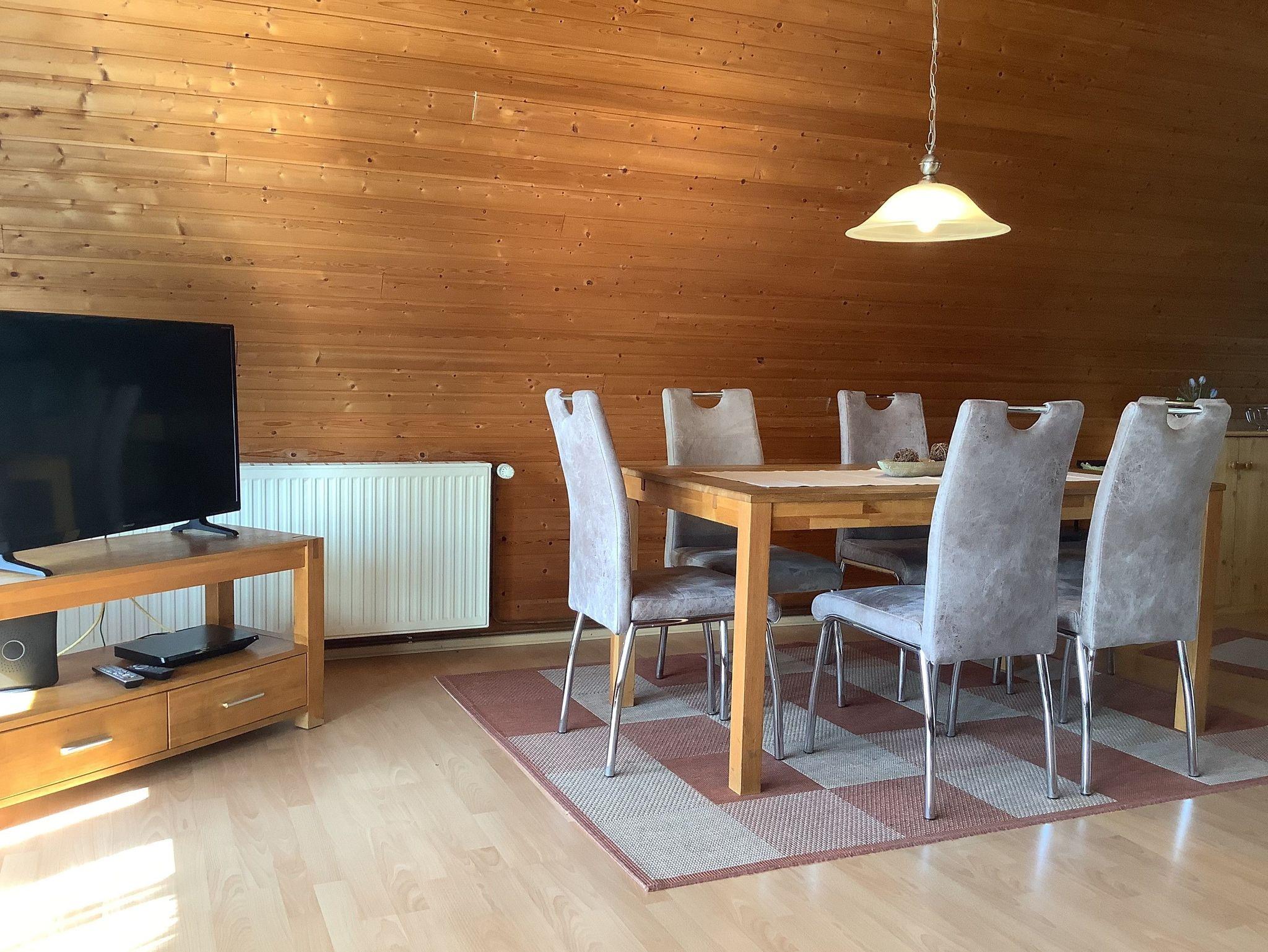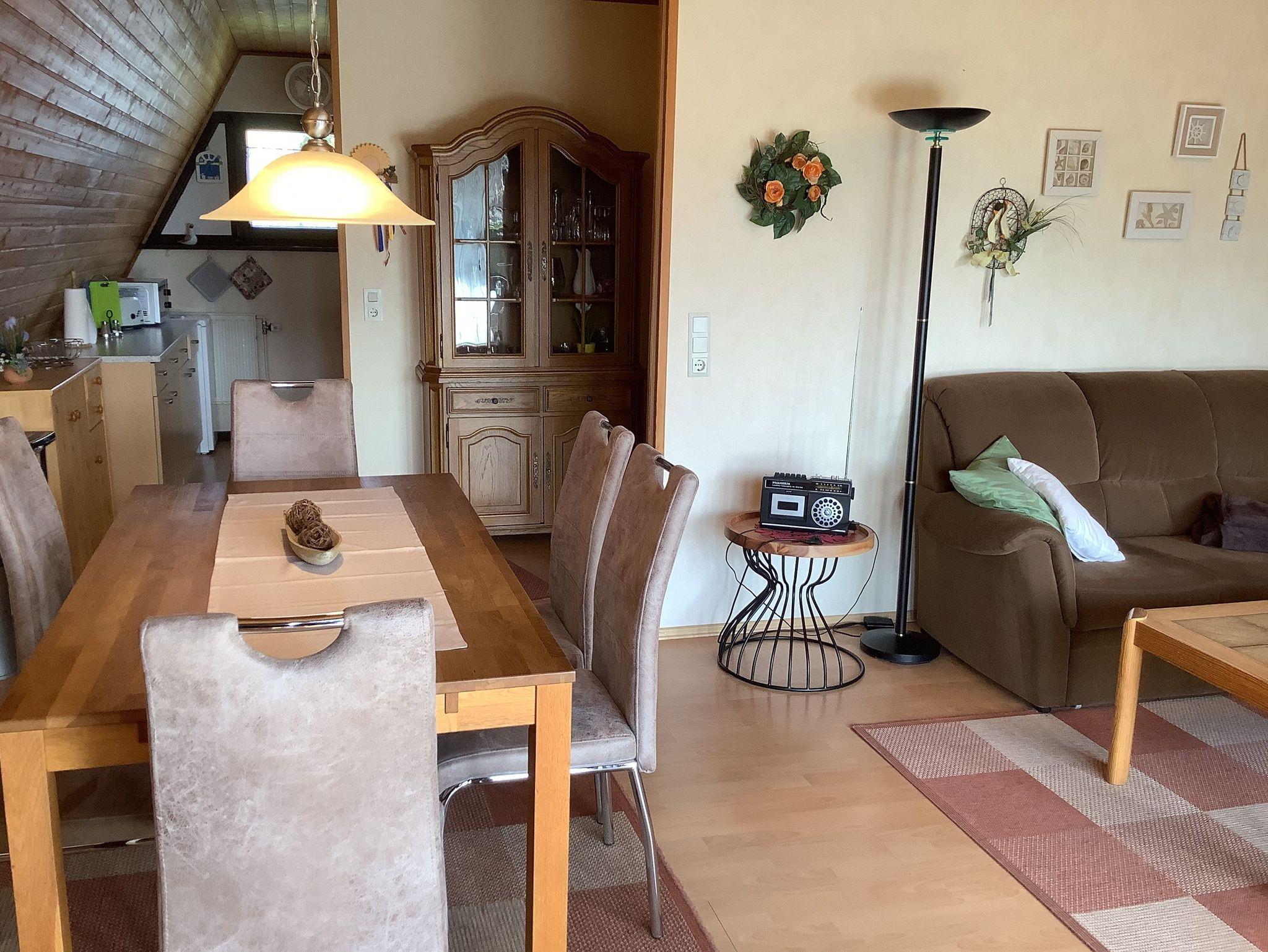Urgemütliches Ferienhaus im Stil einer Finnhütte, ca. 68 qm, für max. 4 Personen, Wohnraum mit Essecke, Küche Bad mit Dusche und WC