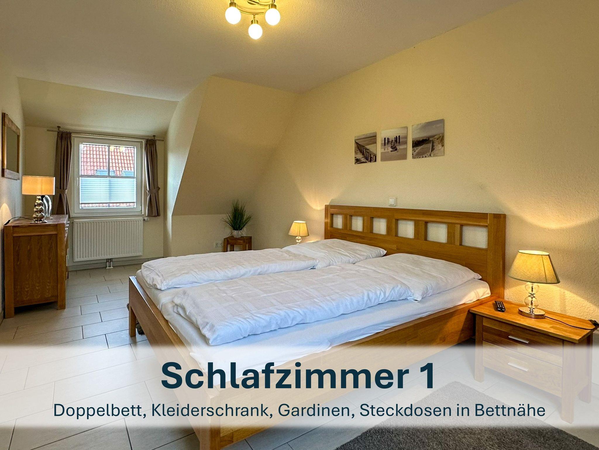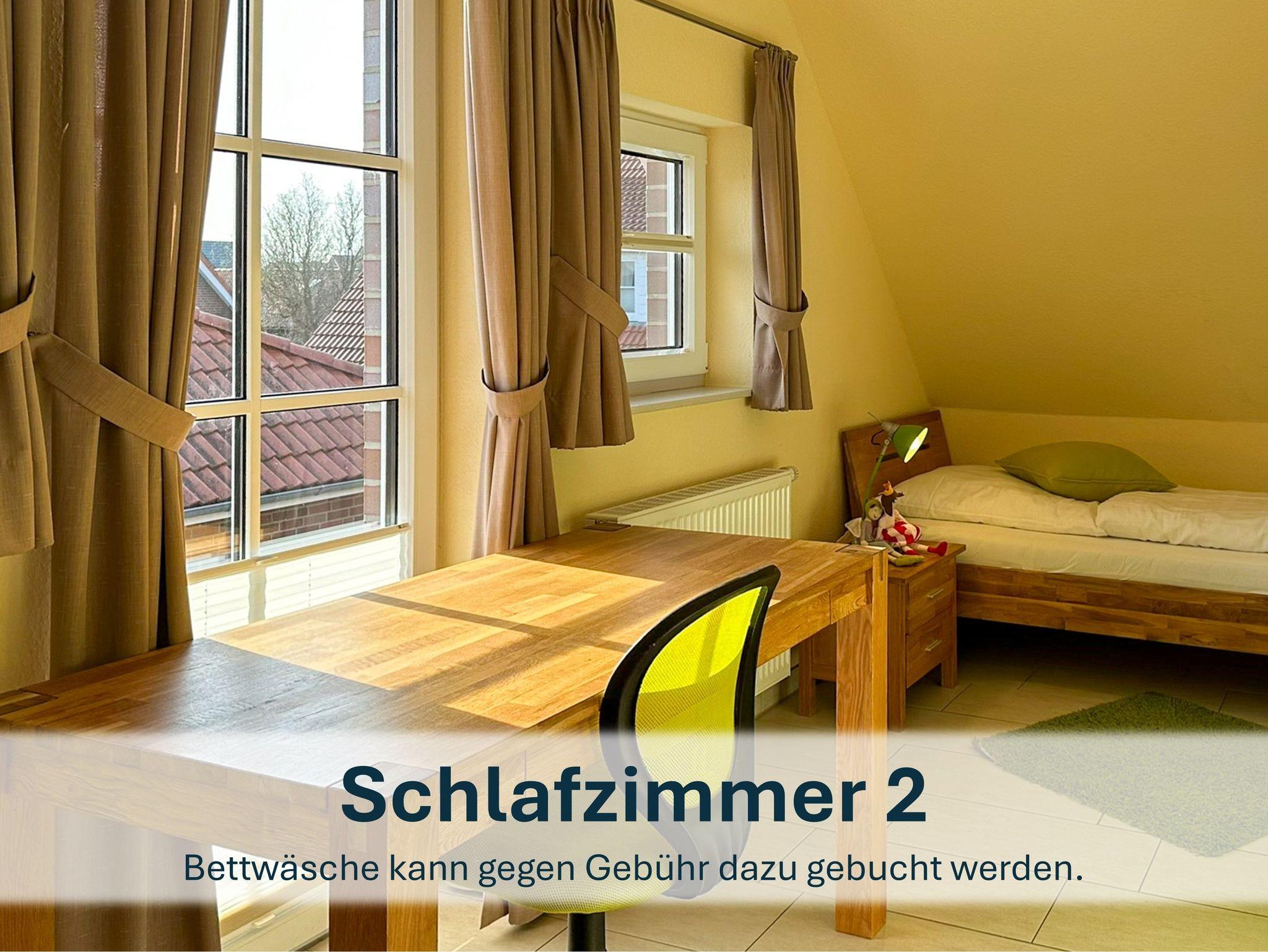 Über die Holztreppe im Flur gelnagen Sie in das Obergeschoss des Hauses.Hier befinden sich zwei weitere Schlafzimmer: ein Kinderzimmer mit zwei Einzelbetten und einem kleinen Schreibtisch, sowie ein Schlafzimmer mit Doppelbett und einer Kommode.