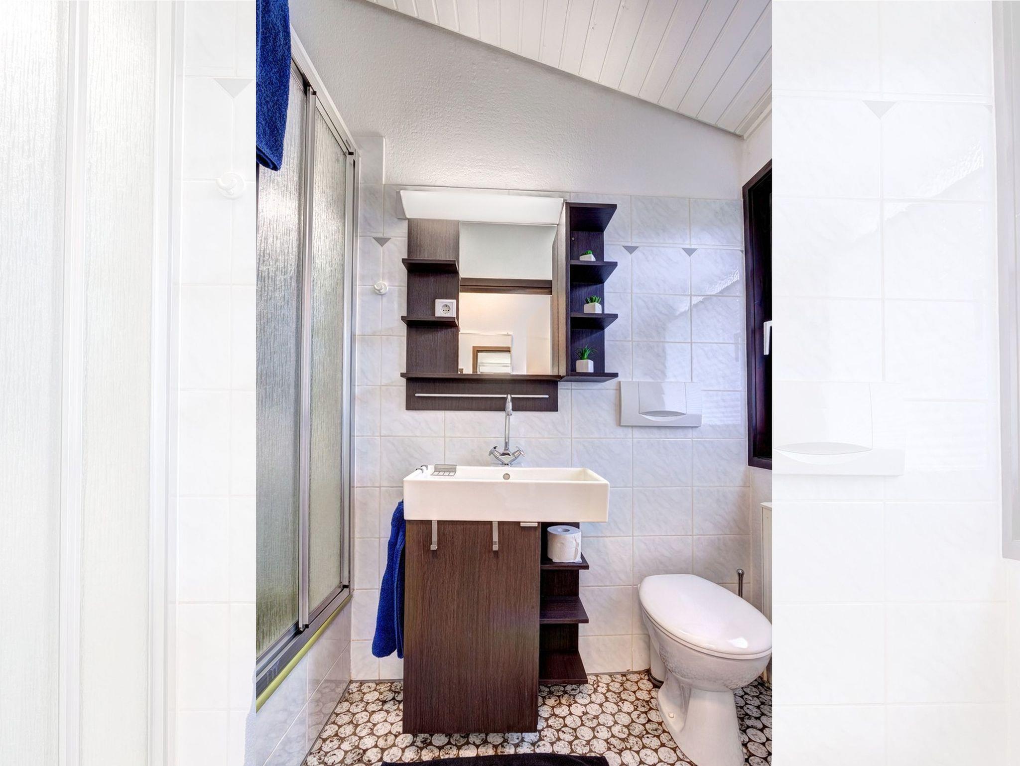 Das erste Schlafzimmer verfügt über ein Doppelbett, das zweite Schlafzimmer über drei Schlafmöglichkeiten, davon eines als Hochbett. Das Badezimmer verfügt über eine Dusche, ein WC und ein Waschbecken. Außerdem können Sie in einem kleinen Abstellraum Ihre Habseligkeiten verstauen.