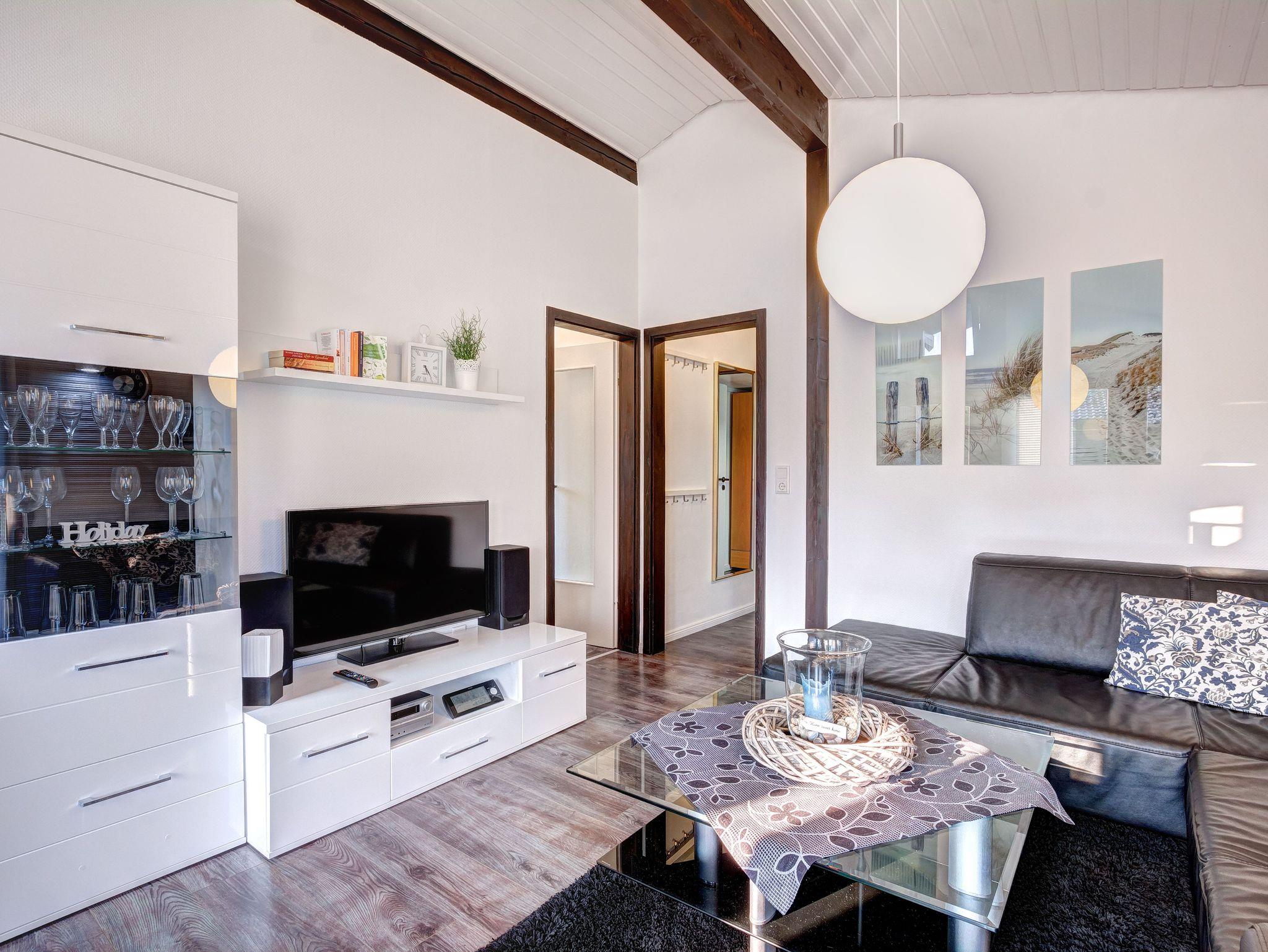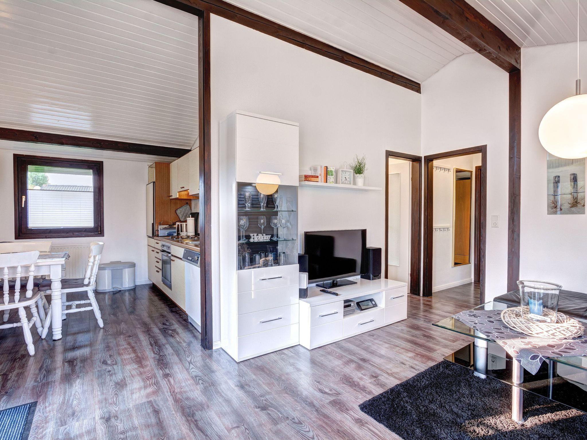 Der freistehende Ferienbungalow im Fachwerkstil bietet auf 65m² ausreichend Platz für vier Erwachsene und einem Kleinkind bis 2 Jahre. Im Wohnraum befinden sich komfortable Sitzmöglichkeiten, ein Fernseher und eine offene, vollständig ausgestattete Küche. Von hier können Sie auf Ihre eigene Sonnenterrasse treten und das herrliche Nordseewetter genießen.