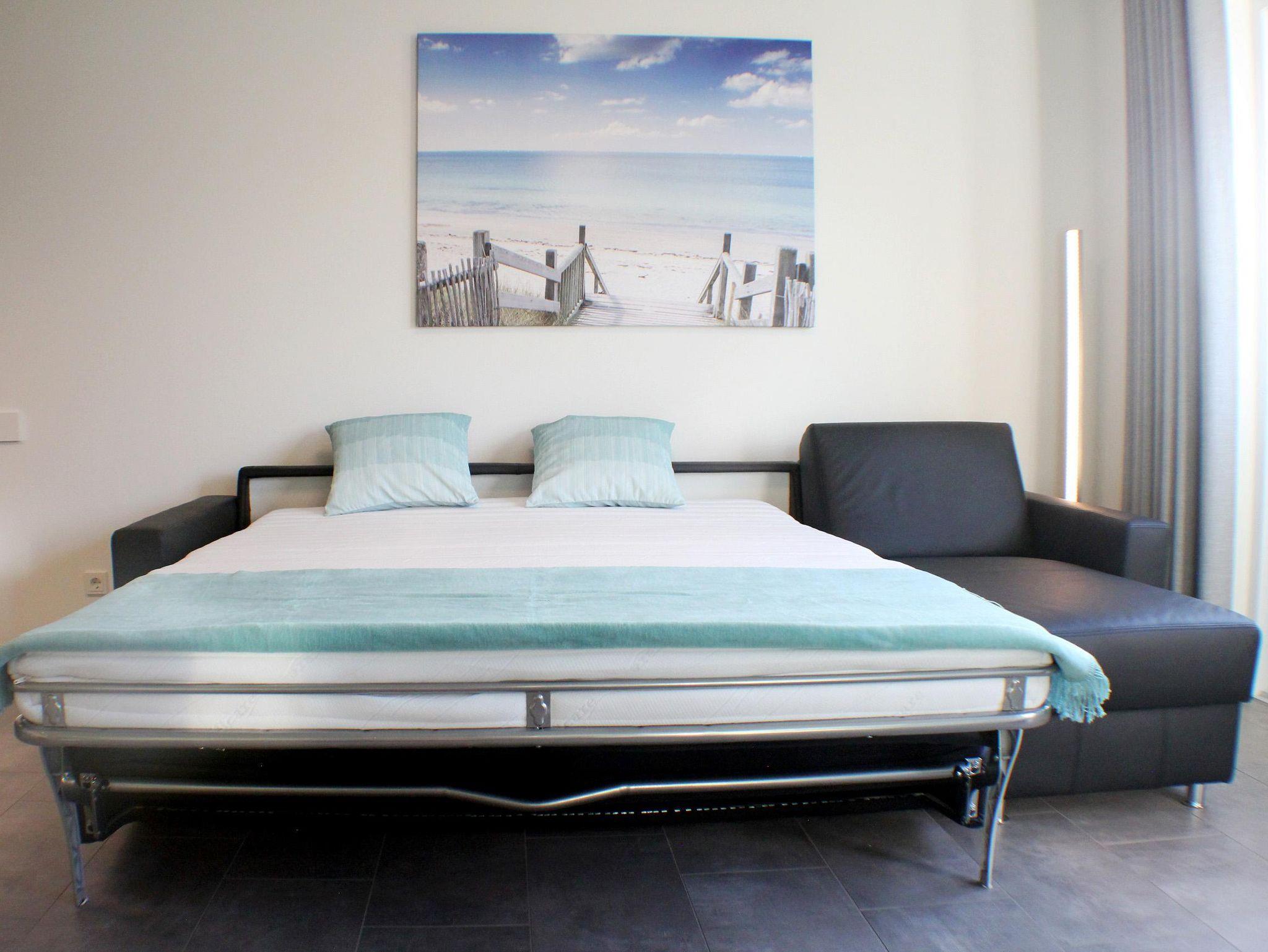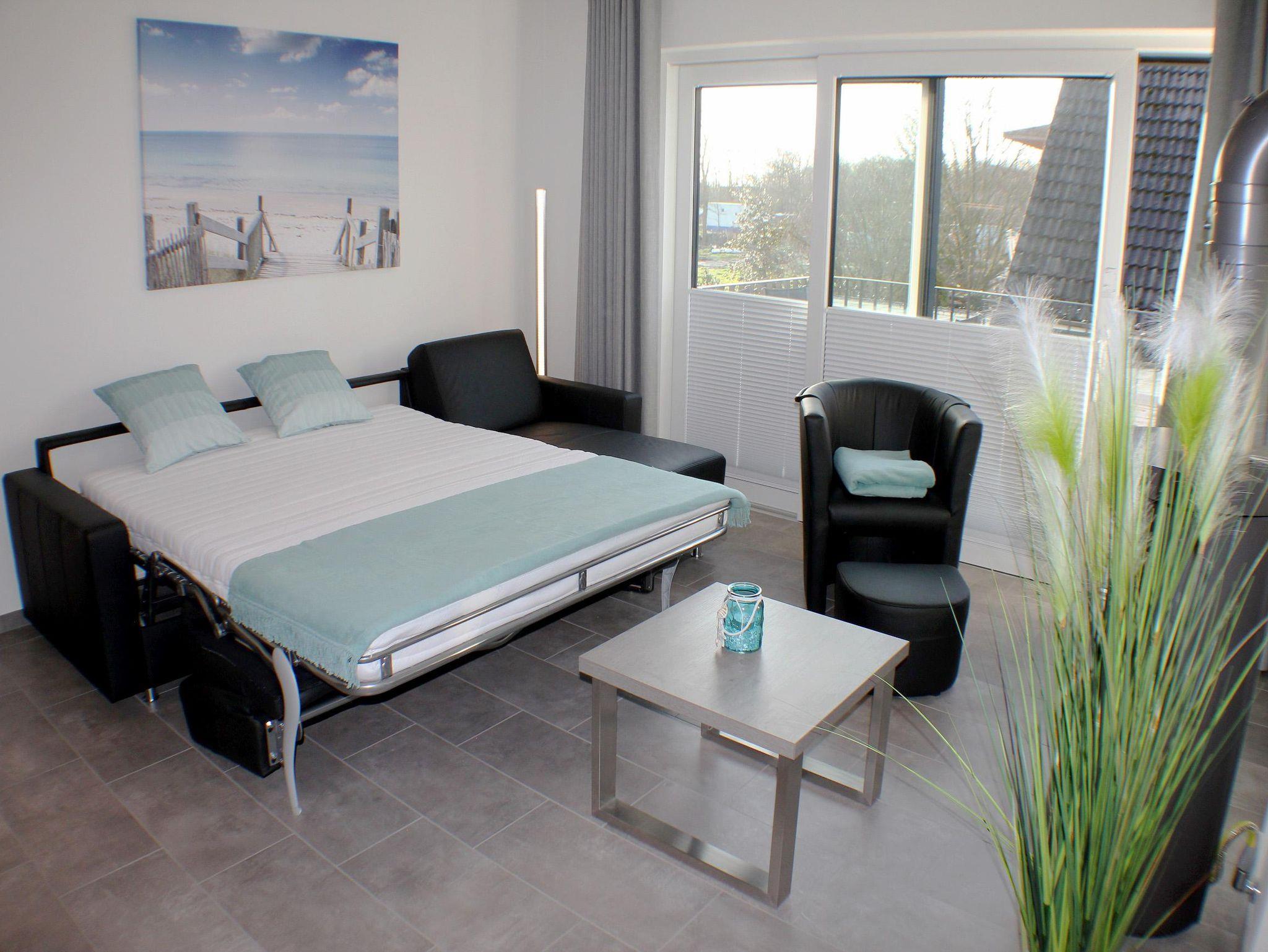 Das Wohnzimmer ist für gemütliche Abendstunden gewappnet und gibt Ihnen die Möglichkeit, mithilfe einer guten Lektüre oder einem spannenden Film den Tag auf dem gemütlichen Sofa ausklingen zu lassen. An kühleren Tagen sorgt die Fußbodenheizung für eine angenehme Atmosphäre. Für einen noch größeren Wohlfühlfaktor können Sie im Gaskamin ein loderndes Feuer entzünden. Das Schlafsofa ist mit einer hochwertigen Matratze (160 x 200 cm) ausgestattet und bietet für zwei weitere Gäste eine erholsame Nachtruhe.