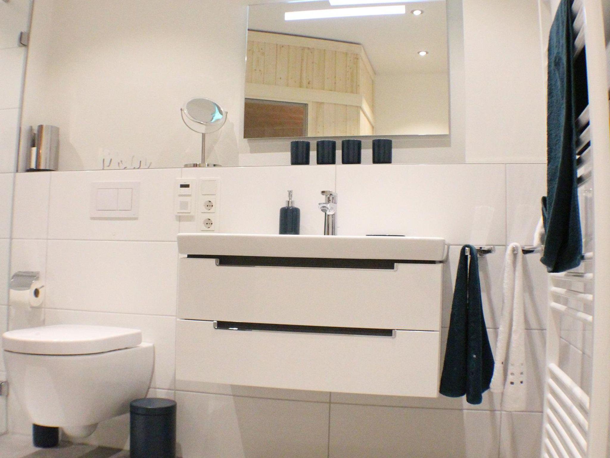 Badezimmer: Radio, Sauna, Föhn, WC, Waschbecken, Kosmetikspiegel, Fußbodenheizung, Spiegel, Steckdosensicherung, Dusche (bodengleich)