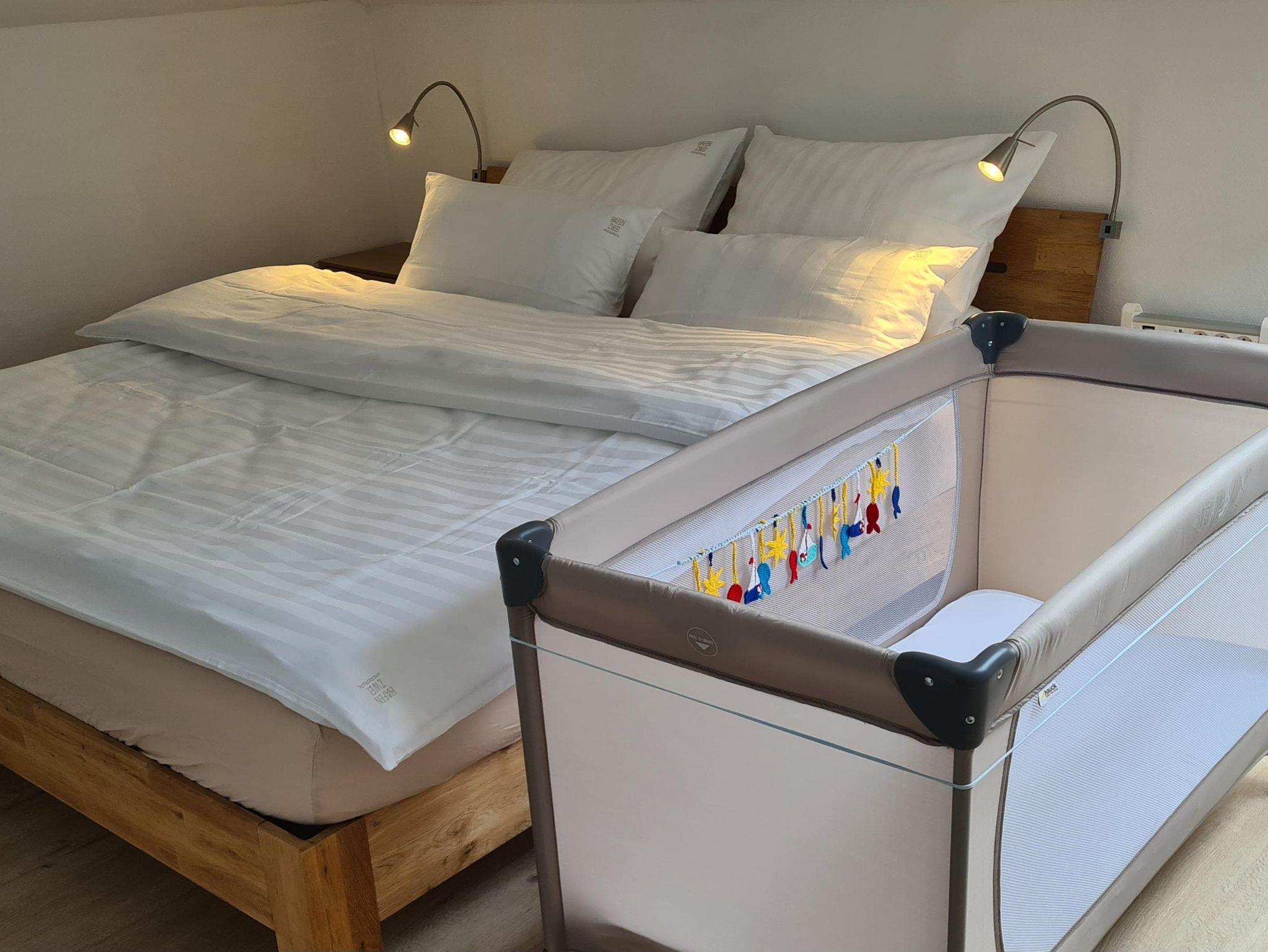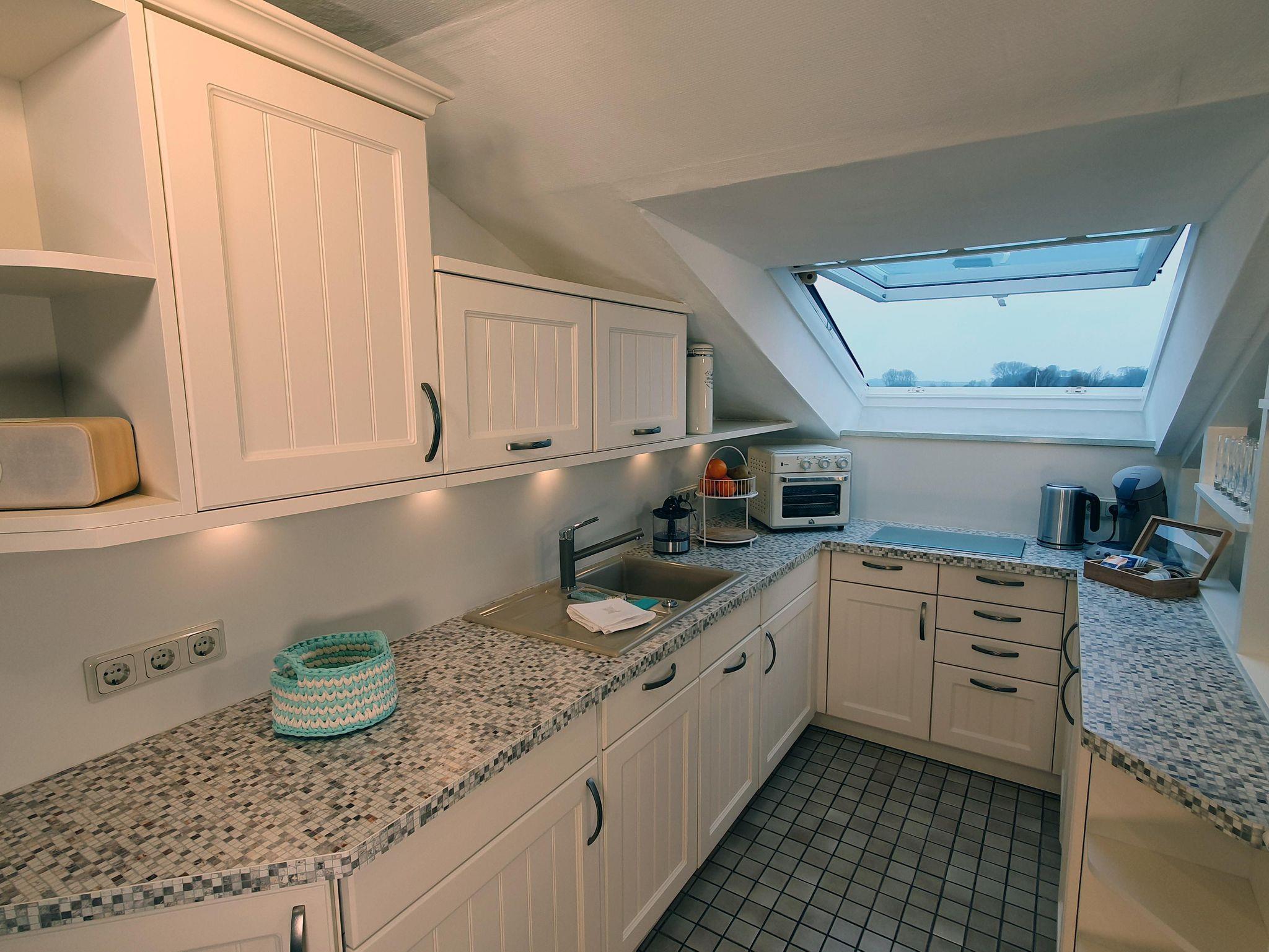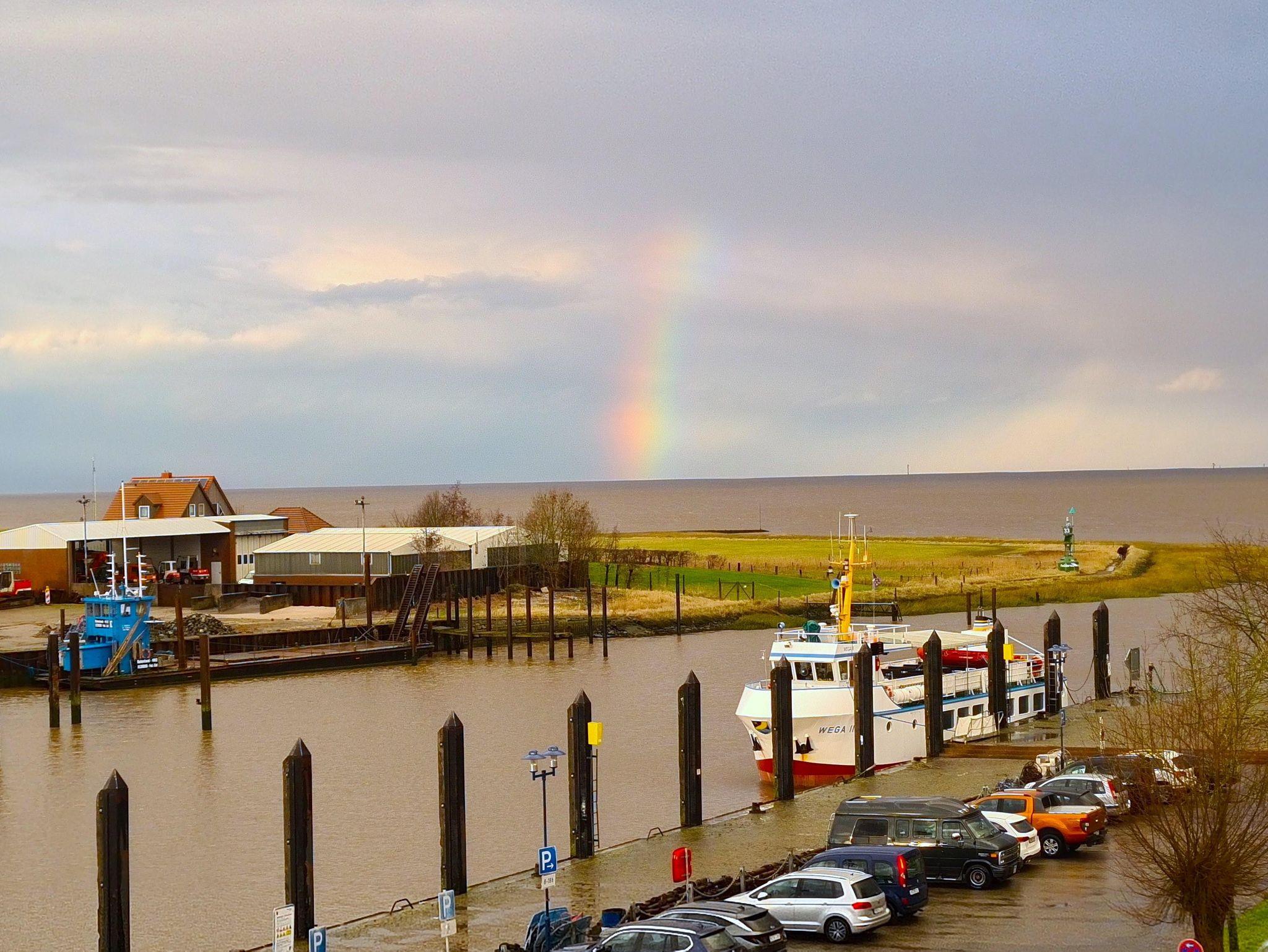 Beim Betreten der Wohnung im Dachgeschoss in der zweiten Etage gelangen Sie in einen kleinen Flur mit Garderobe, Spiegeln und Schränken mit reichlich Stauraum. Zur linken Seite befindet sich das Badezimmer mit WC, Eckdusche und Badewanne. Ihr Bad können Sie unter einem künstlichen Sternenhimmel genießen. Der echte Sternenhimmel ist durch das Dachfenster zu beobachten. Wenn Sie vom Flur weiter geradeaus gehen, gelangen Sie in den Wohnraum mit abgetrennter Küche. In der sehr gut ausgestatteten Küche befinden sich als Sonderausstattung ein Geschirrspüler, eine Waschmaschine/Wäschetrockner, ein kleiner Backofen und ein Induktionskochfeld. Damit stehen Ihrem genussvollen Essen keine Hindernisse im Weg. Ihren duftenden Kaffee können Sie in einer Senseo, Filterkaffeemaschine oder Frenchpress zubereiten, eine kleine Auswahl an Teesorten steht ebenfalls für Sie bereit. Im Wohnraum erwartet Sie eine hohe Esstheke mit Barhockern für ein wohlschmeckendes Essen mit einem traumhaften Blick auf den Hafen, die Marsch, den Nationalpark und die Nordsee. Von langen Wanderungen an der Küste können Sie sich auch auf dem Sofa erholen. Ein Smart-TV erlaubt Ihnen die Nutzung von kostenfreien Streamingdiensten. Eine Sennheiser Ambeo Soundbar plus sorgt für den richtigen Sound. Mobiles Arbeiten ermöglicht ein kleiner Tisch mit zwei Stühlen. Hier steht auch ein ausklappbares komfortables Schlafsofa für 2 Personen. Hinter dem Wohnzimmer schließt sich das Schlafzimmer an, in dem ein weiterer Tisch mit Stuhl, ein Kleiderschrank und zusätzlicher Stauraum genutzt werden können. Das Doppelbett hat eine komfortable Breite von 180cm, Bettdecken und Kopfkissen sind Allergiker freundlich, daher sind Haustiere leider nicht erlaubt. Im Schlafzimmer ist ein Dachfenster, von dem aus Sie ebenfalls auf die Nordsee gucken können. Alle Dachfenster sind verdunkelbar und sind, bis auf das Bad mit Insektengittern versehen. Ebenfalls Am Hafen, nur ein paar Meter entfernt, können Sie gepflegt im Restaurant Dat Havenhuus oder dem Restaurant Nordseeblick speisen.