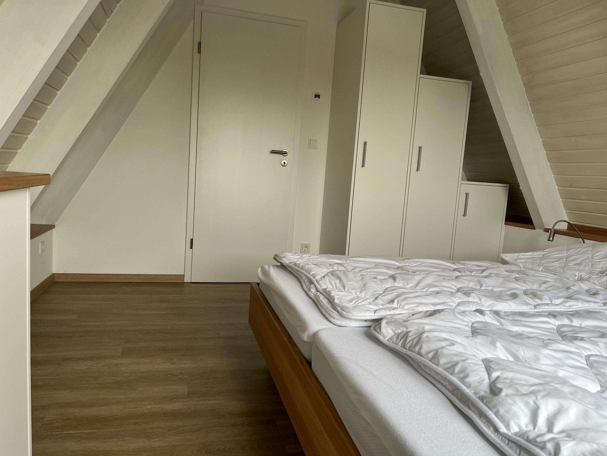 Im OG befinden sich 2 Schlafzimmer. Das Elternschlafzimmer ist mit einem Doppelbett, einem Kleiderschrank, sowie einem Flachbildfernseher ausgestattet. Hier kann zusätzlich das vorhandene Klappbett und ein Baby-Reisebett aufgestellt werden. (Auch für sind eine separate Matratze, Bettdecke und Kissen vorhanden) Im zweiten Schlafzimmer sind zwei Einzelbetten. Beide Schlafzimmer sind mit Insektenschutzrahmen und abdunkelnden Gardinen ausgestattet, sodass auch die Kinder im Urlaub etwas länger schlafen können. An der Treppe ist ein Treppenschutzgitter angebracht.