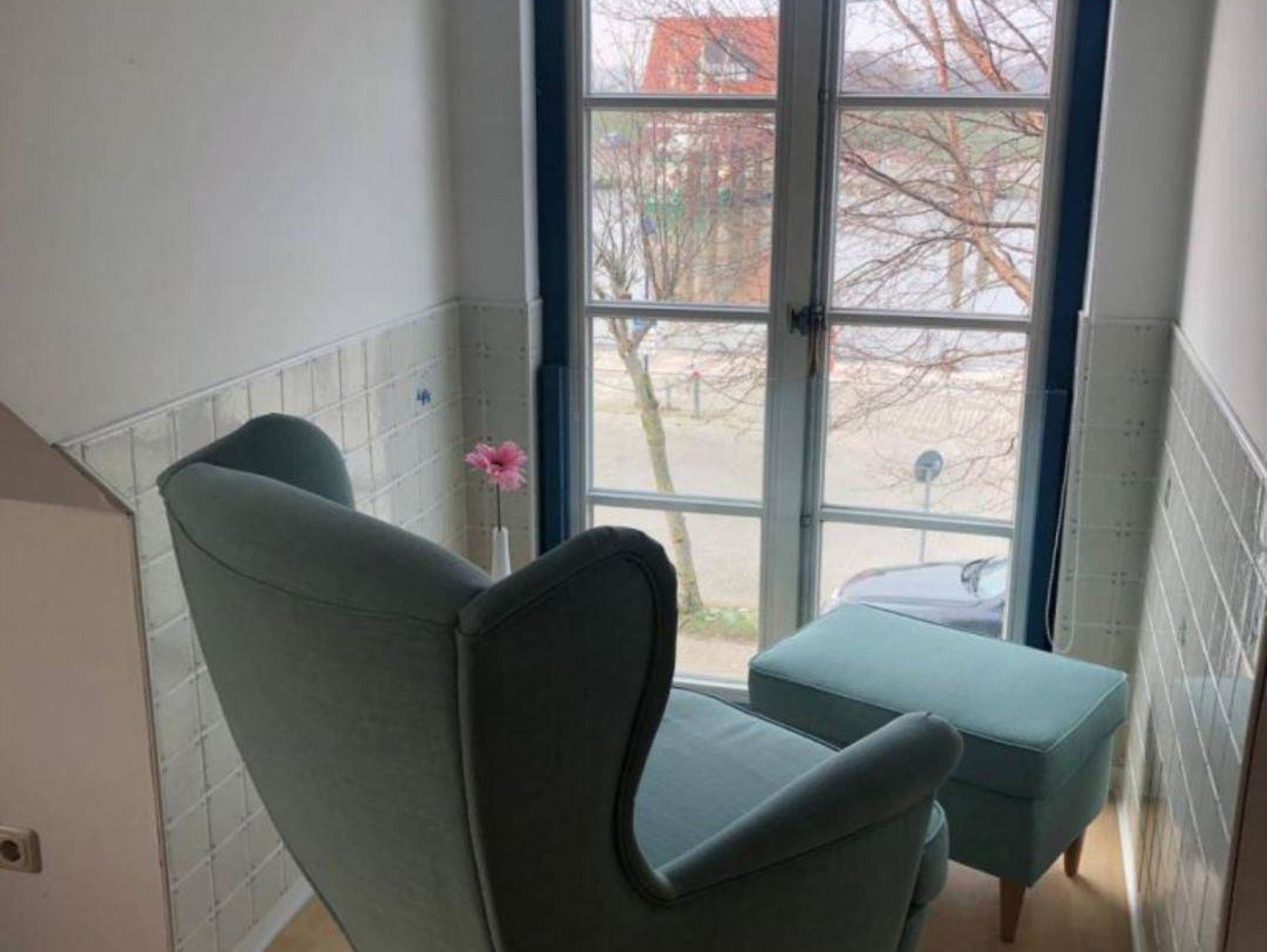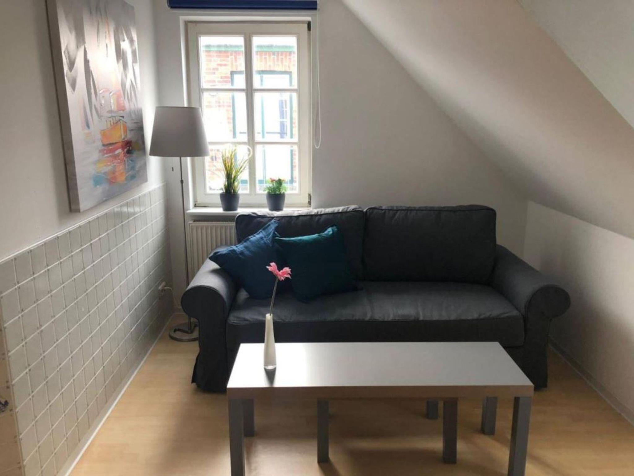 Im Wohnzimmer können Sie gemütlich im Sessel sitzen und durch die großen Fenster in der Dachgaube die Schiffe im Hafen von Fedderwardersiel beobachten. Bei guter Sicht sehen Sie vielleicht sogar von Weitem die Containerschiffe auf der Nordsee.