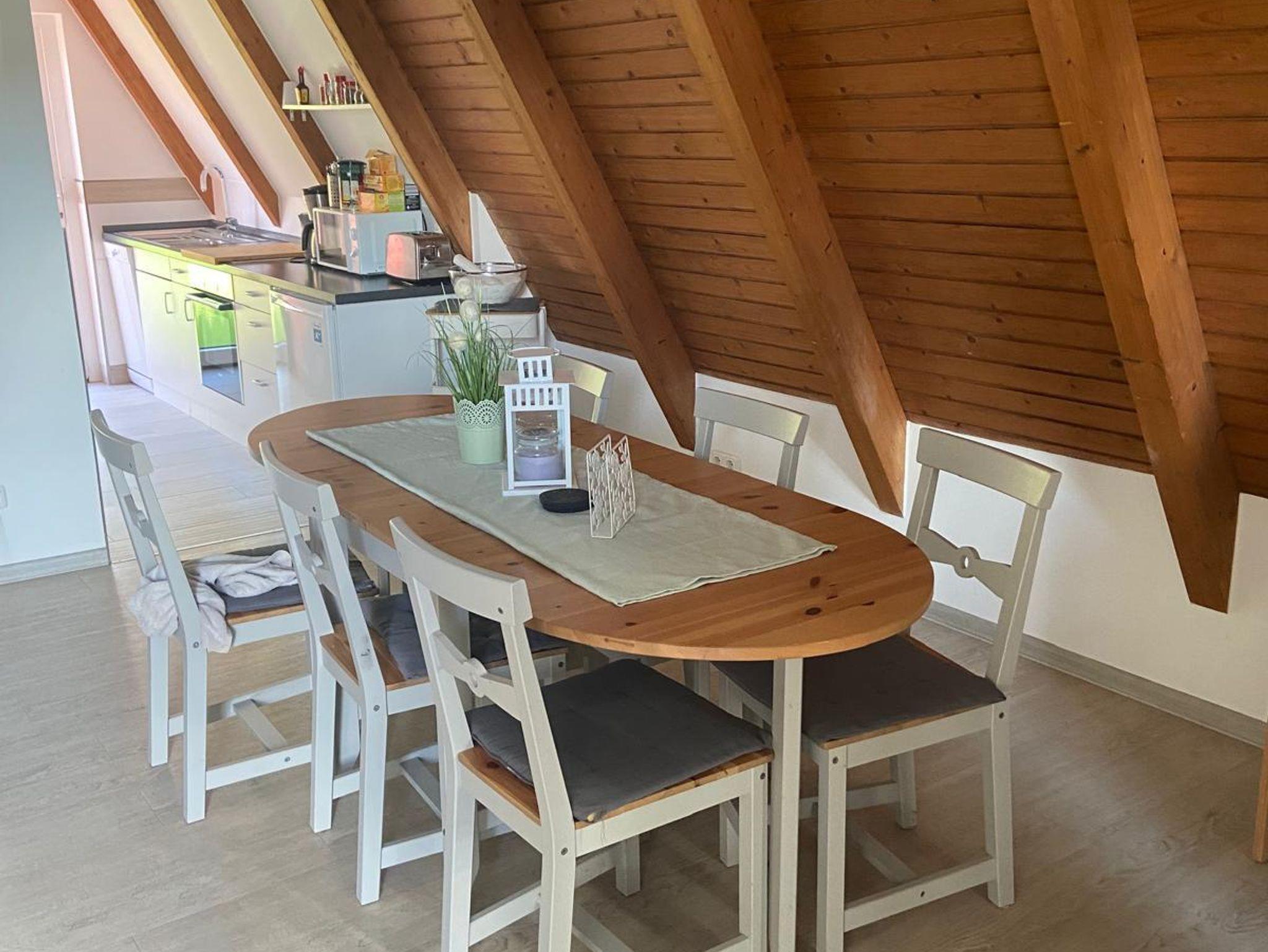 Das Haus wurde 2019 renoviert. Im Erdgeschoss befindet sich Wohn/Esszimmer mit TV und Radio und Sitzecke. Ein Duschbad mit WC und Waschbecken und ein Schlafzimmer mit Doppelbett ( 1,80x200) Die Küche ist ausgestattet mit Kühlschrank, Mikrowelle, Kaffeemaschine,Geschirrspüler uvm. über eine Raumspartreppe gelangt man in das Obergeschoss, dort befinden sich zwei seperate Schlafzimmer 1 x Doppelbett ( 1,80x200) und 1 mit 2 Einzelbetten. Terrasse und Gartengrundstück sind direkt am Haus und vom Wohnzimmer aus zu erreichen. Ein Parkplatz befindet sich ebenfalls direkt am Haus. Auf der Terrasse stehen Ihnen Sitzmöbel und ein Sonneschirm zur Verfügung.