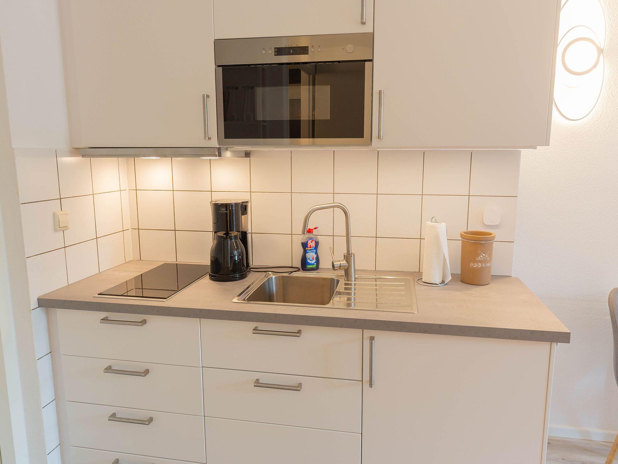Hier urlauben der Single und das Paar auf einer Ebene. Vom großzügigen Flurbereich gelangen Sie in den großen hellen Raum mit zunächst links der modernen Küchenzeile mit 2-Platten-Ceranfeld und integrierter Mikrowelle sowie einen vorgelagerten Esstisch mit zwei Stühlen. Gegenüber das gemütliche Doppelbett mit Kleiderschrank und einem Relaxsessel daneben.
