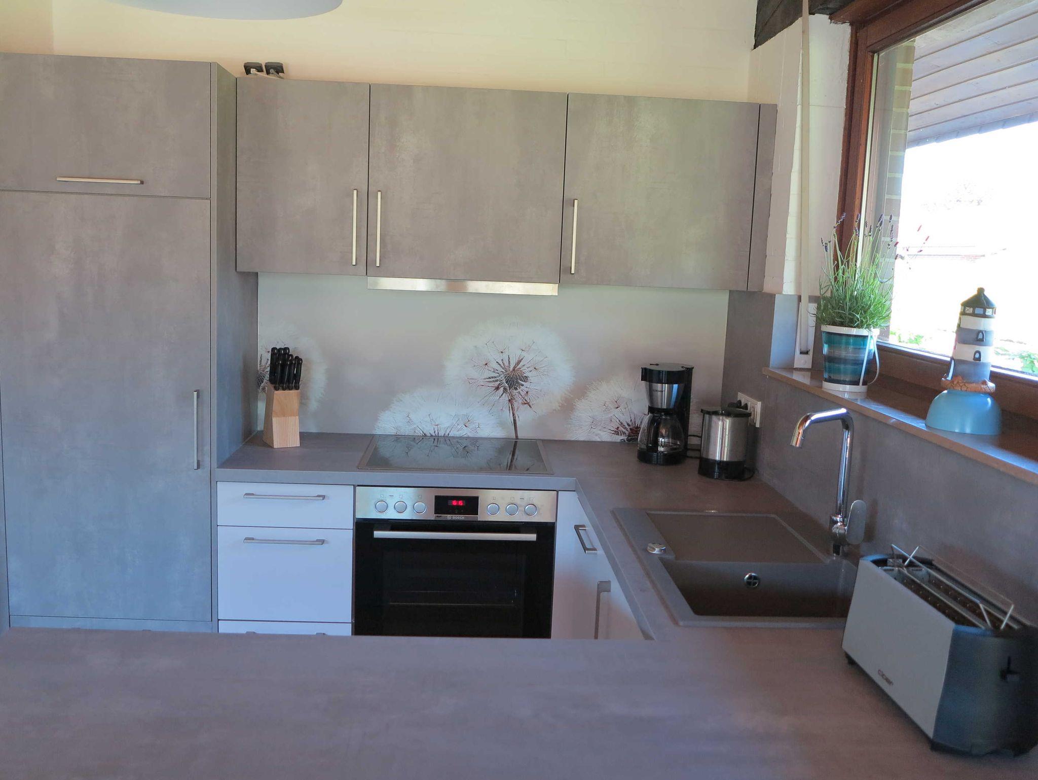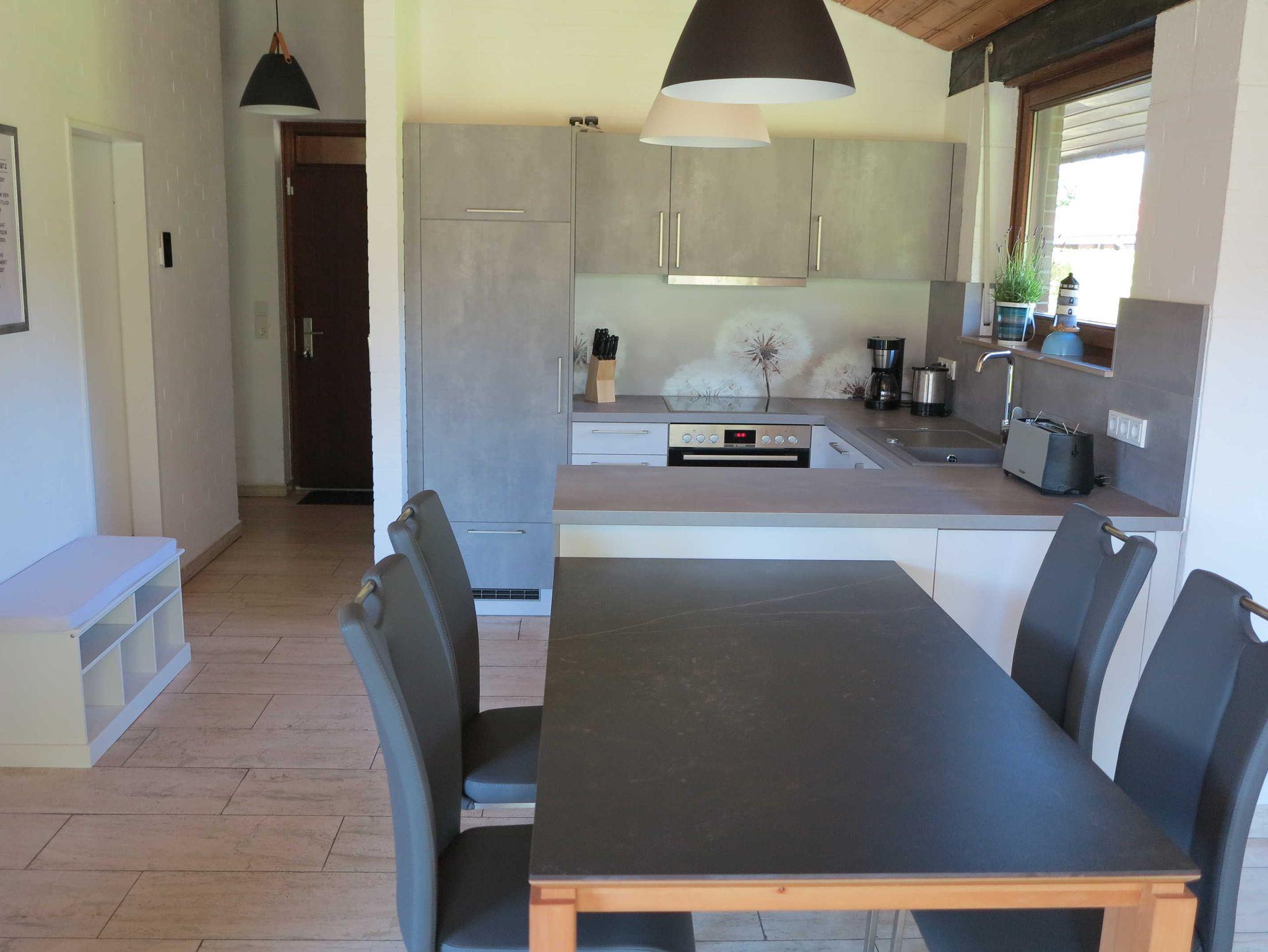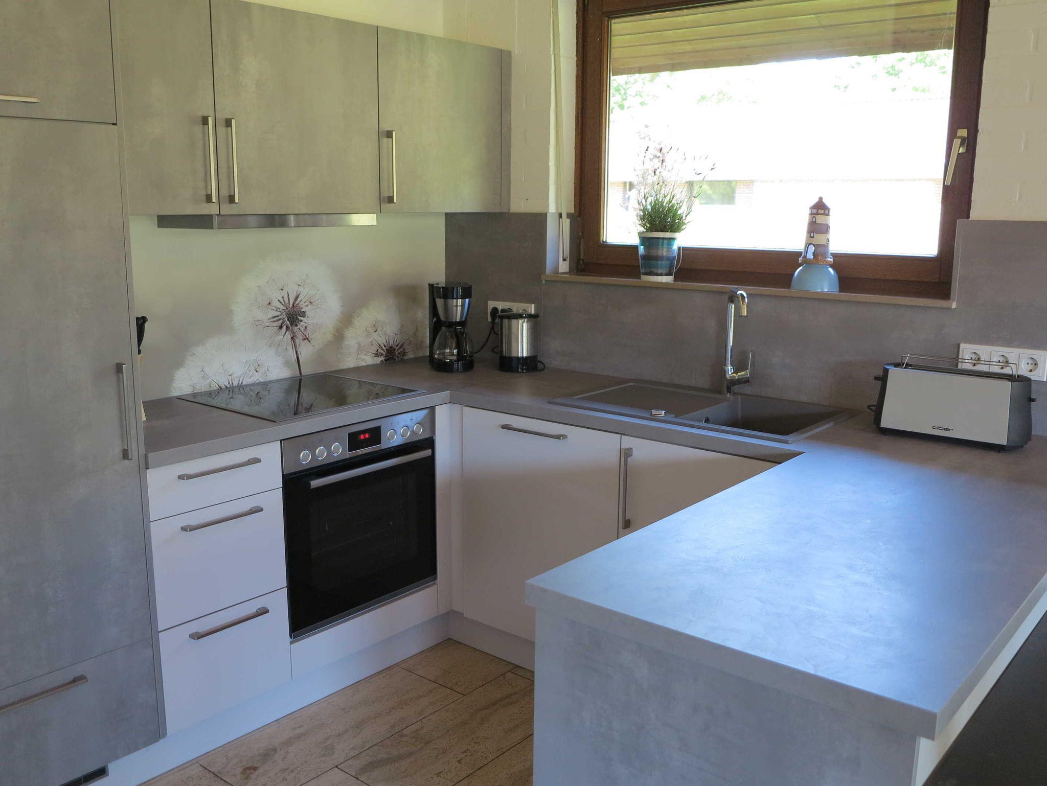 Offene Küche mit Ceranfeld, Backofen, Kühlschrank mit Gefrierfach, Geschirrspüler, Kaffeemaschine, Wasserkocher, Toaster.