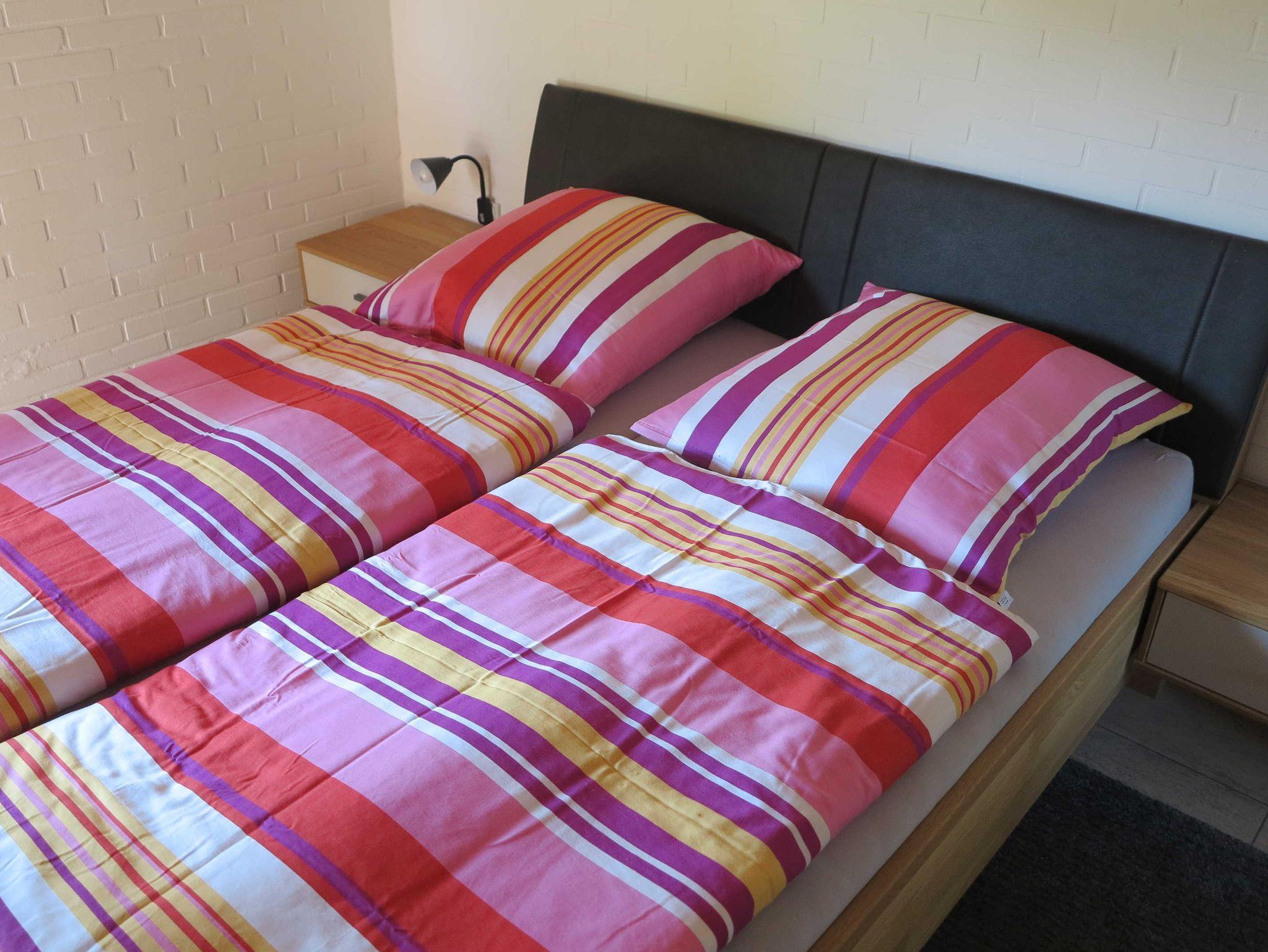 Ein Schlafzimmer mit Doppelbett (1,80 x 2 m), Nachtschränkchen und Kleiderschrank, ein Schlafzimmer mit Etagenbett und Kleiderschrank.