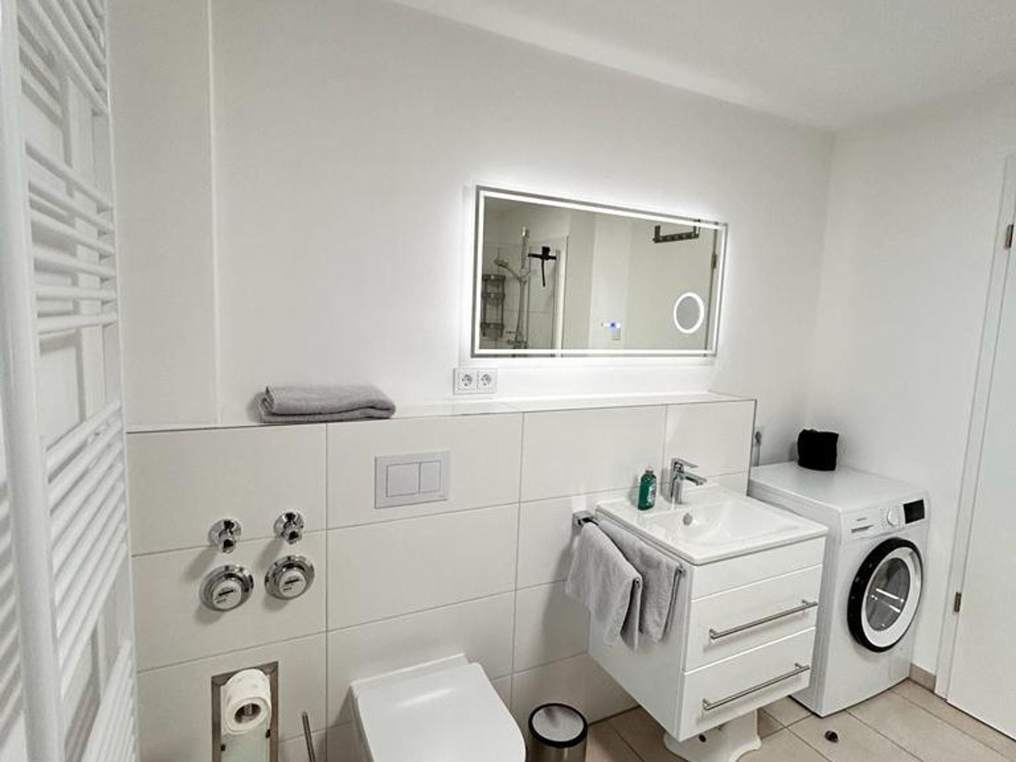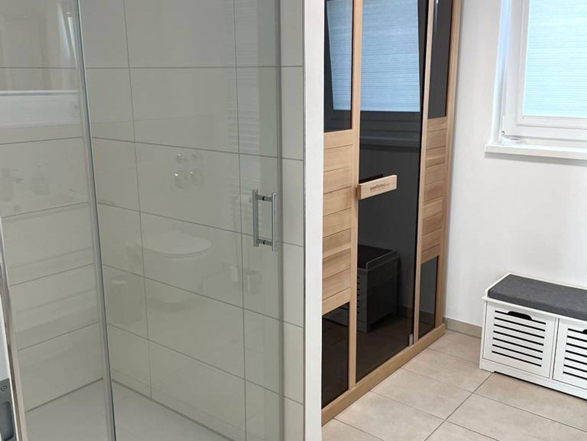Das Bad ist mit einer geräumigen begehbaren Dusche, Waschbecken und einem WC ausgestattet. Zudem befindet sich hier eine Infrarotkabine (keine klassische Sauna), sowie eine Waschmaschine.