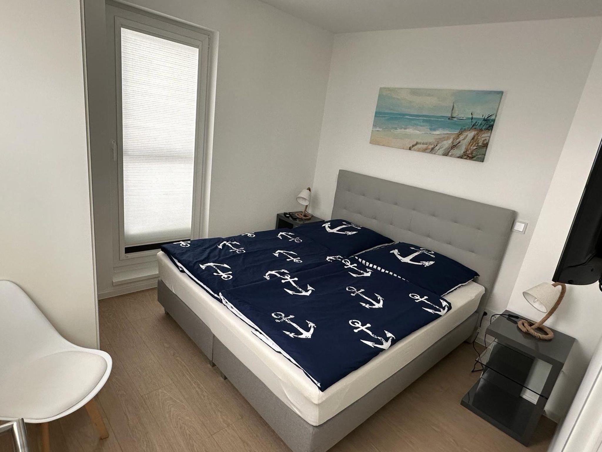 Das Elternschlafzimmer ist mit einem sehr bequemen Boxspringbett der Größe 180 x 200 cm mit getrennten Matratzen sowie einem geräumigen Schrank und einem Stuhl ausgestattet.