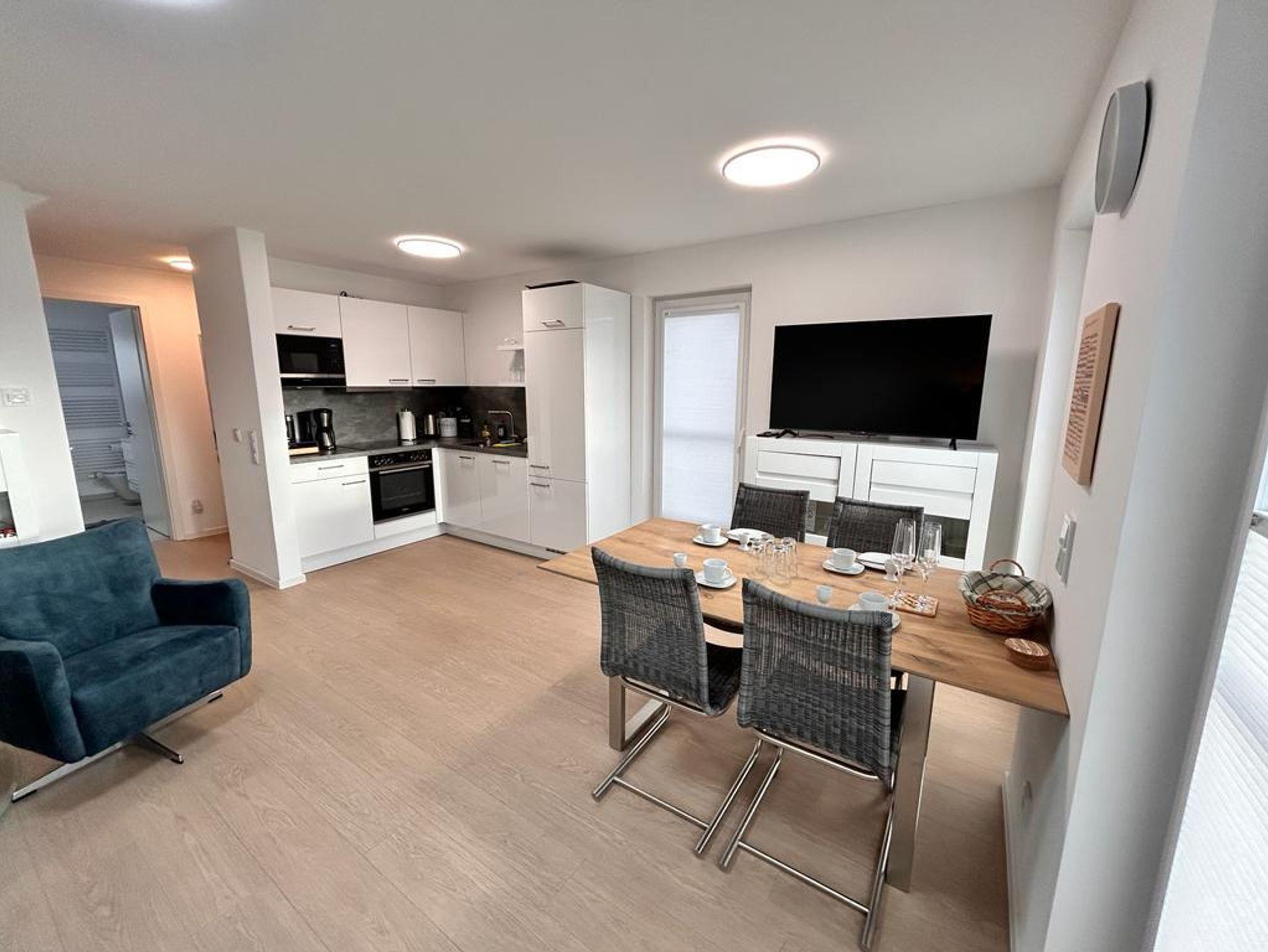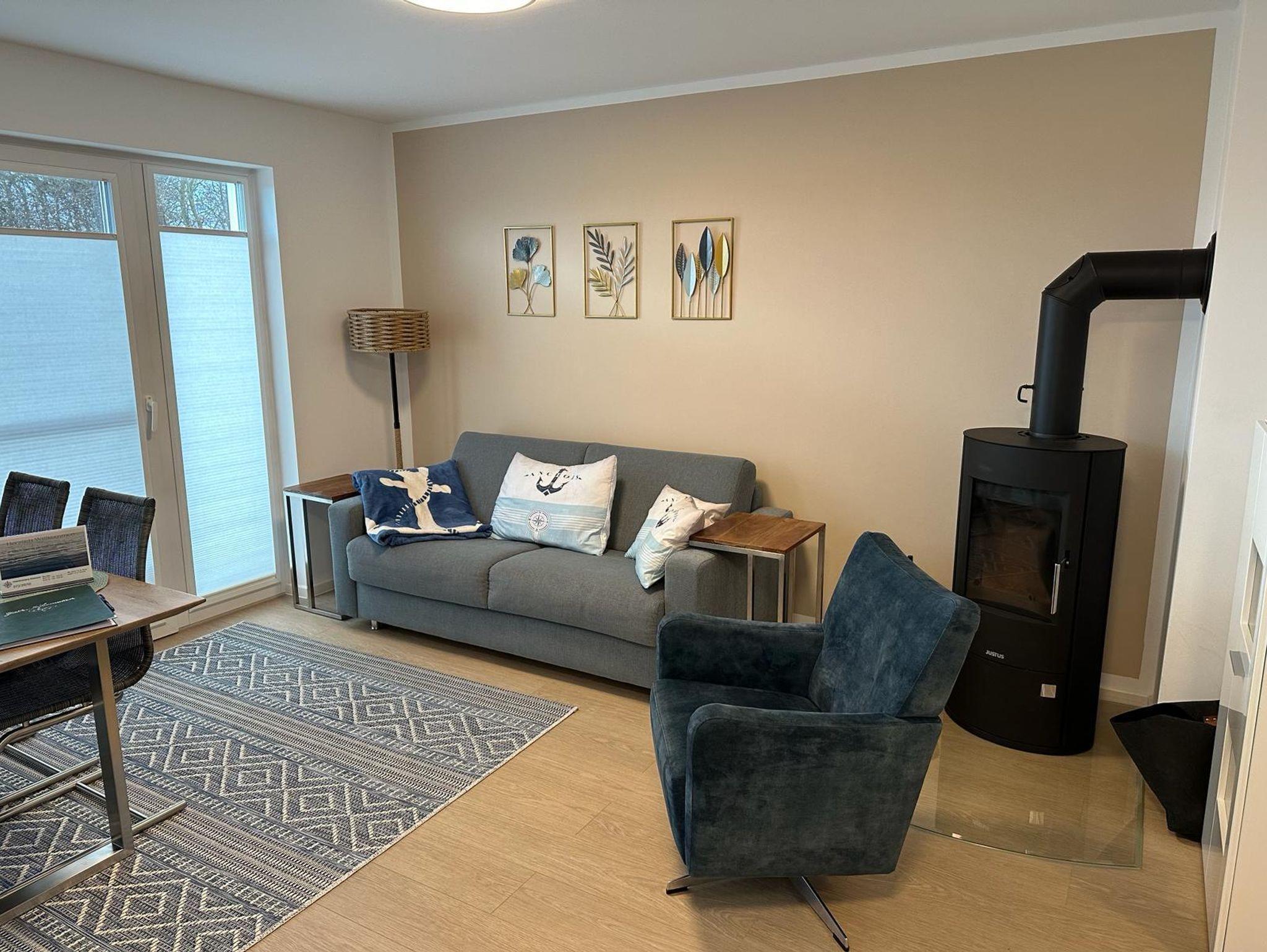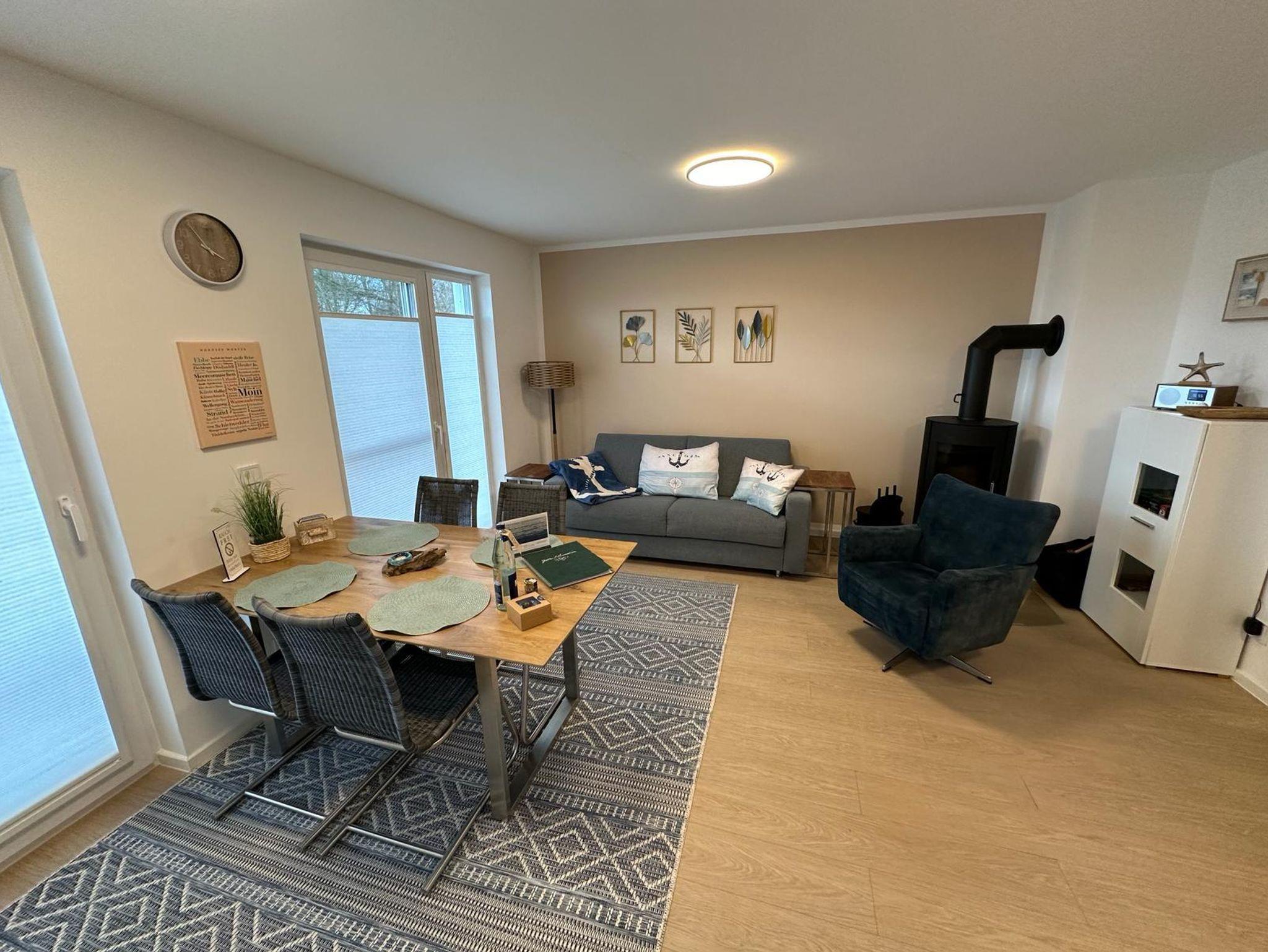 Das Wohnzimmer ist mit einem Esstisch mit 4 Stühlen ausgestattet. An kalten Tagen können Sie es sich vor dem Kamin gemütlich machen. Dafür ist der Drehsessel ideal geeignet. Für den Blick auf den großen Fernseher steht ein bequemes Sofa zur Verfügung. Dieses kann zu einem vollwertigen Schlafsofa mit Federkernmatratze und Lattenrost ausgeklappt werden und bietet eine weitere Schlafmöglichkeit von 140 x 200 cm. Somit könnte hier auch eine weitere Person übernachten. Wir weisen aber darauf hin, dass das Haus originär für 4 Personen ausgelegt ist.