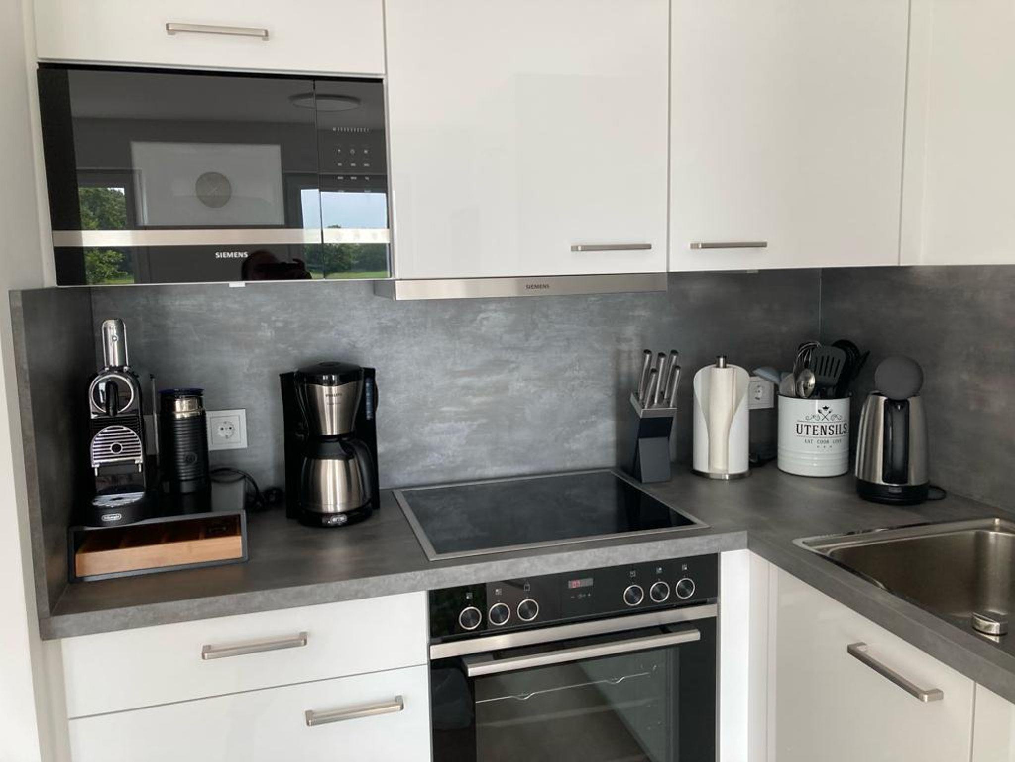 Die Küche ist mit einem Induktionsherd und einem Backofen ausgestattet, einer Filterkaffeemaschine und einer Kapselmaschine (Nespresso - Kapseln,) sowie einem Wasserkocher, Toaster, Eierkocher und einem Mixstab. Eine Geschirrspülmaschine ist in der Küche ebenfalls integriert. Töpfe, Besteck, Geschirr und Gläser etc. sind ausreichend vorhanden.