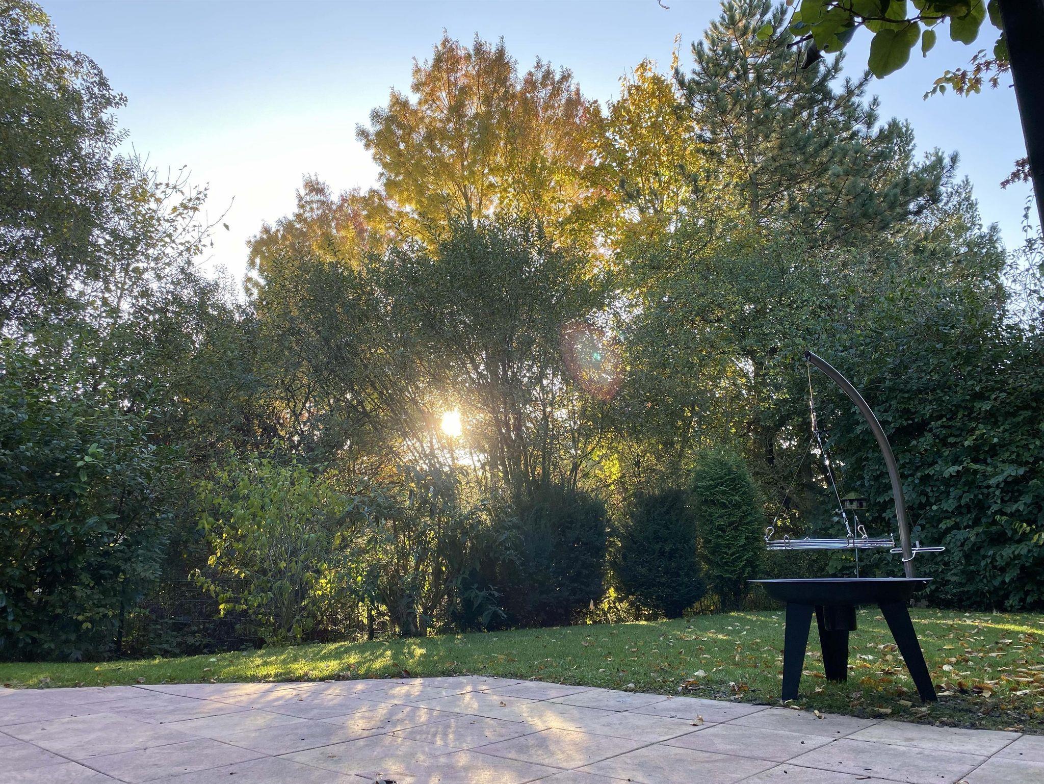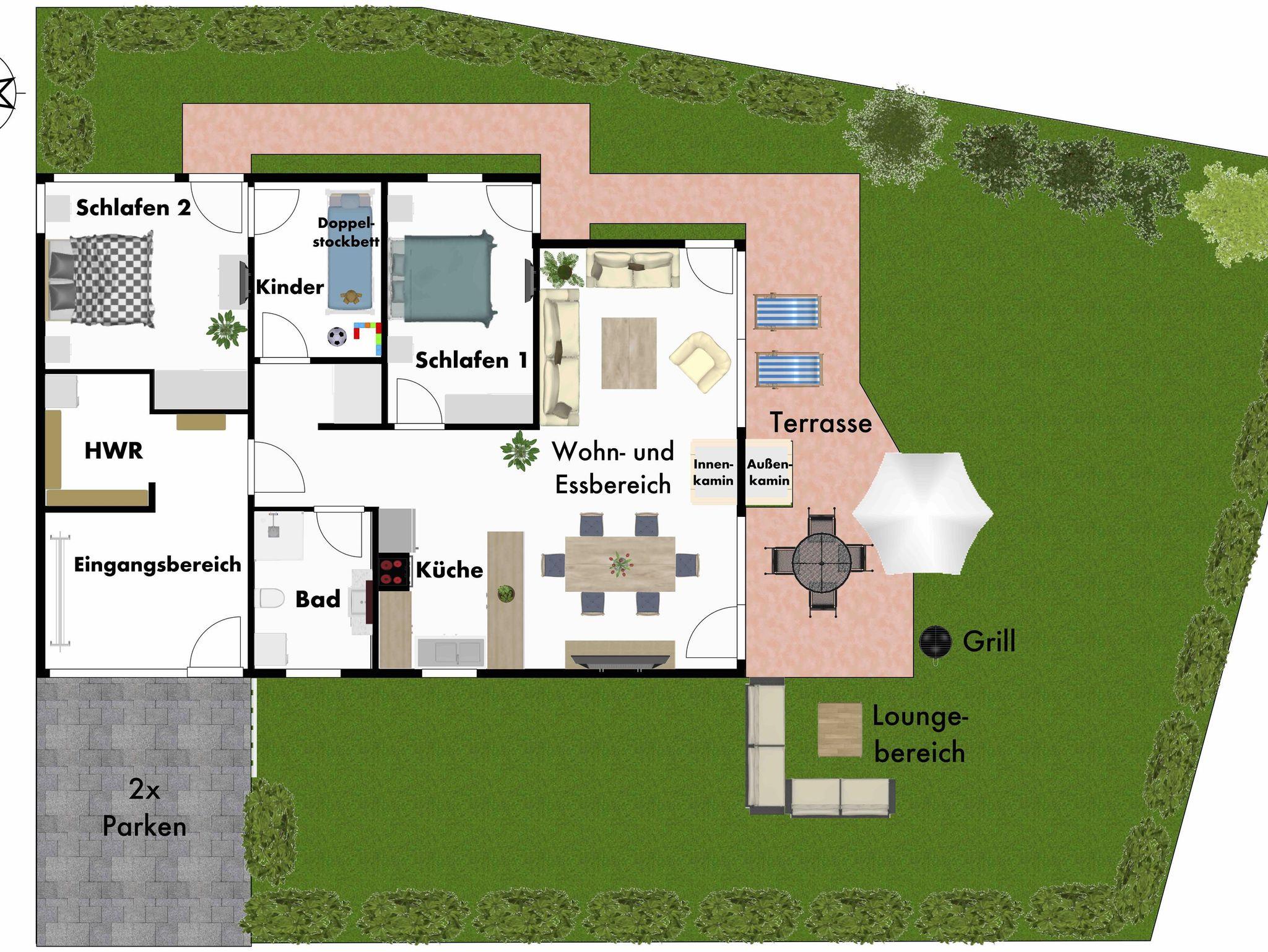 Der großzügige Wohn- und Essbereich mit großem Smart-TV und gemütlicher Sitzecke sowie die voll ausgestattete offene Küche laden zum geselligen Beisammensein ein. Das viele Grün und der Baumbestand im liebevoll angelegten Garten ermöglichen erholsame Momente in absoluter Privatsphäre. Genießen Sie die Sonne im Lounge-Bereich auf der Südterrasse. An kälteren Tagen können Sie sich mit dem Innen- und Außenkamin angenehm einheizen. Eine Grill- und Feuerschale für gemütliche Grillabende ist ebenfalls vorhanden.