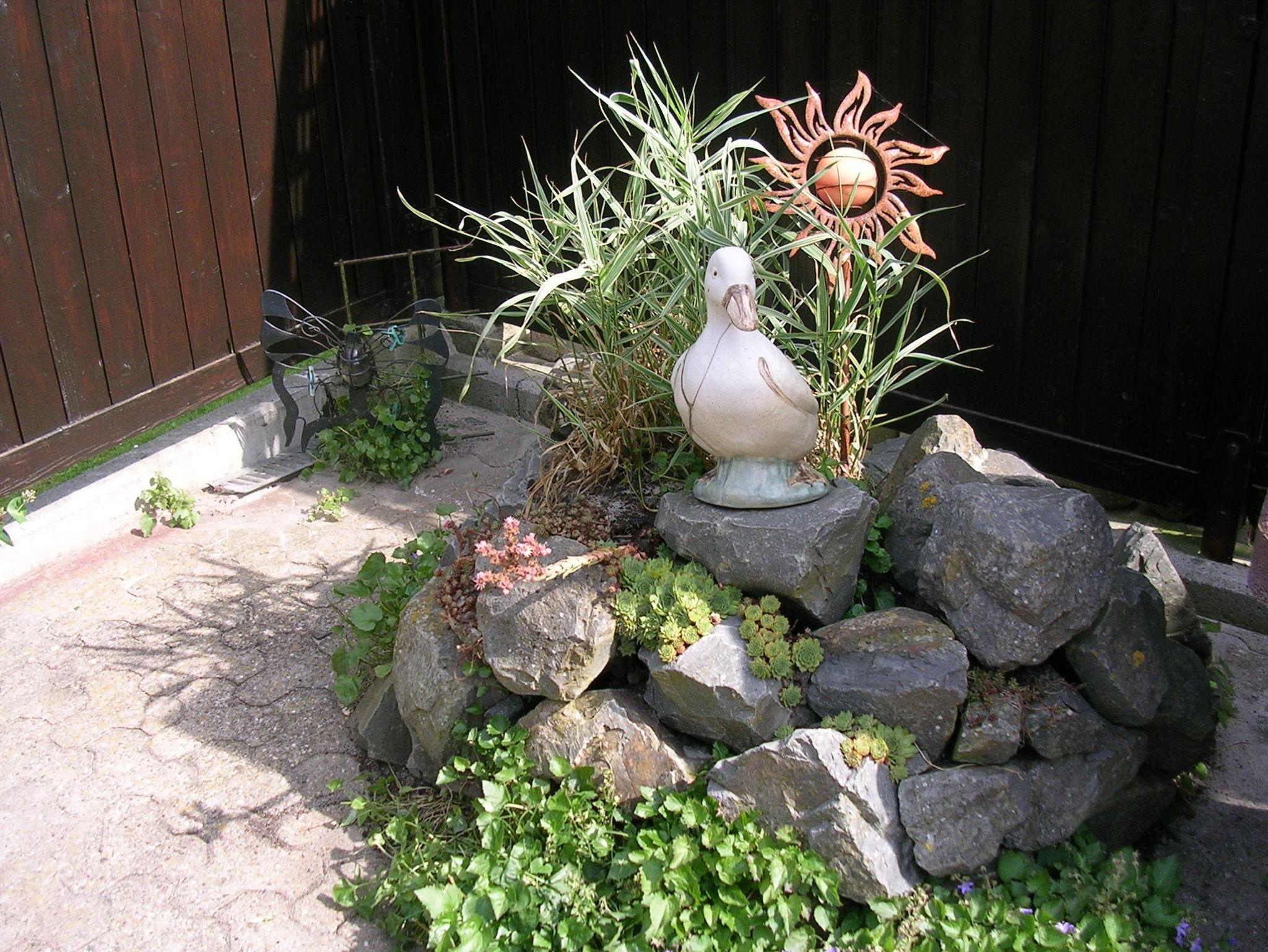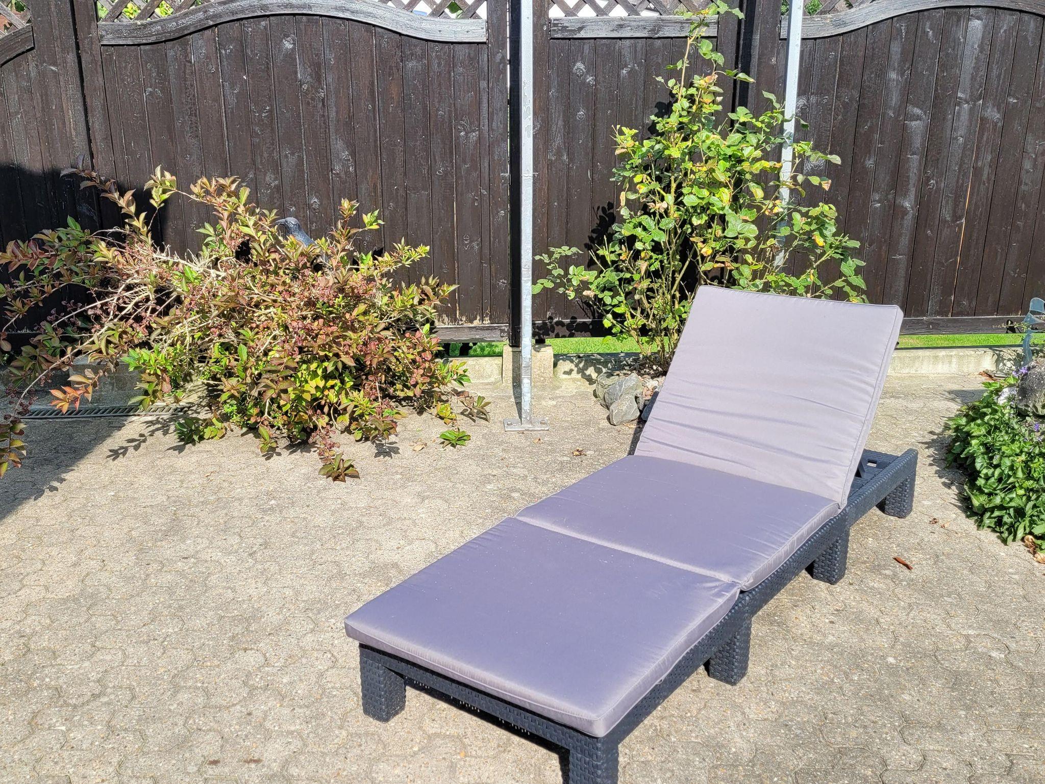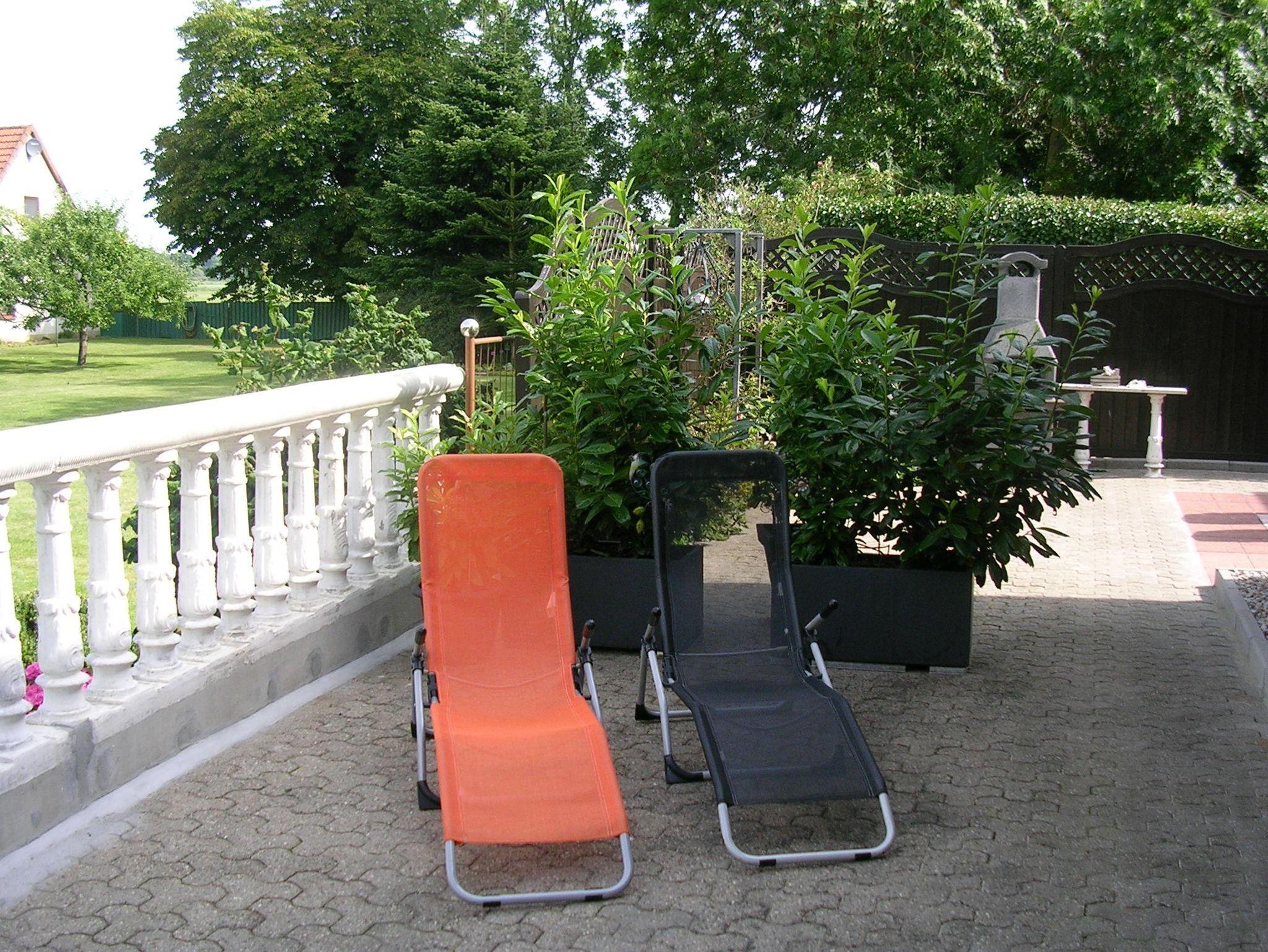 Das Grundstück ist komplett eingezäunt. Eine große Terrasse mit Außengrill, Gartenliegen und Gartenmöbel befindet sich hinter dem Haus und lädt zum Sonnenbaden ein.