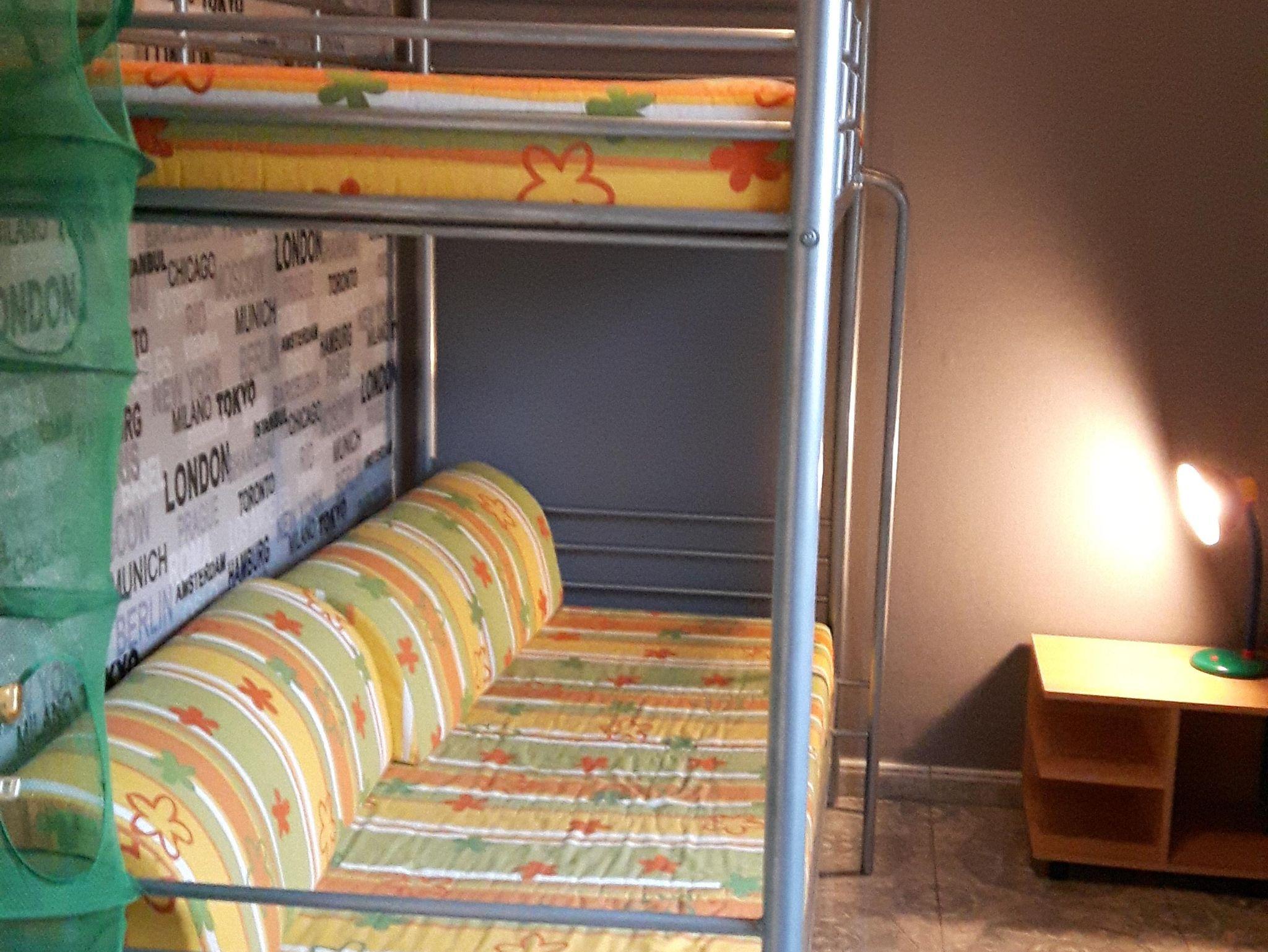 Das Kinderzimmer ist mit einem Etagenbett für 2 Kinder und einem Kleiderschrank sowie einem Nachttisch und Stuhl ausgestattet.