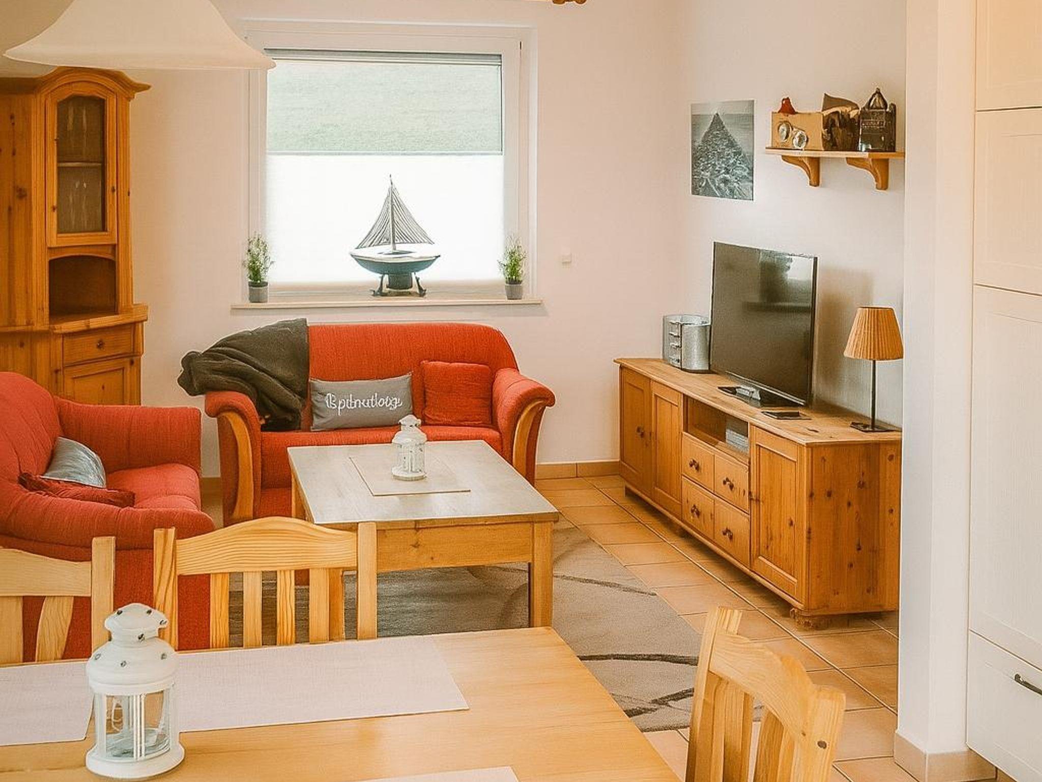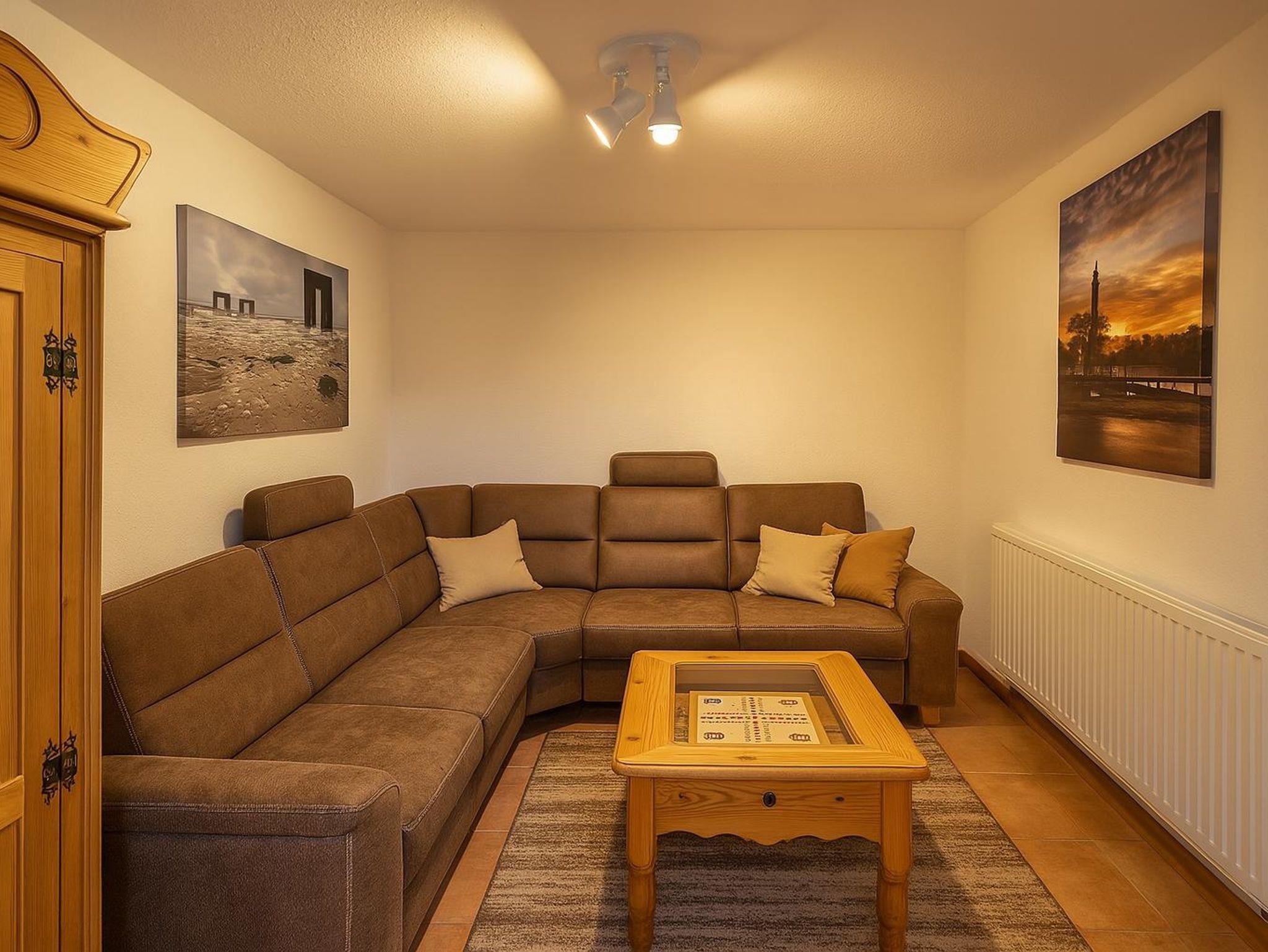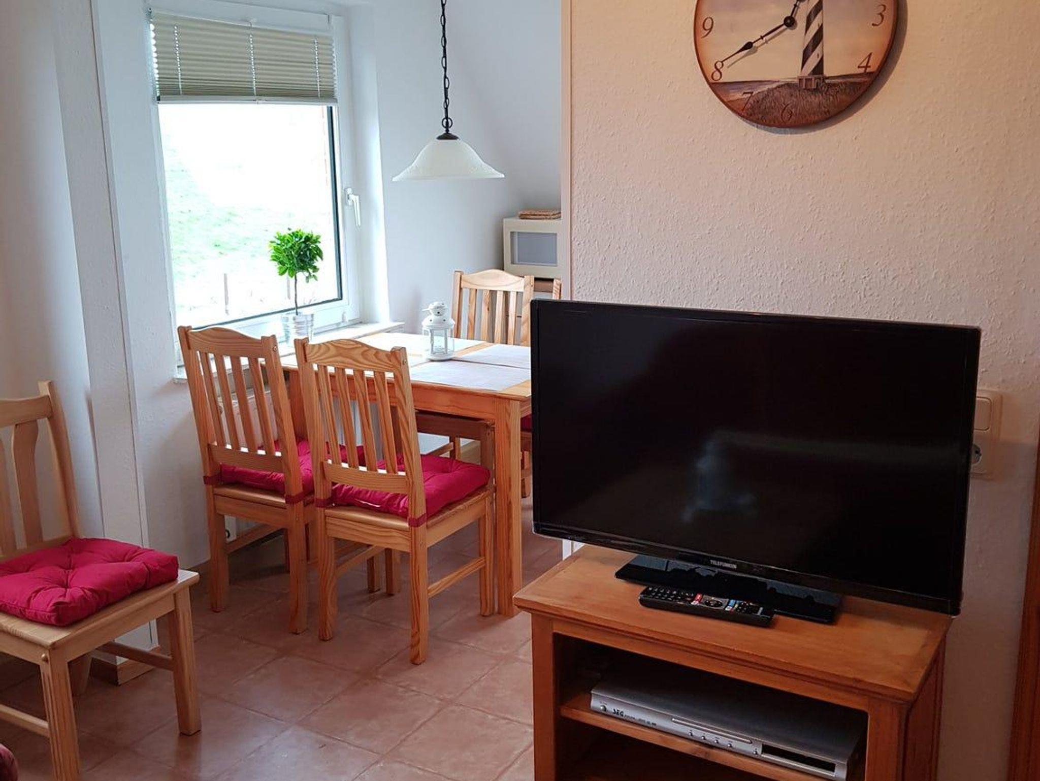 Der Wohnraum ist gemütlich eingerichtet. Durch das Wohnzimmer- und das Küchenfenster hat man direkten Blick auf den Deich. Das Wohnzimmer ist ausgestattet mit Smart-TV, DVD-Player, Stereoanlage mit Kassettendeck und CD-Player. Die gemütlichen Wohnzimmermöbel laden zum Verweilen ein. Weiterhin stehen Ihnen einige Bücher zum Lesen zur Verfügung.