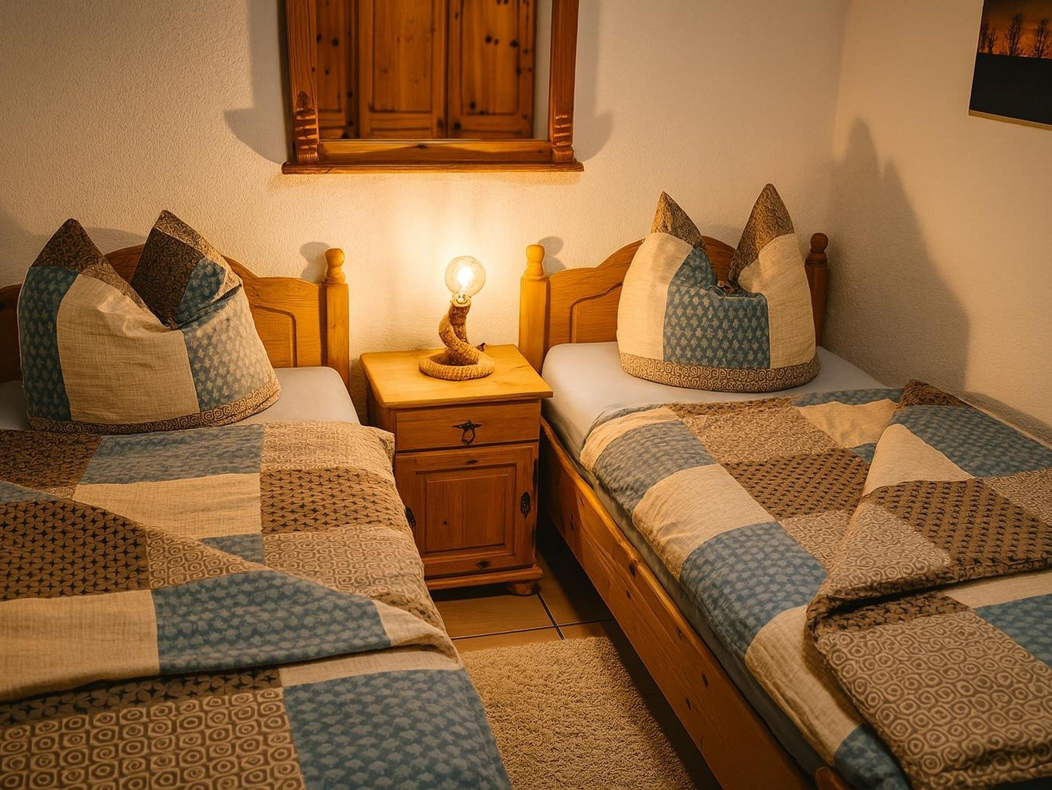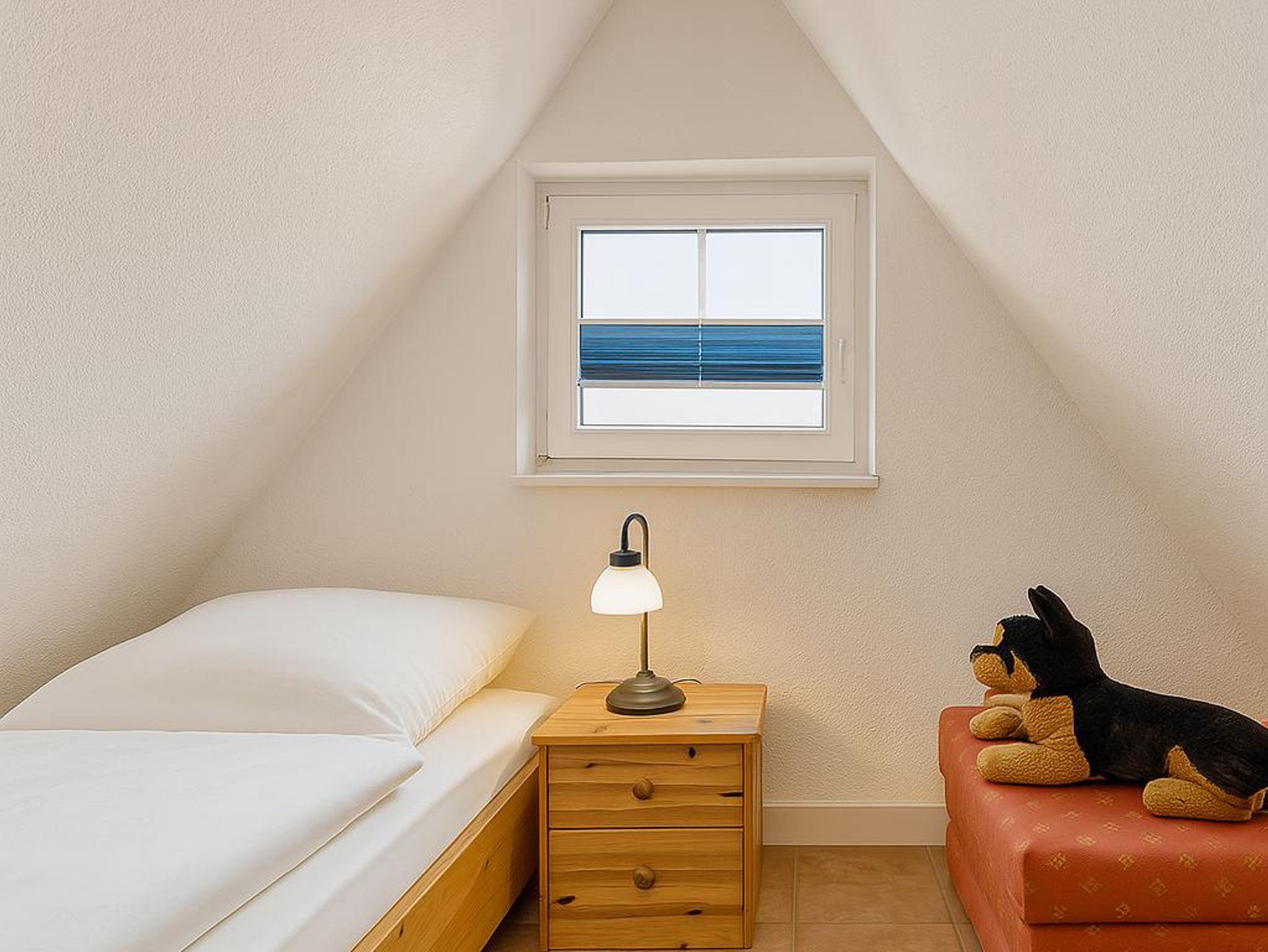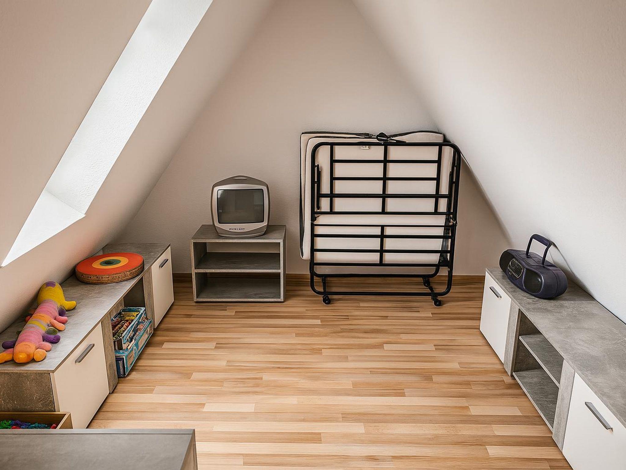 Das Kinderzimmer befindet sich auf dem ausgebauten Spitzboden, welchen man über eine schmale Holztreppe erreicht. Es verfügt über zwei Betten, einen Nachttisch, einen kleinen Kleiderschrank, eine Kommode und eine gemütliche Spielecke mit einigen Spielsachen. Außerdem gibt es einen kleinen Fernseher mit Sat-Receiver. Der Raum ist schön hell und freundliche, dank der eingebauten Fenster. Das Schlafzimmer ist ausgestattet mit zwei Betten, zwei Nachttischen mit Lampe und einem Kleiderschrank.
