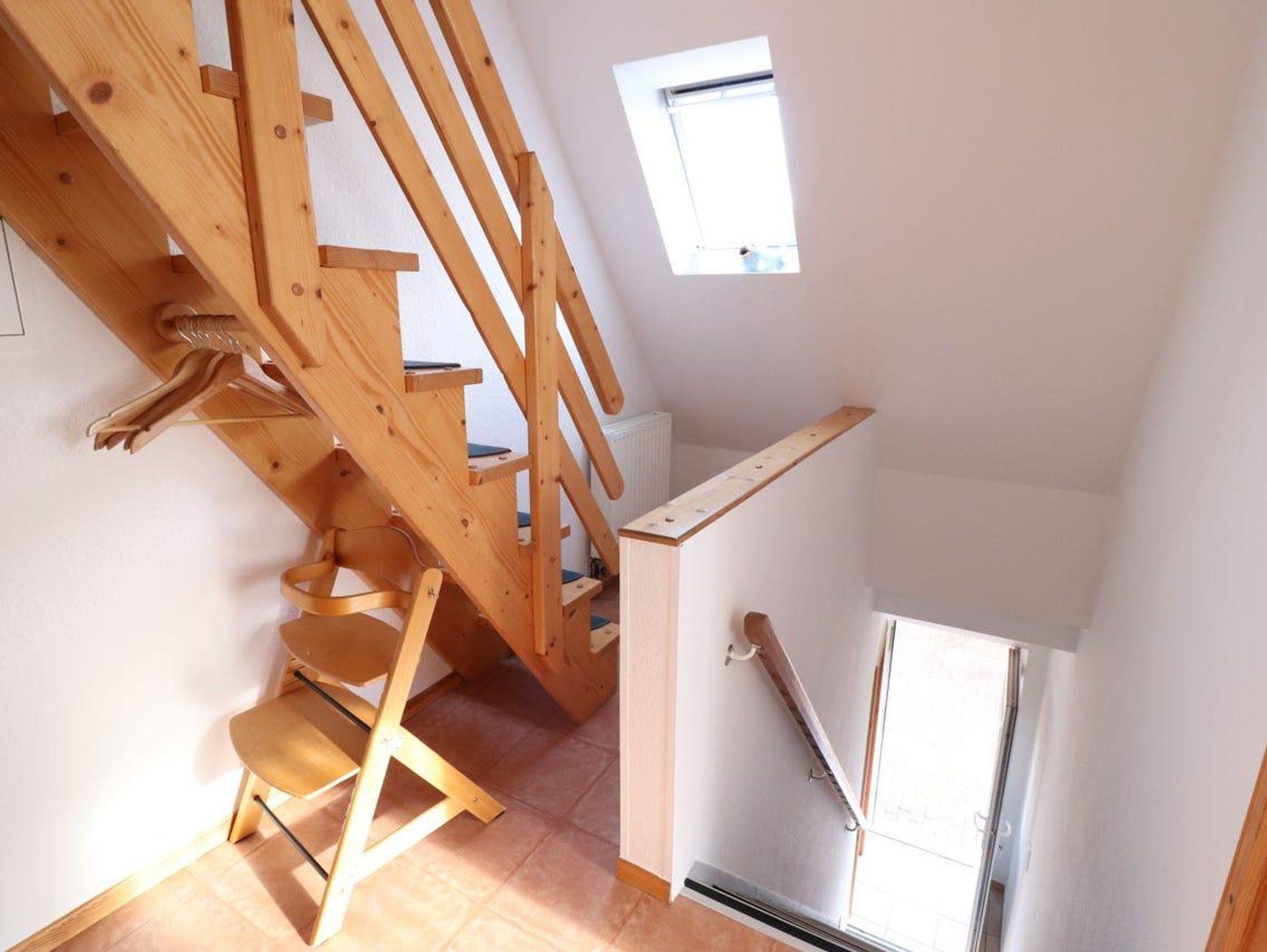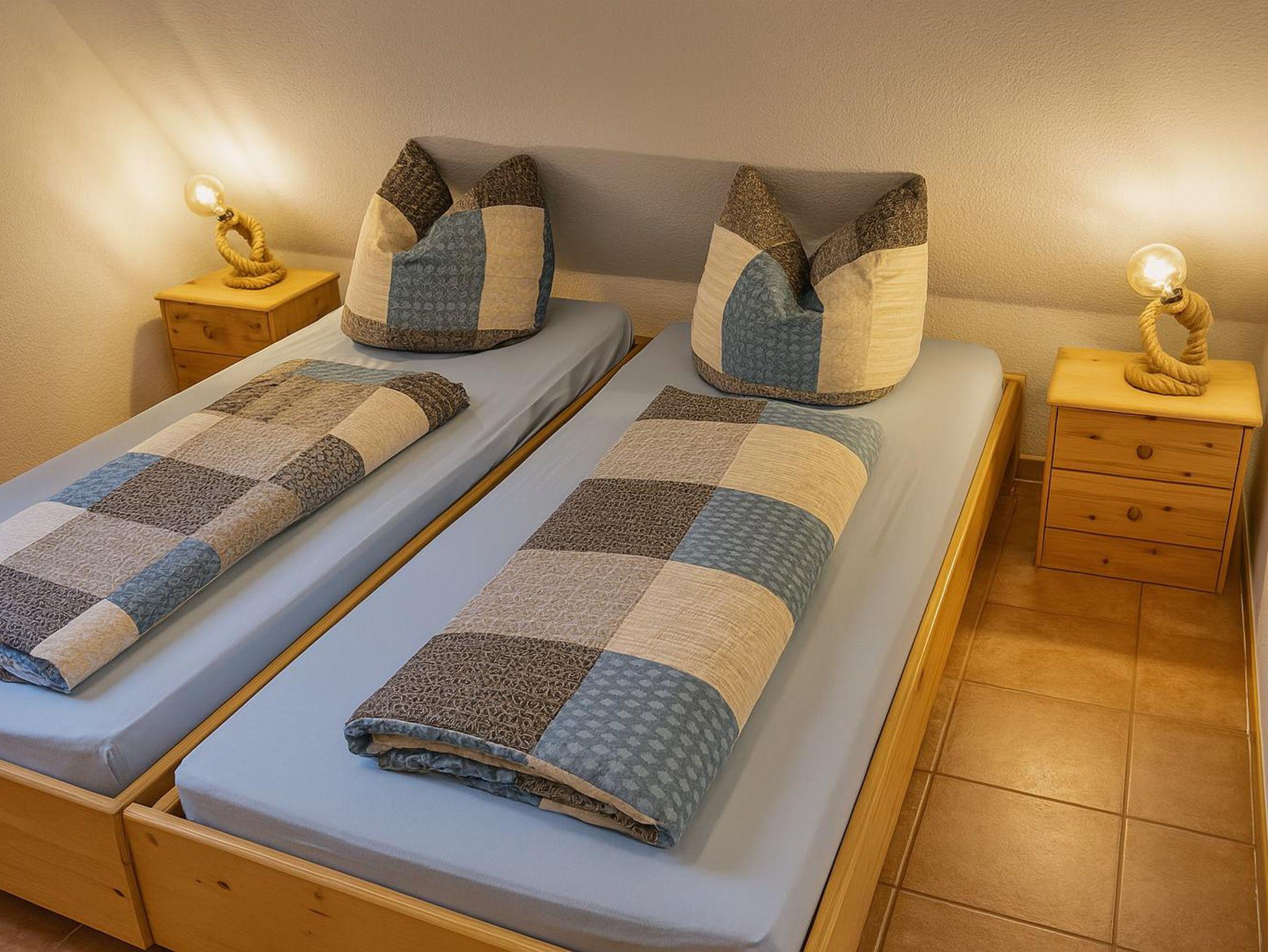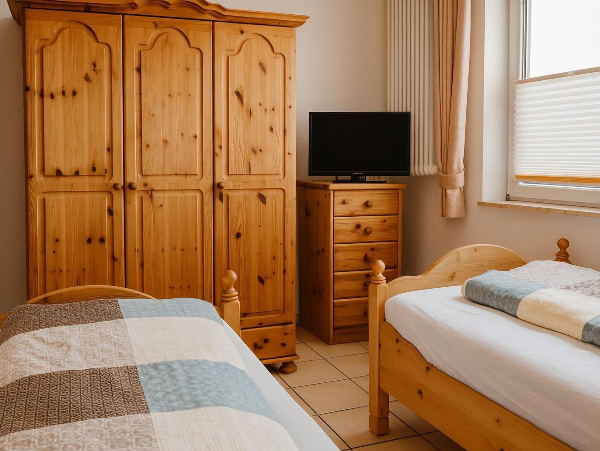 Das Kinderzimmer befindet sich auf dem ausgebauten Spitzboden, welchen man über eine schmale Holztreppe erreicht. Es verfügt über zwei Betten, einen Nachttisch, einen kleinen Kleiderschrank, eine Kommode und eine gemütliche Spielecke mit einigen Spielsachen. Außerdem gibt es einen kleinen Fernseher mit Sat-Receiver. Der Raum ist schön hell und freundliche, dank der eingebauten Fenster. Das Schlafzimmer ist ausgestattet mit zwei Betten, zwei Nachttischen mit Lampe und einem Kleiderschrank.