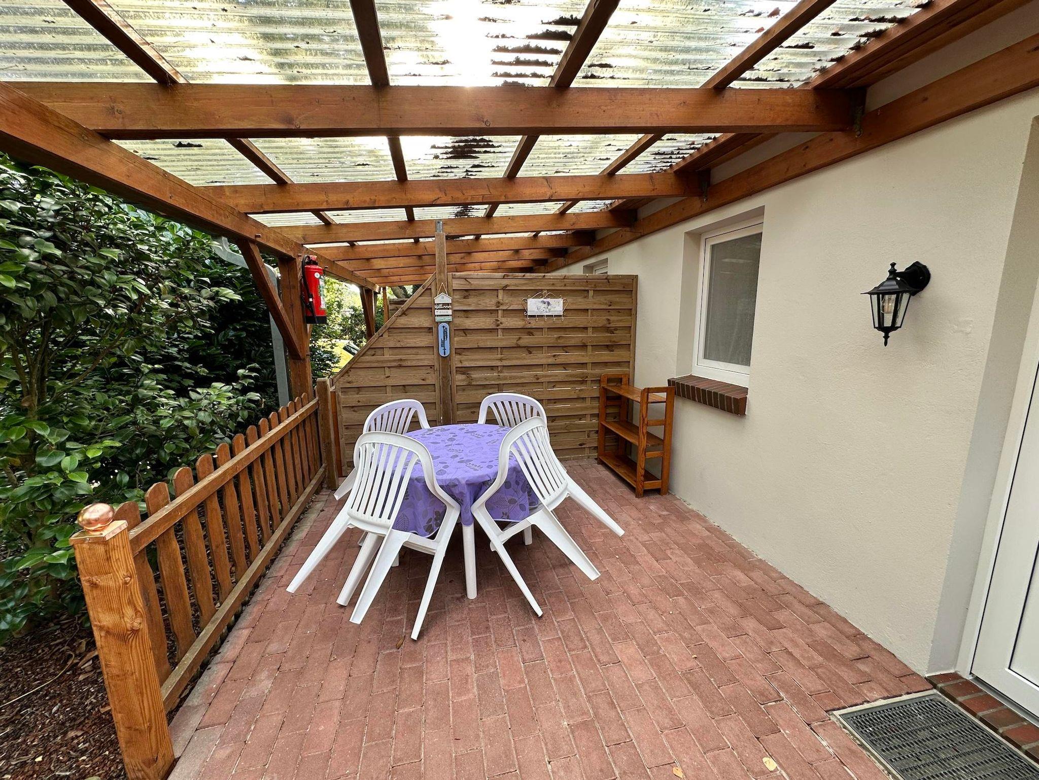 Eigene überdachte Terrasse mit Tisch, Stühlen und Entspannungsliegen, Kindertisch mit Bänken