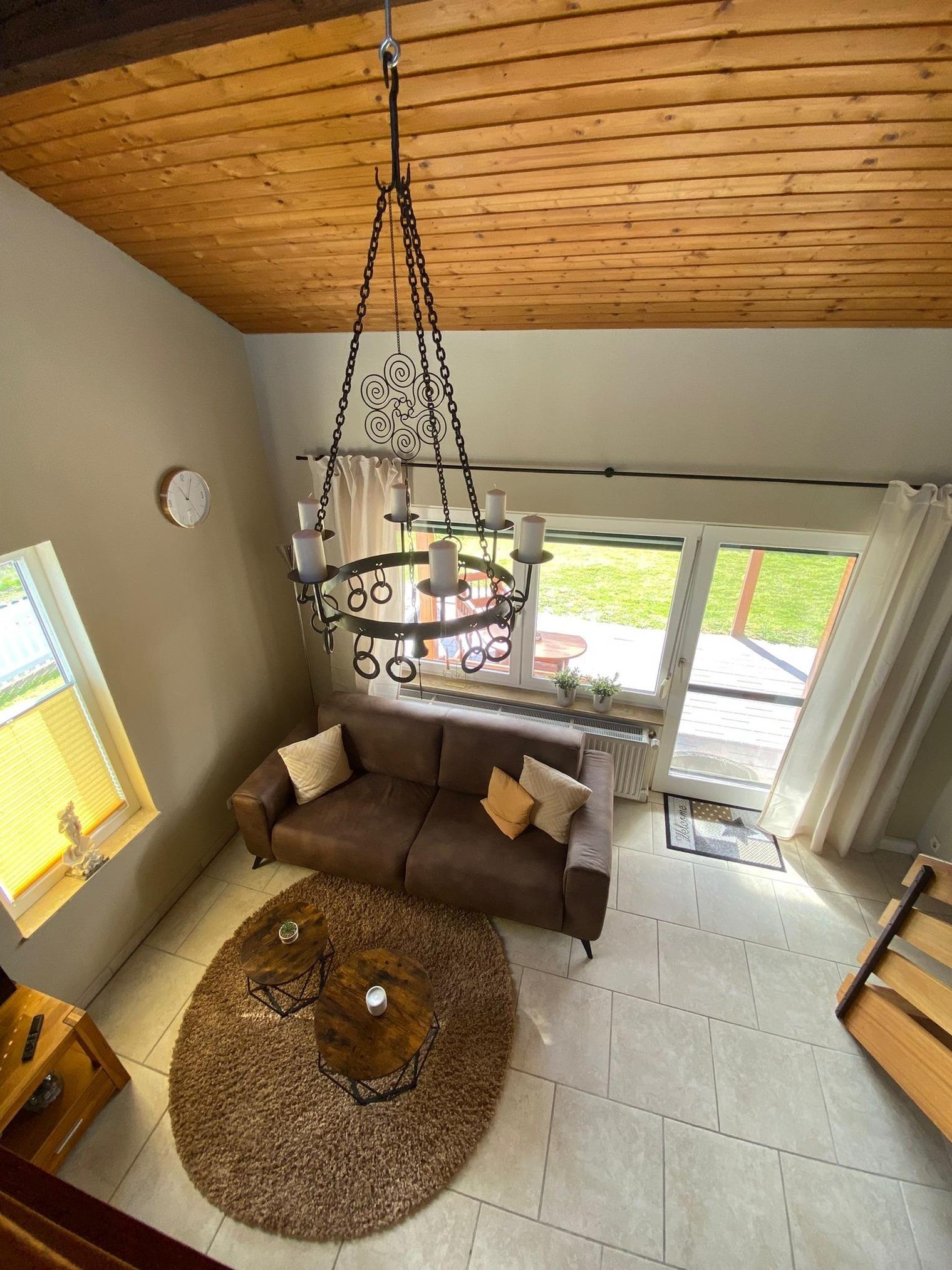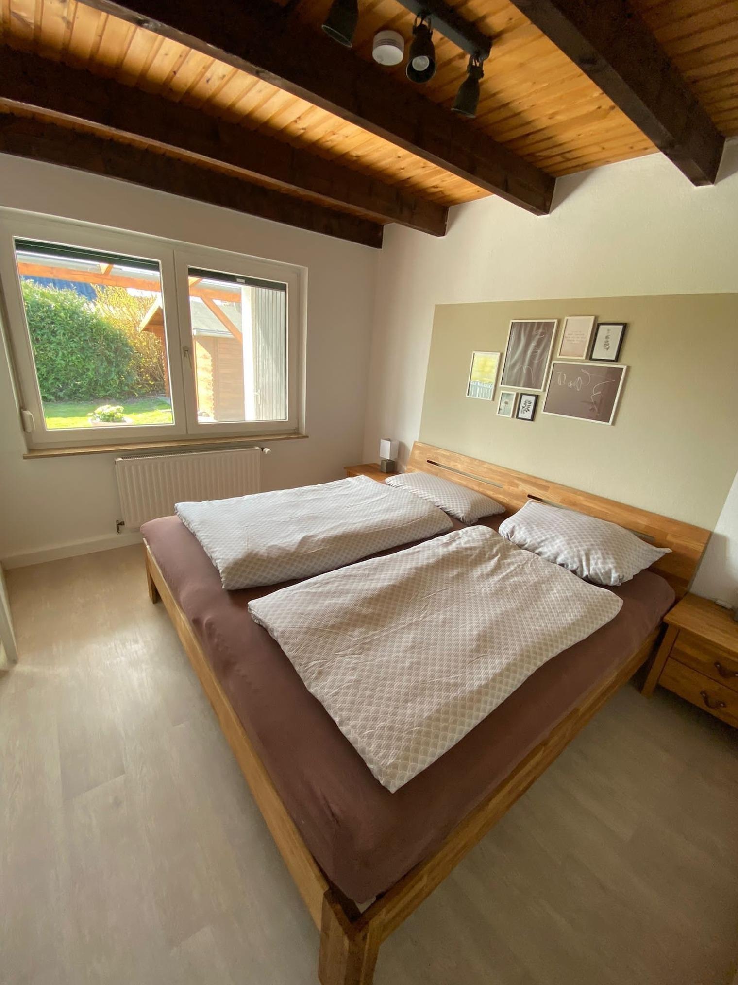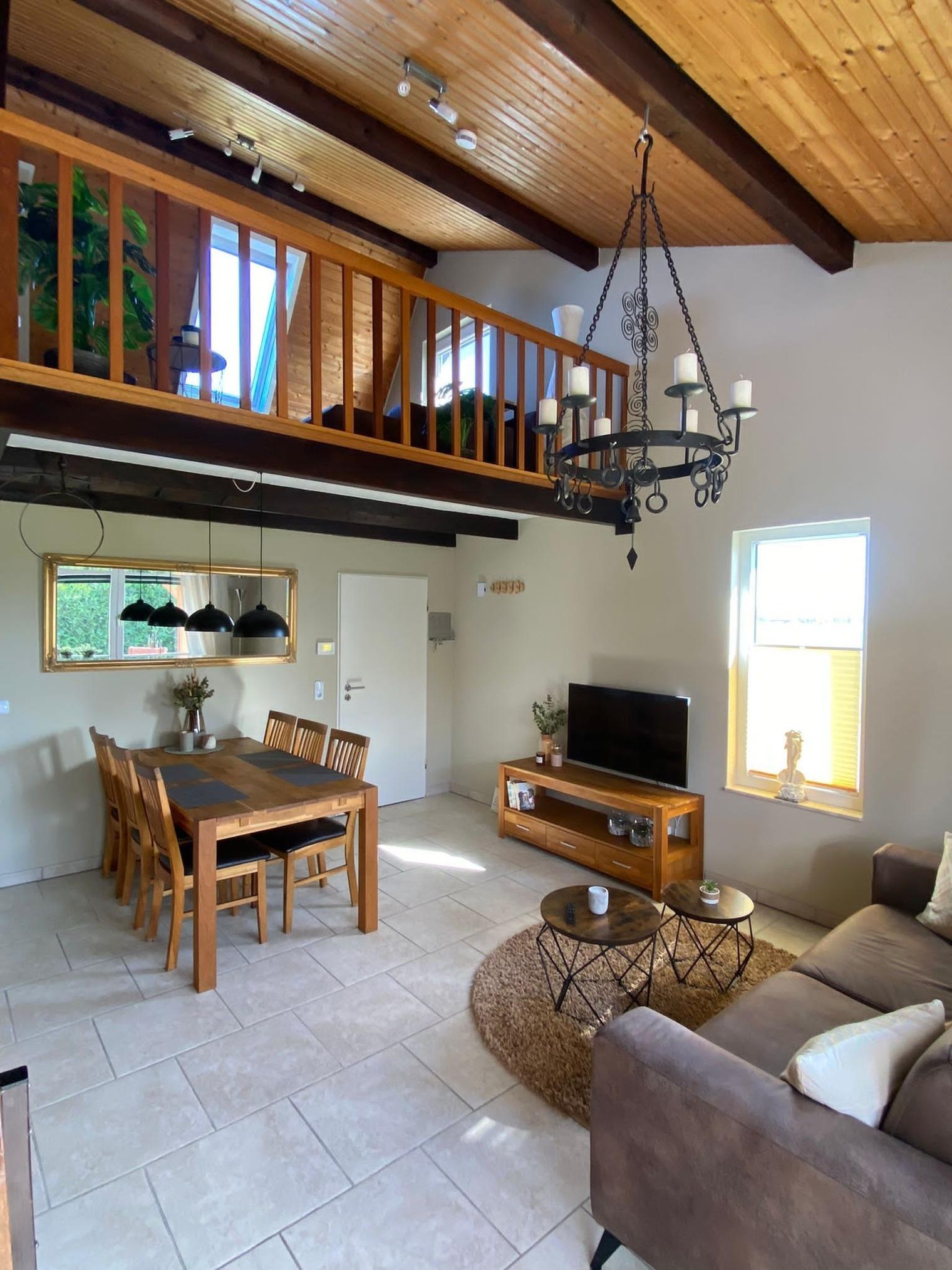 Wir bieten Ihnen auf ca. 80 m² ein Wohn-/Esszimmer (Sofa, Esstisch mit 6 Stühlen), die Empore ist mit einem Schlafsofa (1,25 m x 2,35 m) ausgestattet sowie 2 Schlafzimmer, eins im Erdgeschoss ( Doppelbett 2 m x 2 m) und eins im Obergeschoss (1,40 m x 2 m). Die Küche ist komplett ausgestattet. Es fehlt an nichts, selbstverständlich ist eine Kühl-/Gefrierkombination, ein Ceranfeld, ein Backofen sowie eine Spülmaschine vorhanden. Das Badezimmer umfasst folgende Ausstattung: Eine Dusche, ein Waschbecken und ein WC. Ein zweites WC befindet sich auf der Empore. Im Badezimmer befindet sich eine Waschmaschine mit integriertem Trockner. Ein Abstellraum ist vorhanden. Es gibt den SAT-Empfang für 3 Fernseher. Die 350 m² Grundstücksfläche gehören zu Ihrem Feriendomizil dazu. Das Gartenhaus inklusive aller vorhandenen Gartenmöbel ist nur für Ihre alleinige Nutzung vorgesehen; genießen Sie die Ruhe auf einer Terrasse mit Überdachung. Der Parkplatz befindet sich direkt am Ferienhaus (Carport). Wäschepakete können dazu gebucht werden. Das Mitbringen von Haustieren ist nicht gestattet.