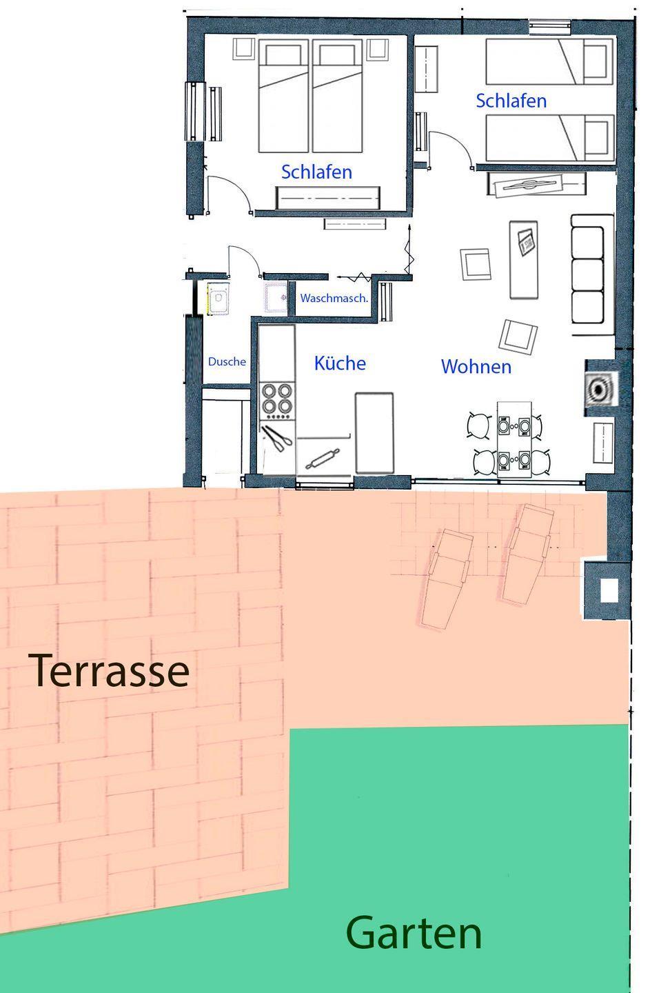 Der ebenerdige Bungalow ist für bis zu 4 Personen buchbar. Ein Hund ist auf Anfrage erlaubt.