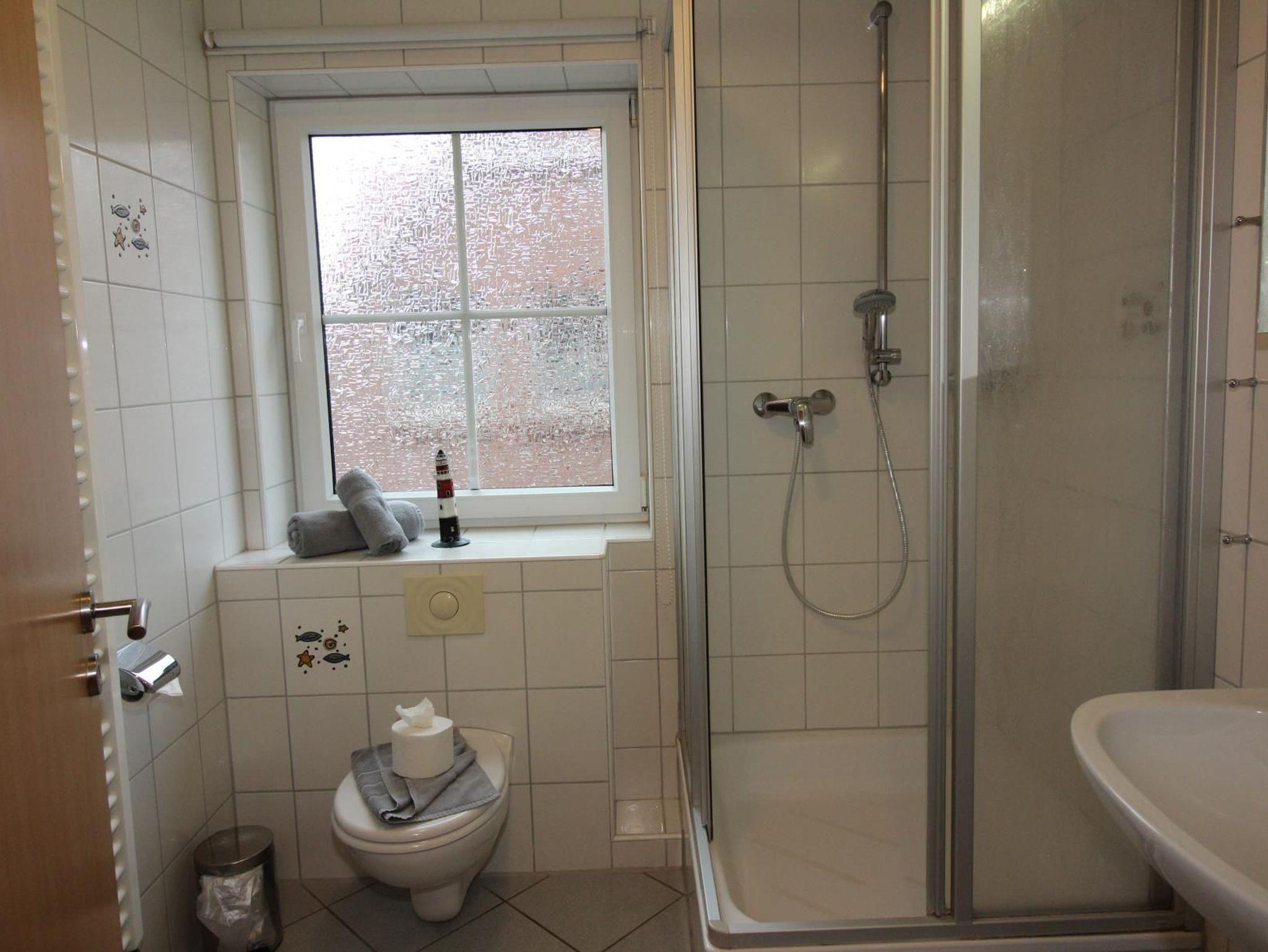 Das Bad mit Dusche, Handwaschbecken, WC, WC-Aufsatz, Trittschemel, Kindertoilettenbrille, Handtuchheizkörper und Föhn befindet sich, begehbar vom Flur, zwischen den beiden Zimmern.